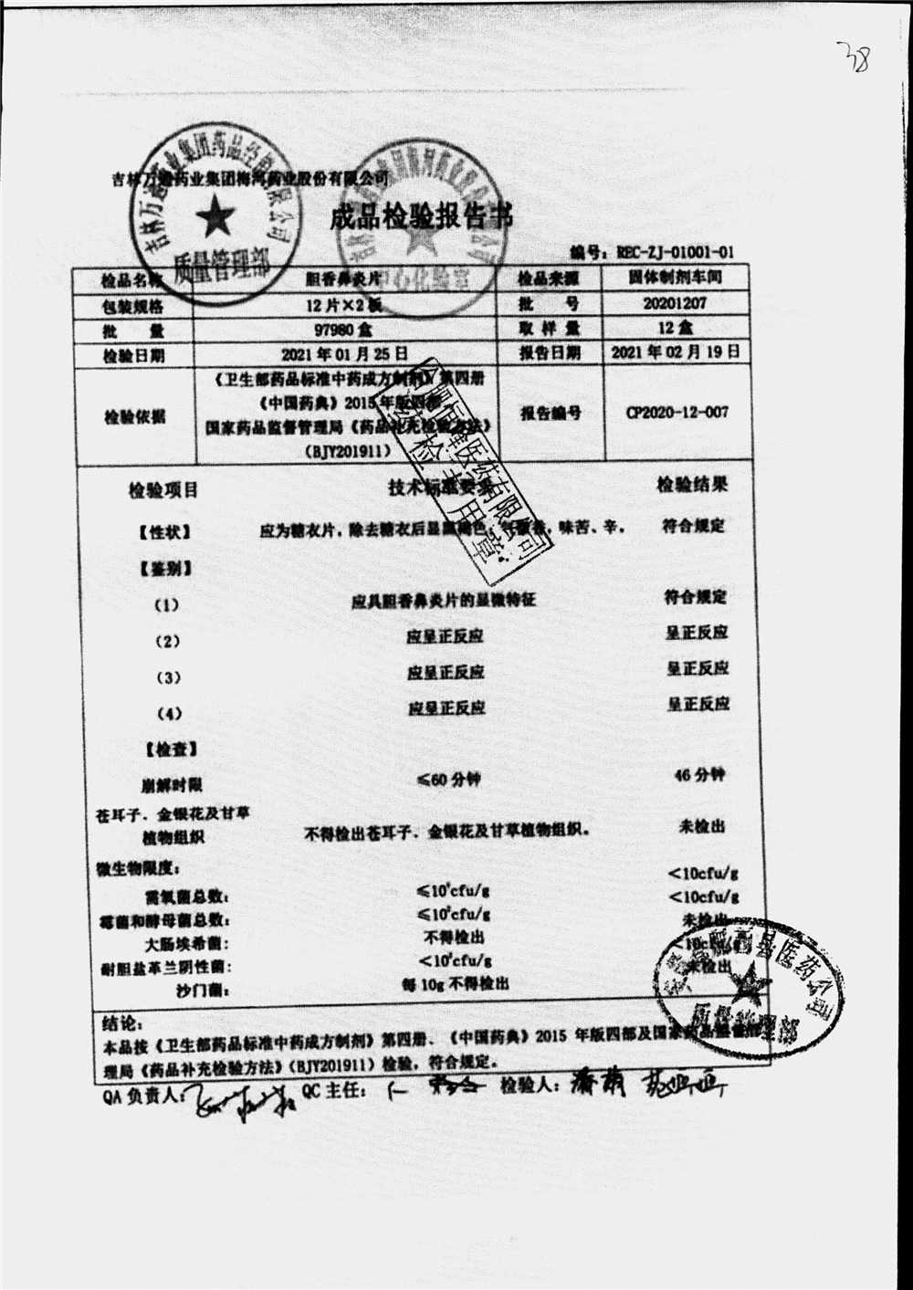 | 胆香鼻炎片 | 12*2 | 20210201 | 查看详情 |