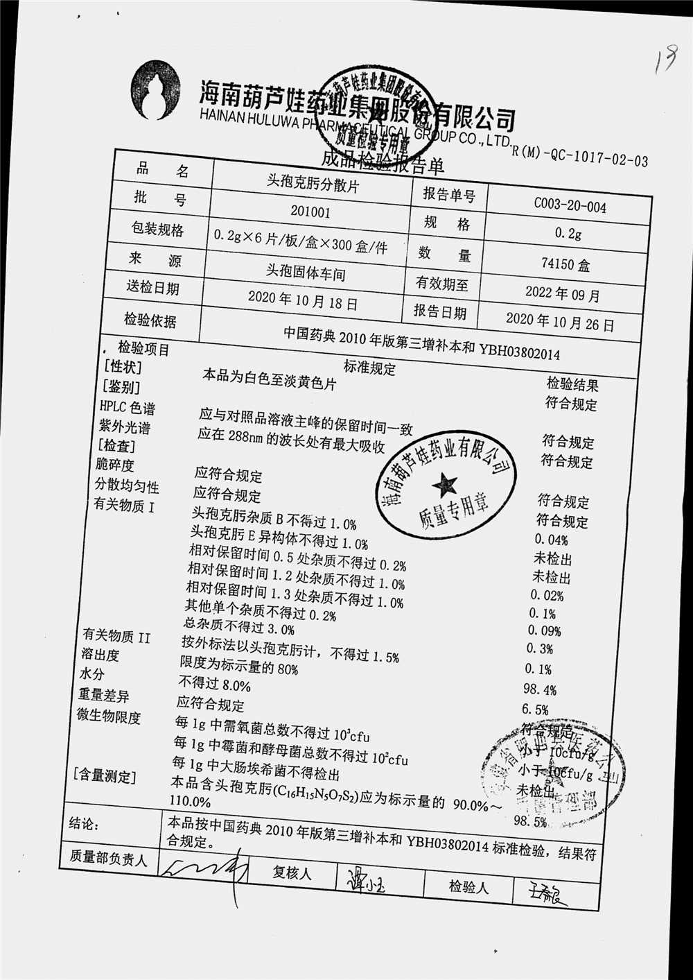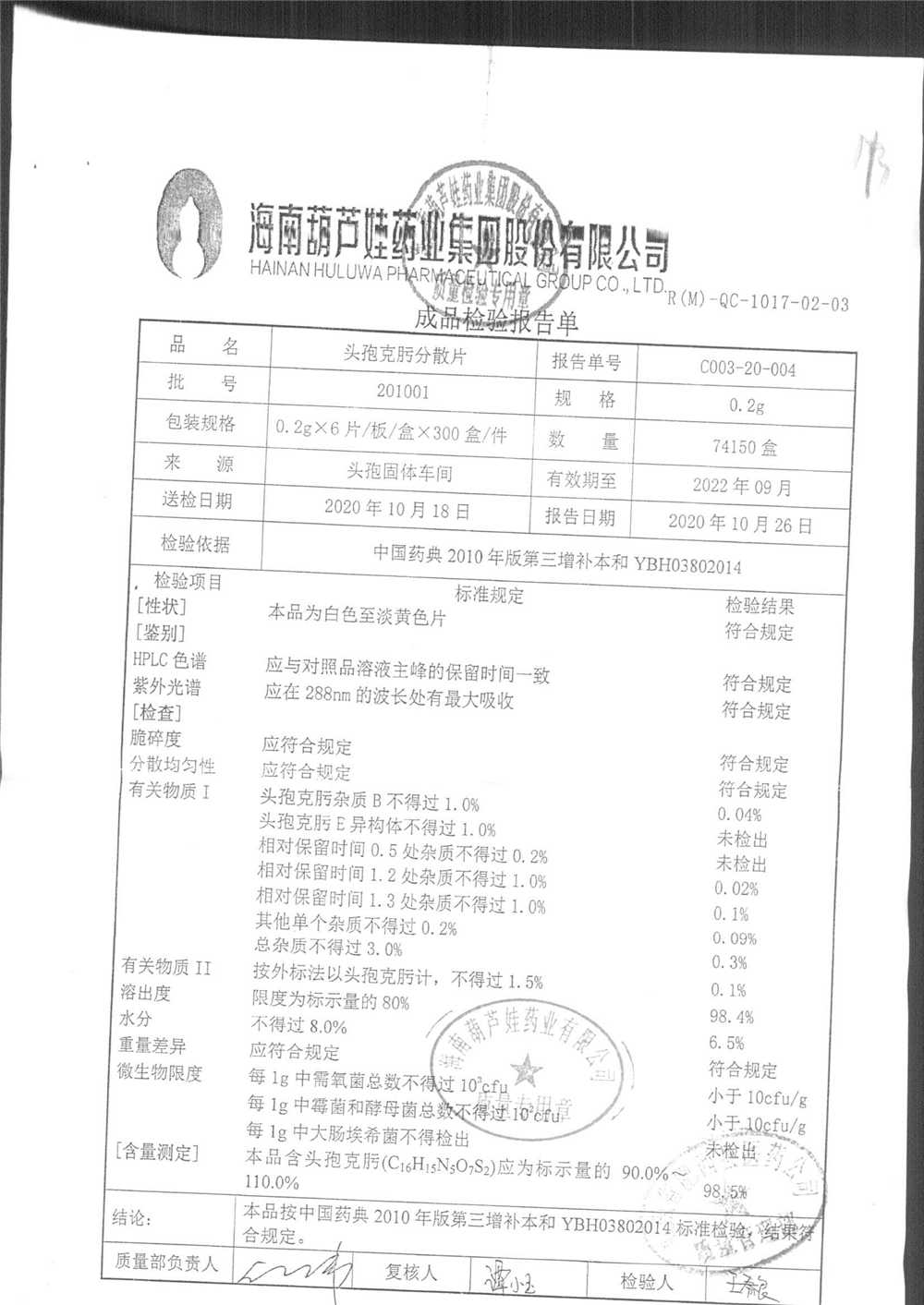 | 头孢克肟分散片 | 0.2g*6片 | 201001 | 查看详情 |