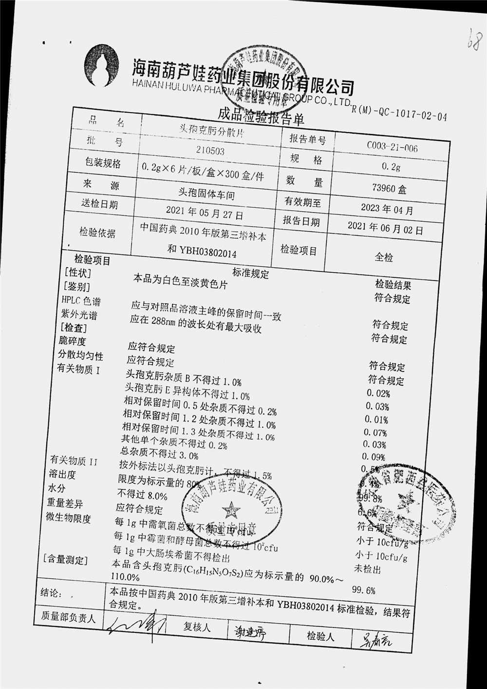 | 头孢克肟分散片 | 0.2g*6片 | 210503 | 查看详情 |