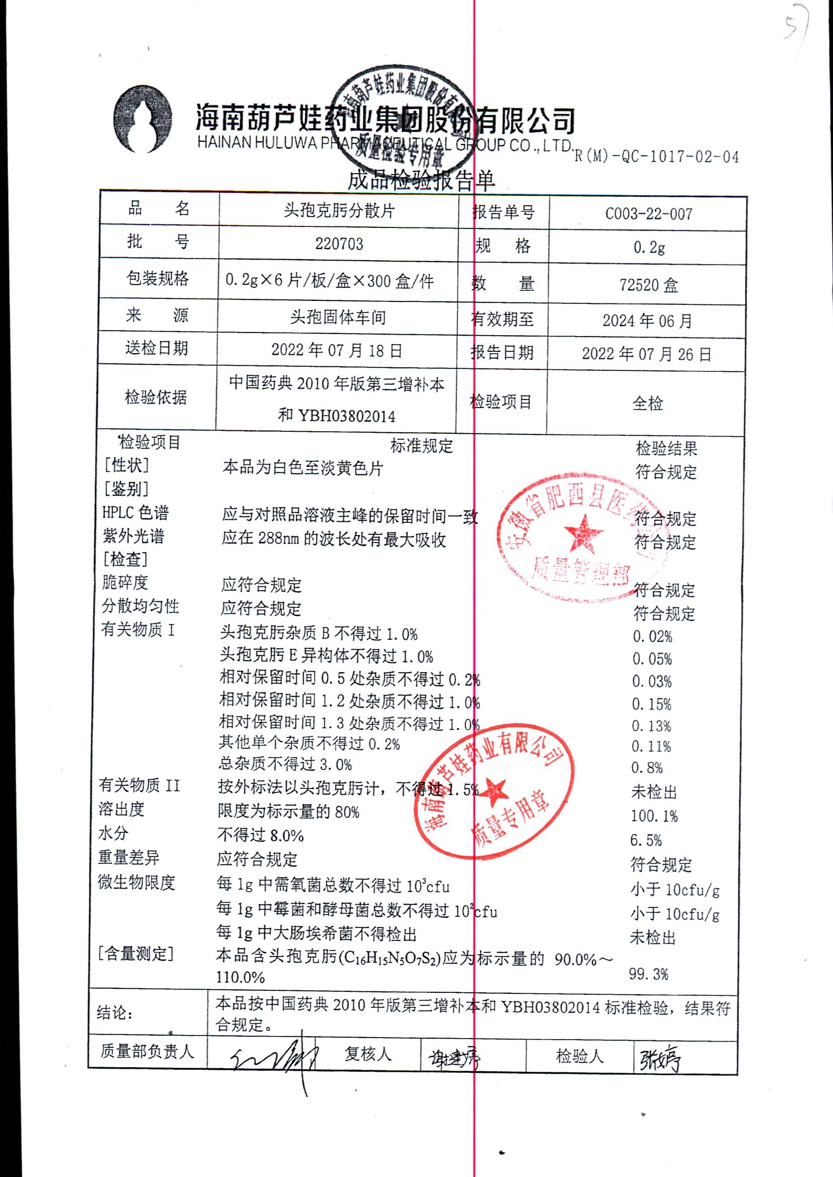 | 头孢克肟分散片 | 0.2g*6片 | 220703 | 查看详情 |
