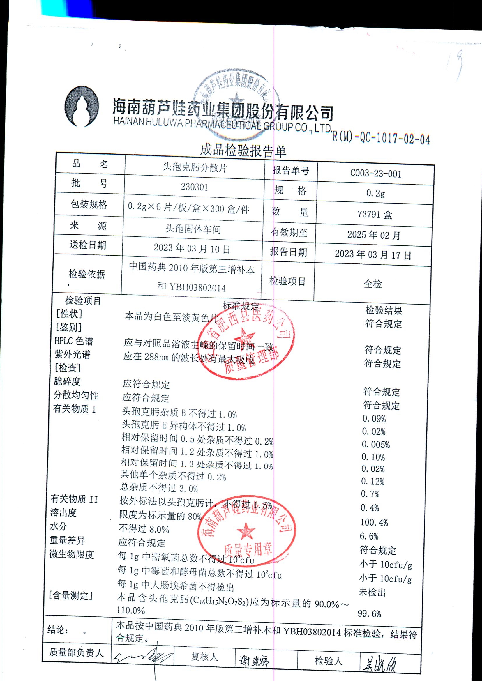 | 头孢克肟分散片 | 0.2g*6片 | 230301 | 查看详情 |