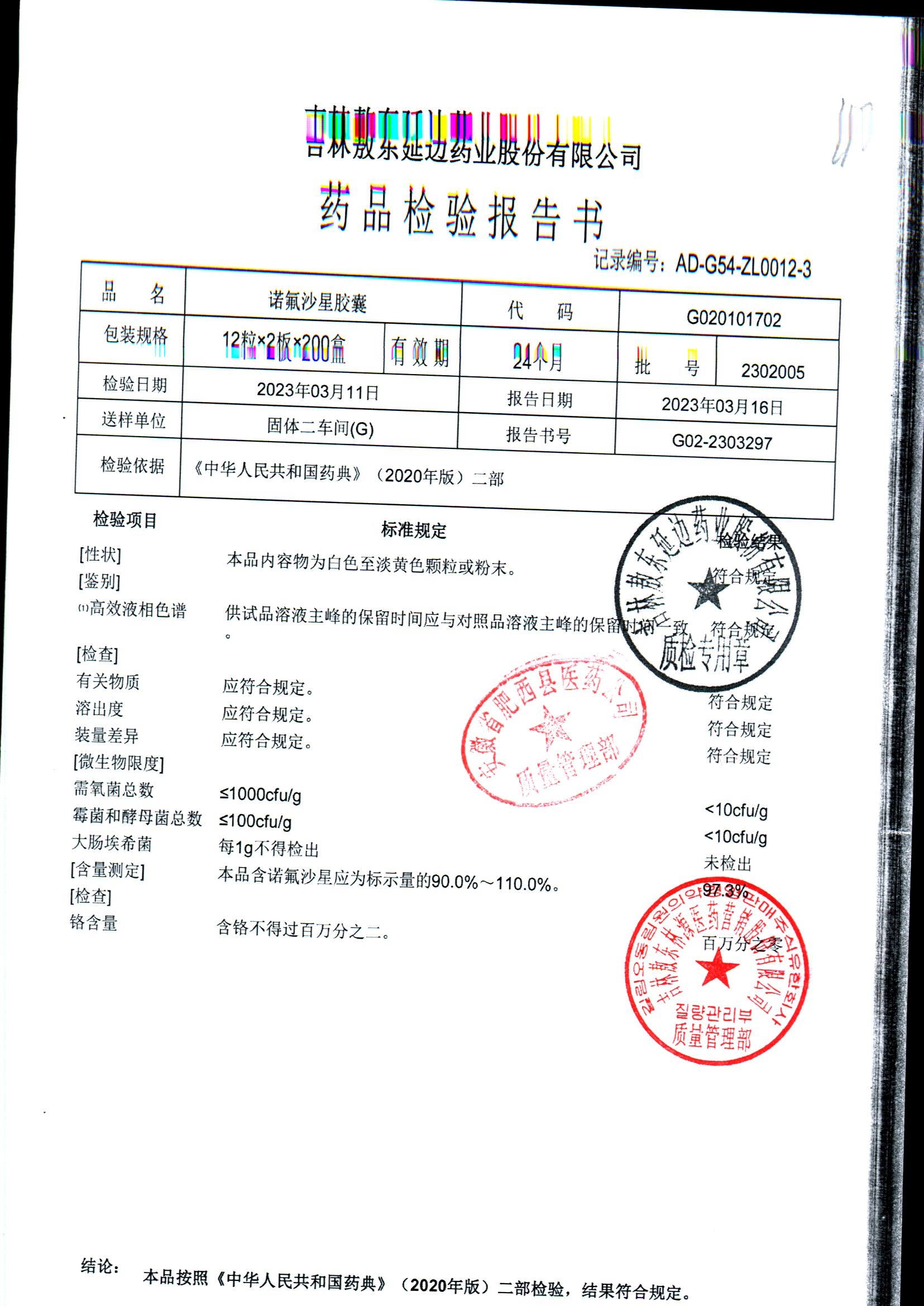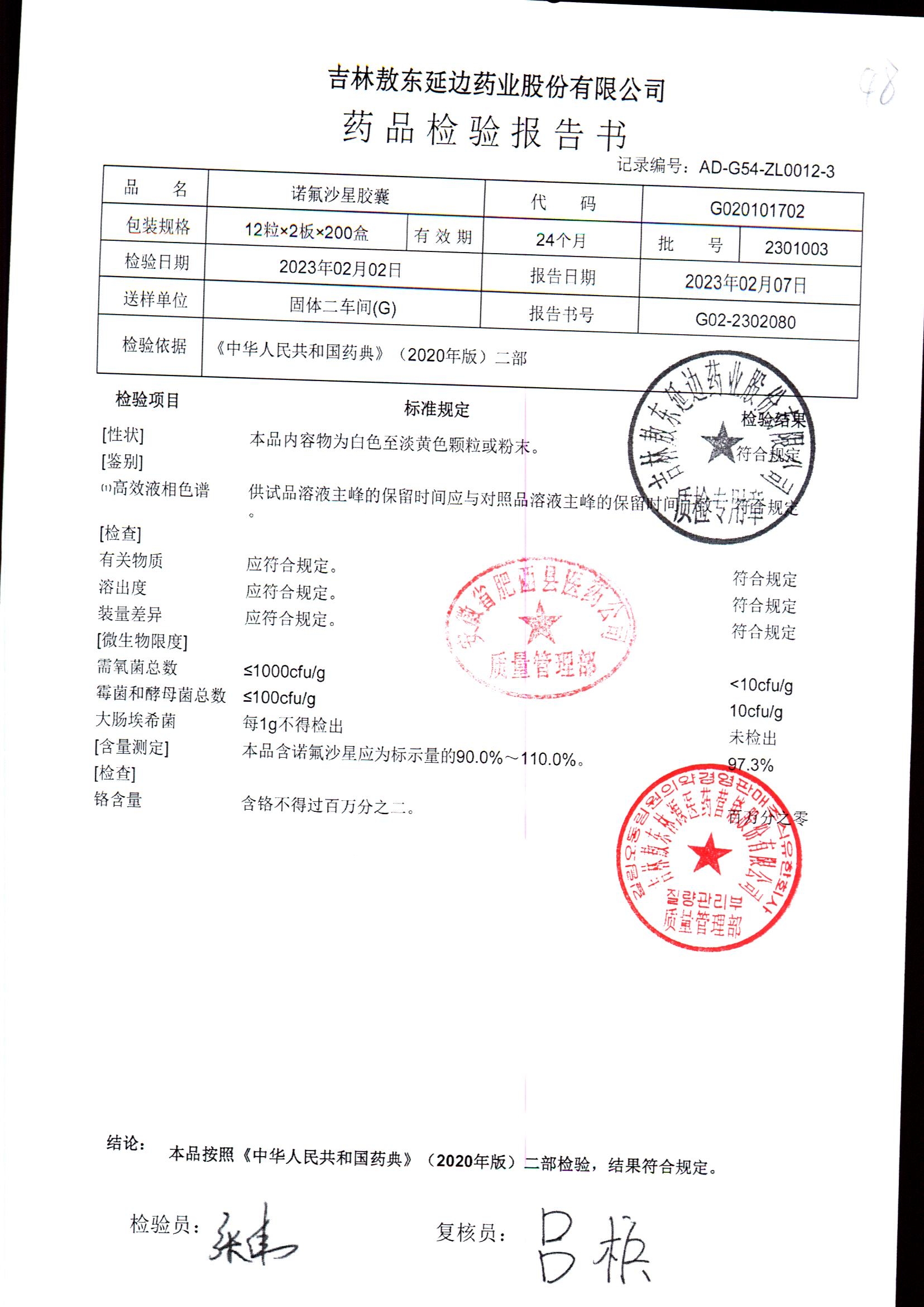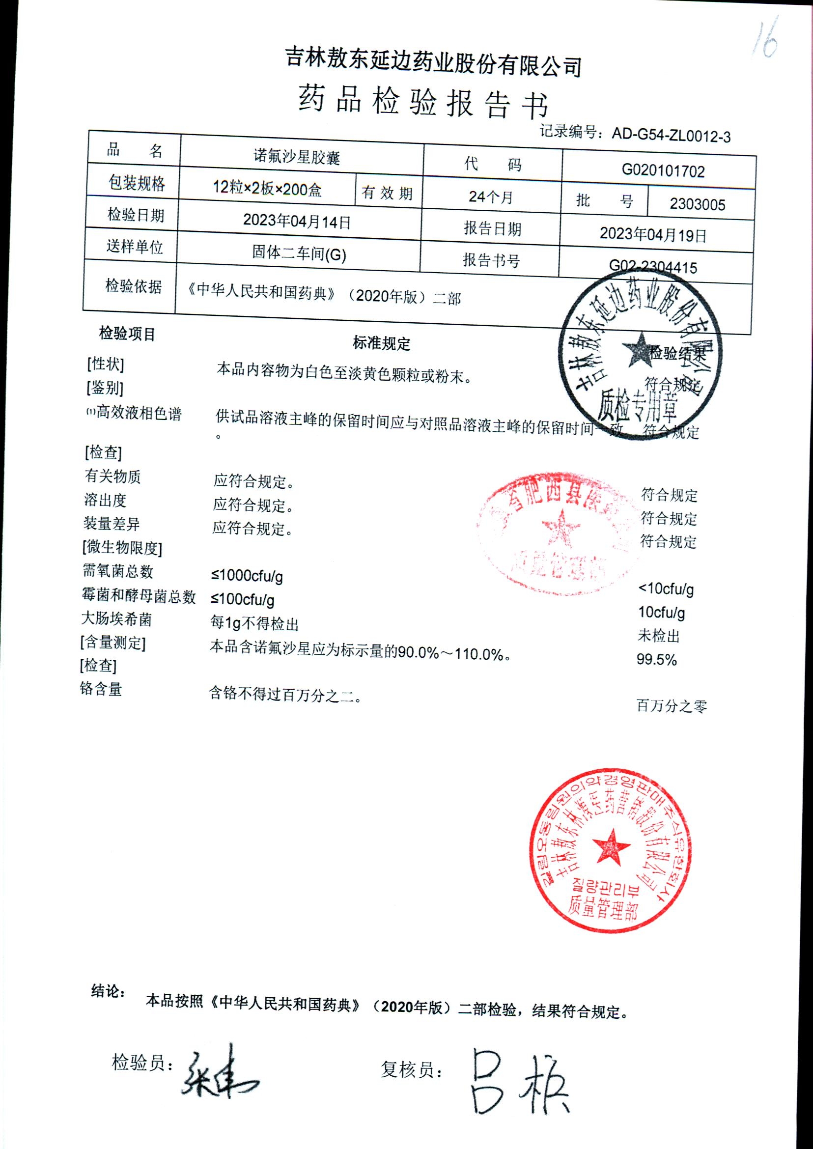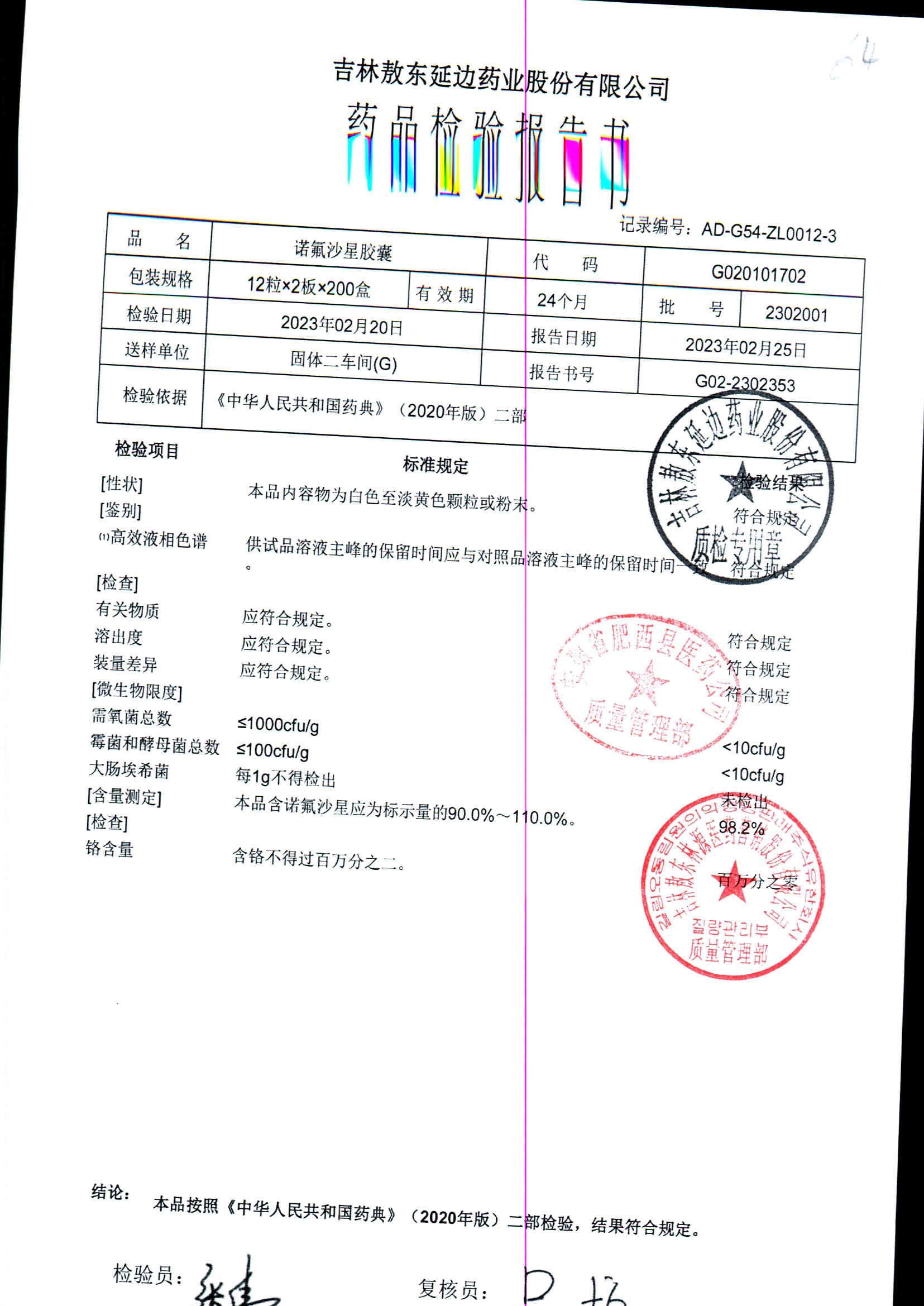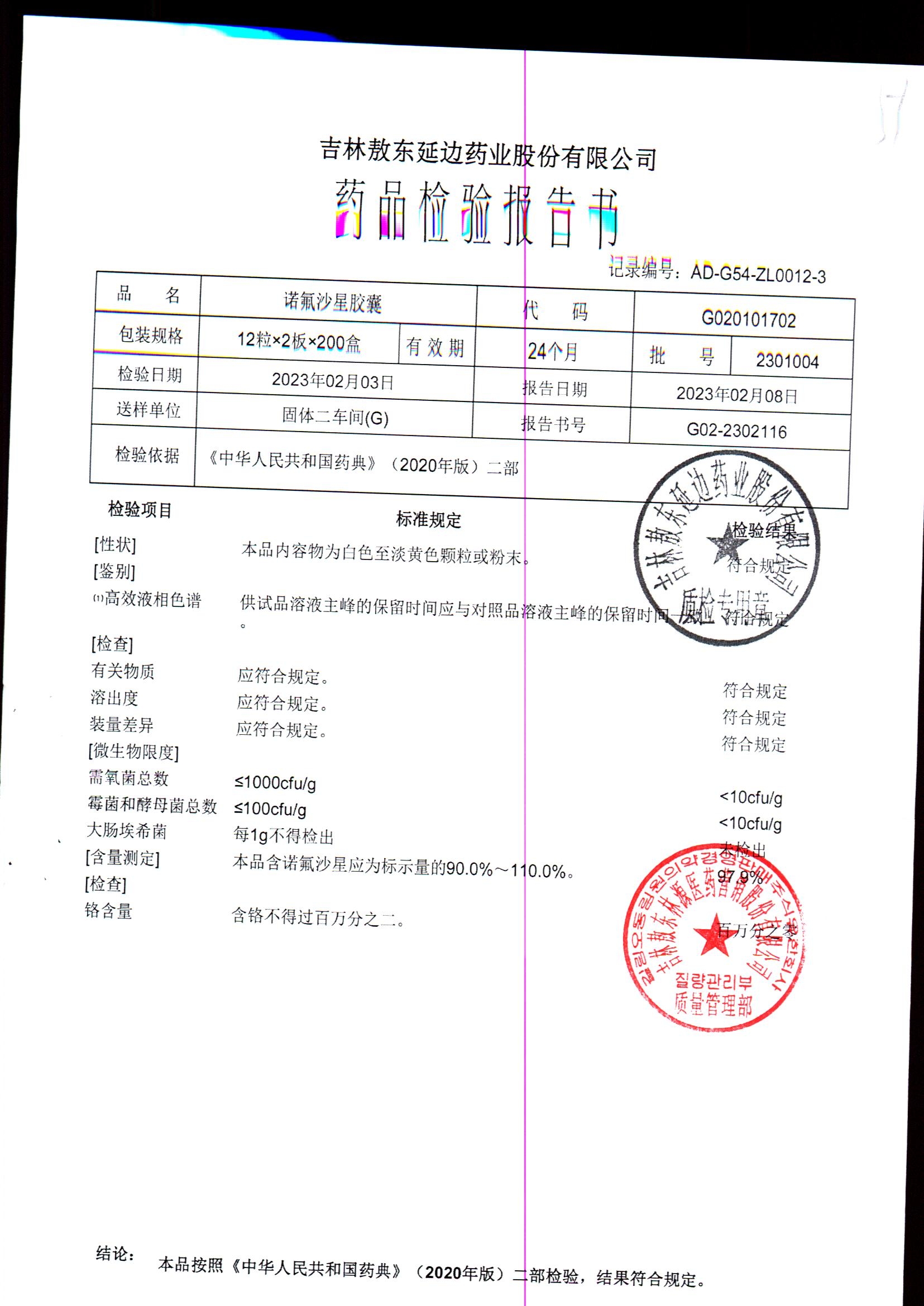 | 诺氟沙星胶囊 | 0.1g*12s*2板 | 2302001 | 查看详情 |