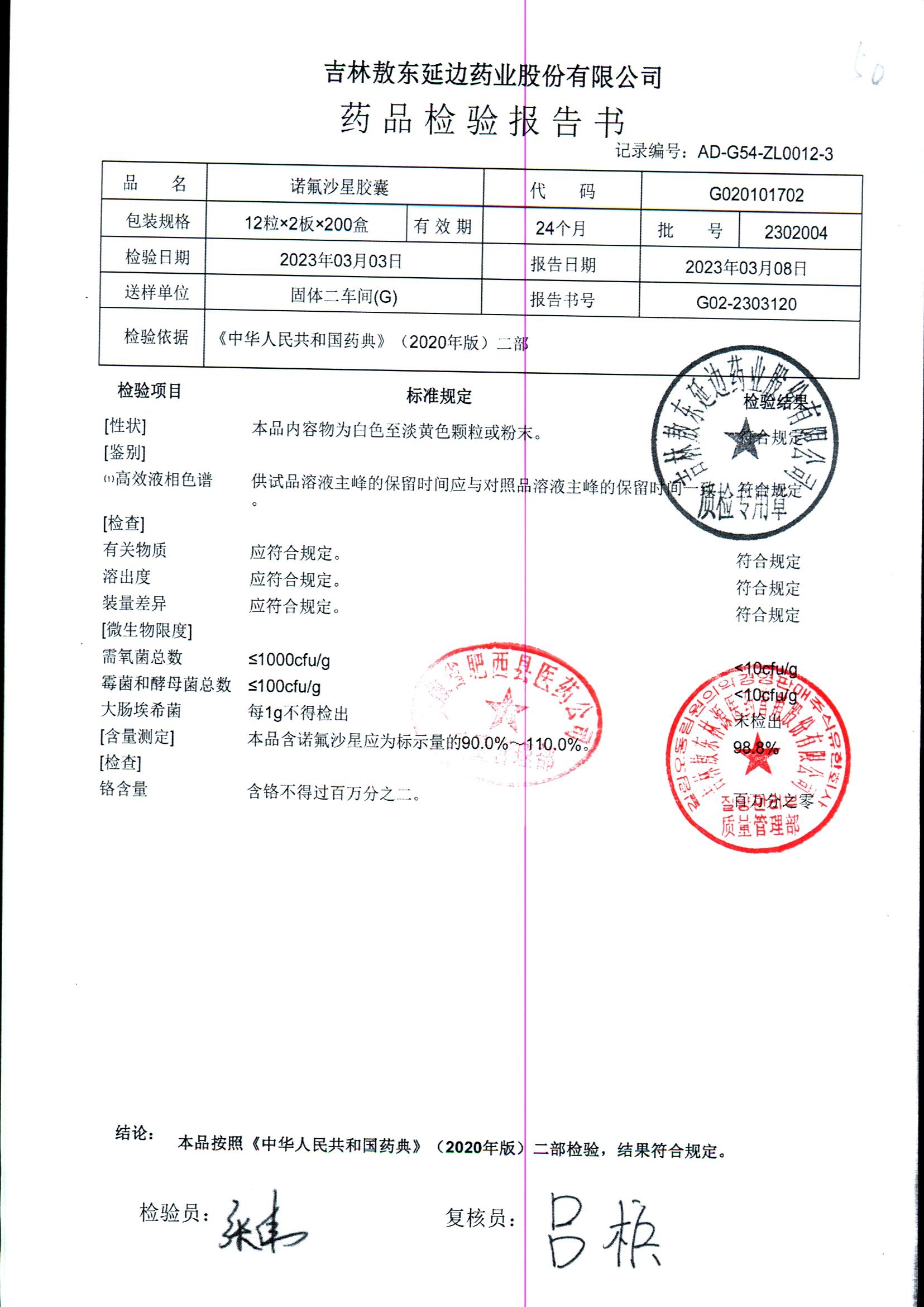 | 诺氟沙星胶囊 | 0.1g*12s*2板 | 2302004 | 查看详情 |