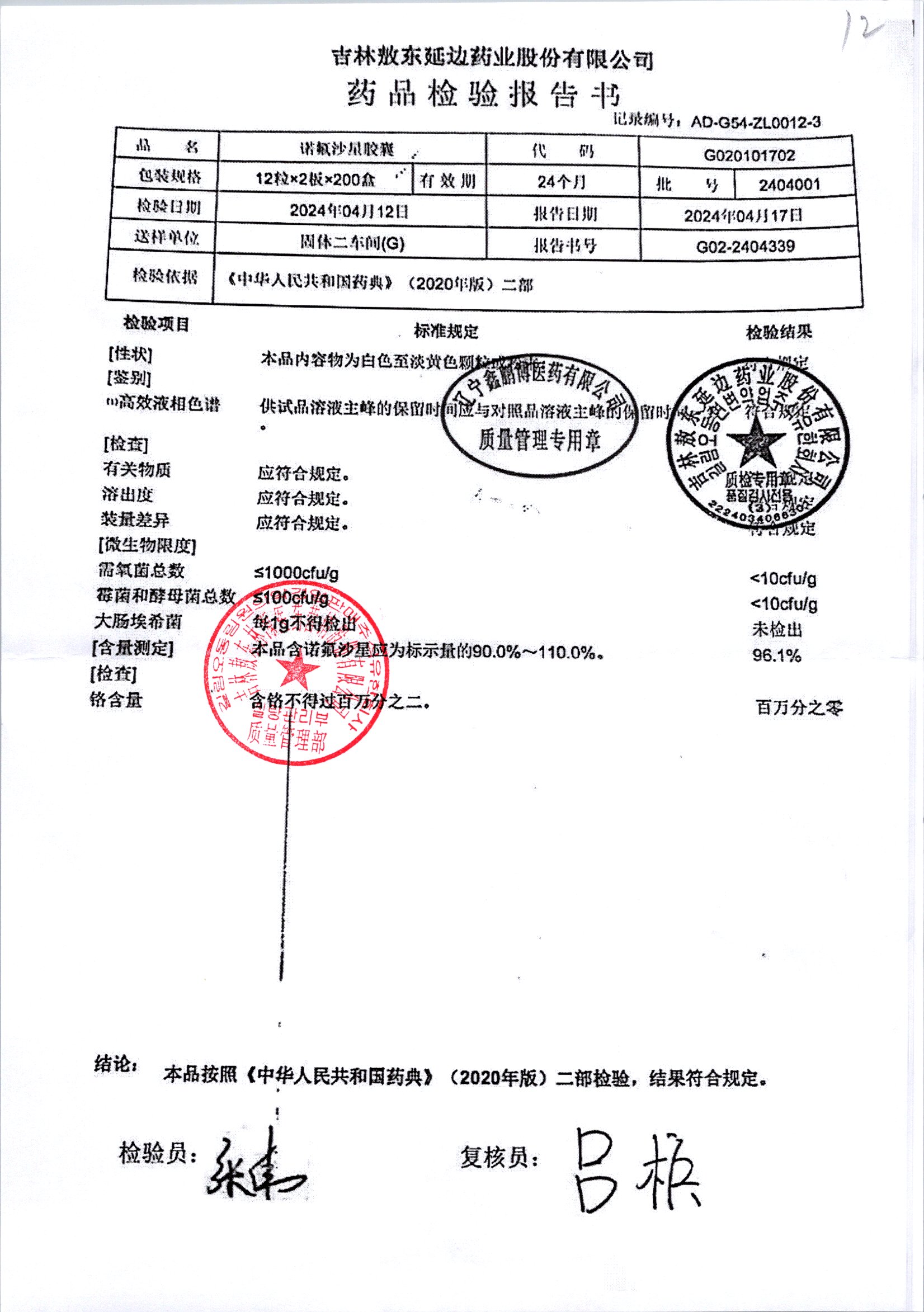 | 诺氟沙星胶囊 | 0.1g*12s*2板 | 2404001 | 查看详情 |