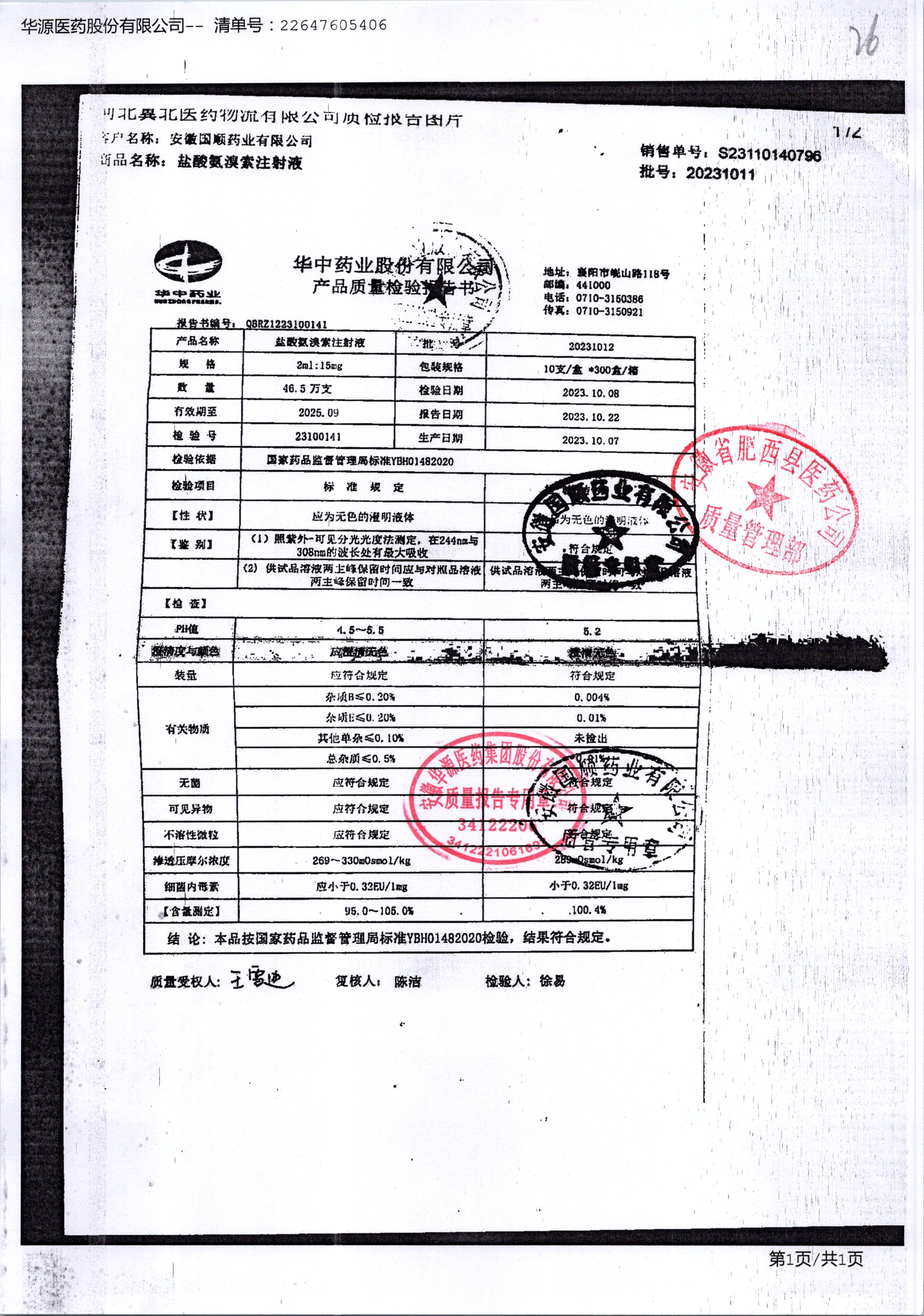 | 盐酸氨溴索注射液 | 2ml:15mg*10支 | 20231012 | 查看详情 |