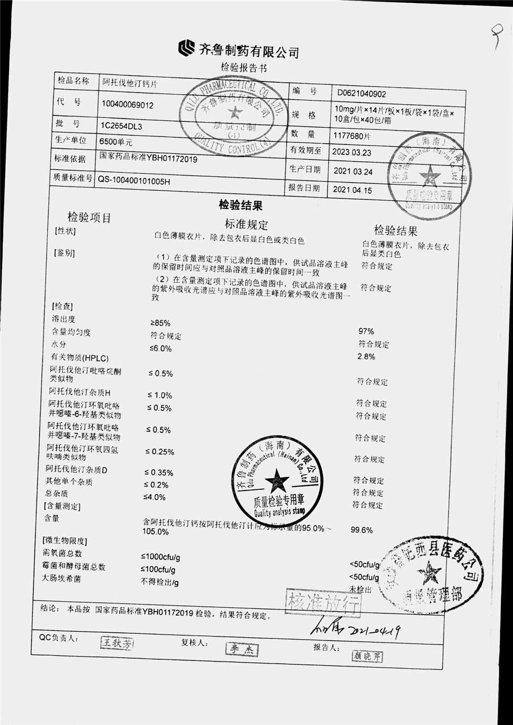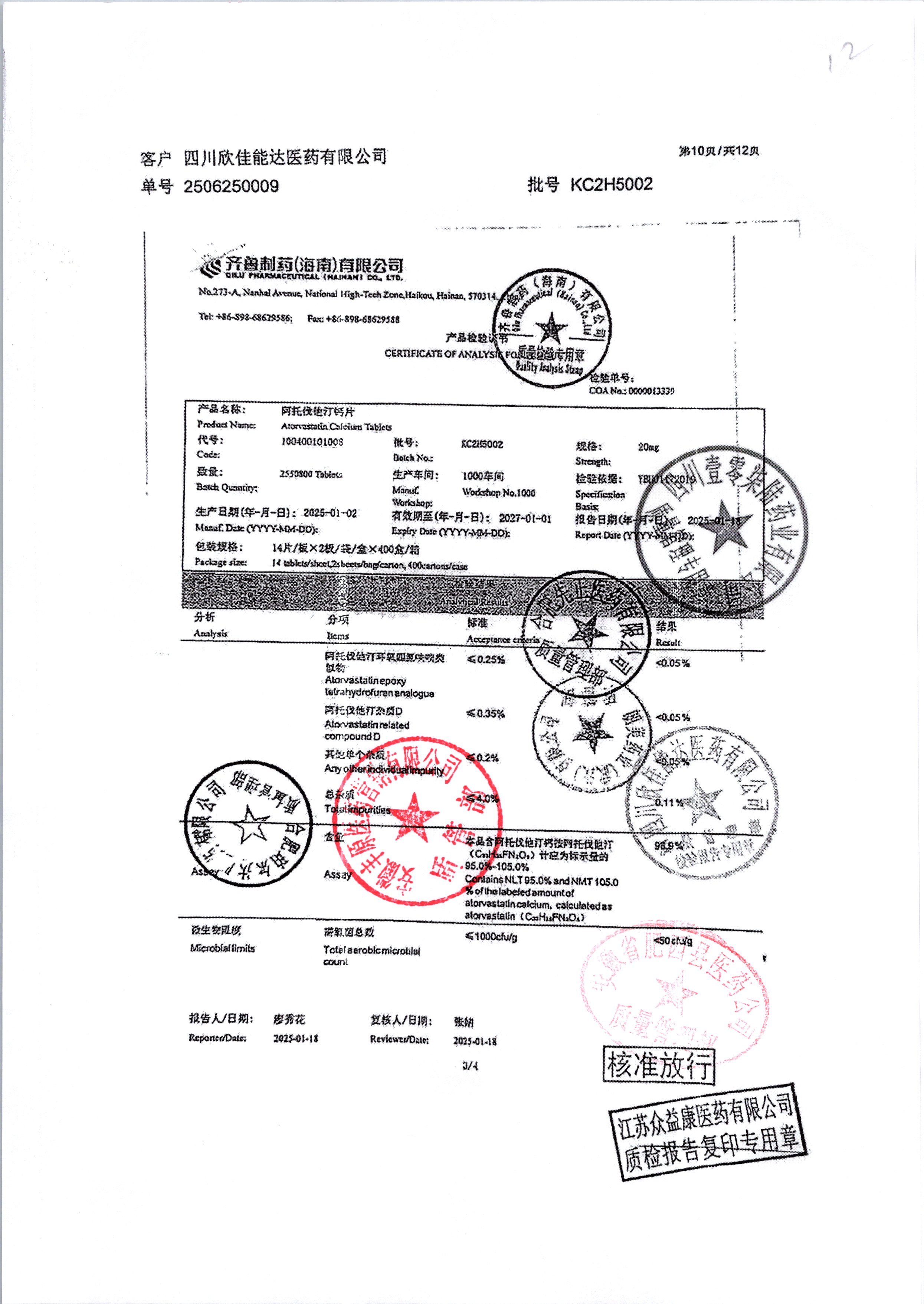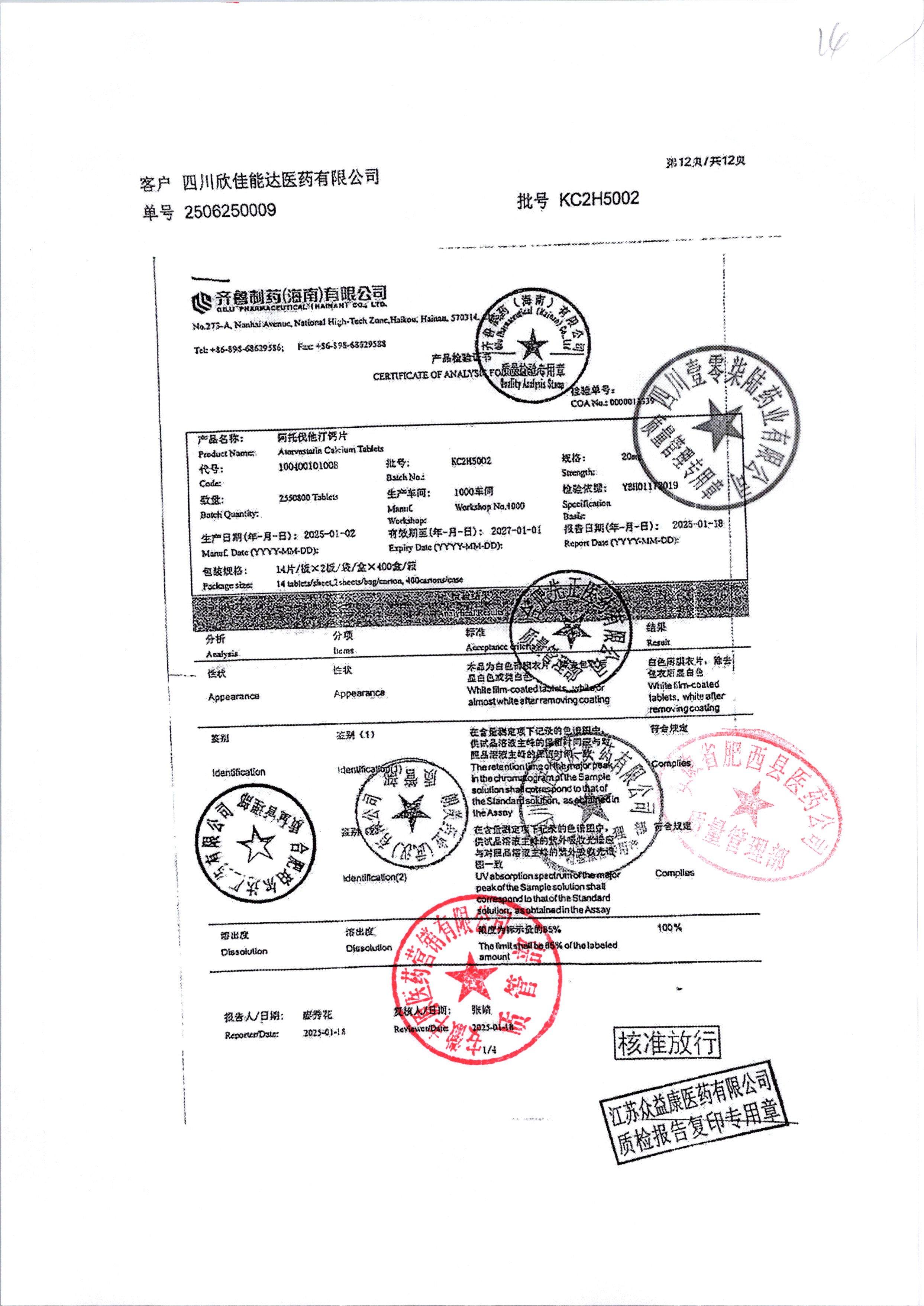 | 阿托伐他汀钙片 | 10mg*14片/袋/盒 | KC2H5002/3 | 查看详情 |