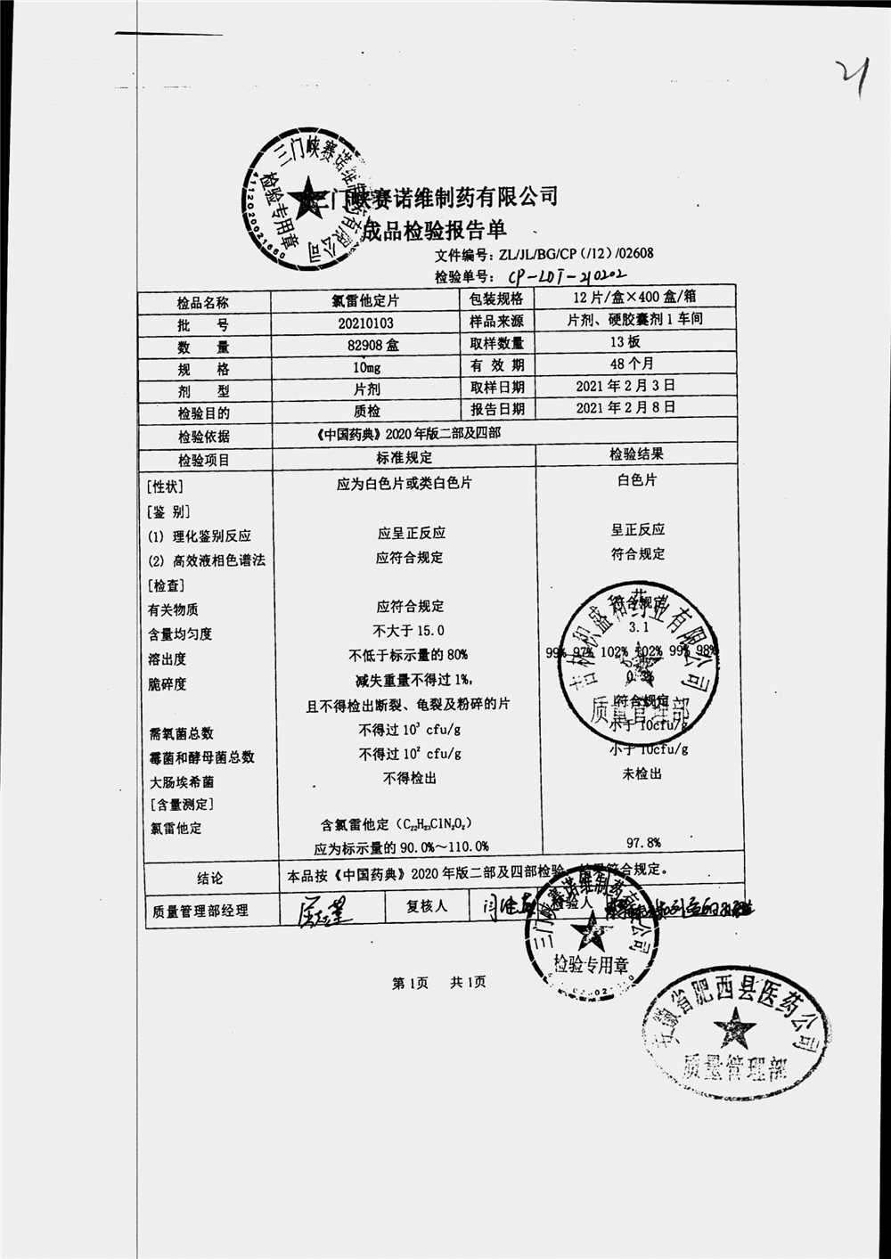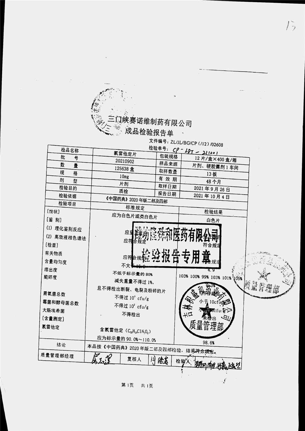 | 氯雷他定片 | 10mg*12片*1板 | 20210902 | 查看详情 |