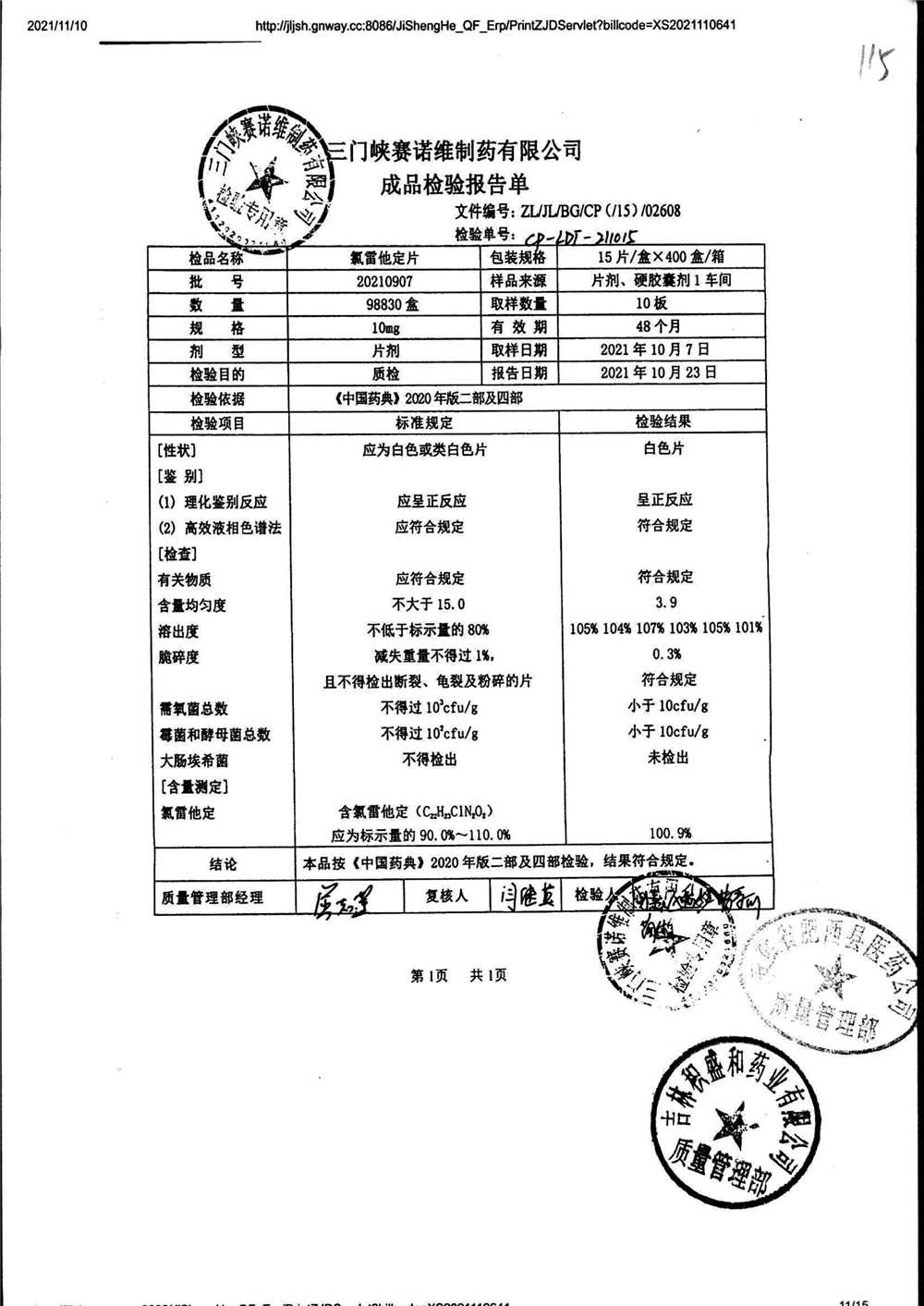 | 氯雷他定片 | 10mg*12片*1板 | 20210907 | 查看详情 |