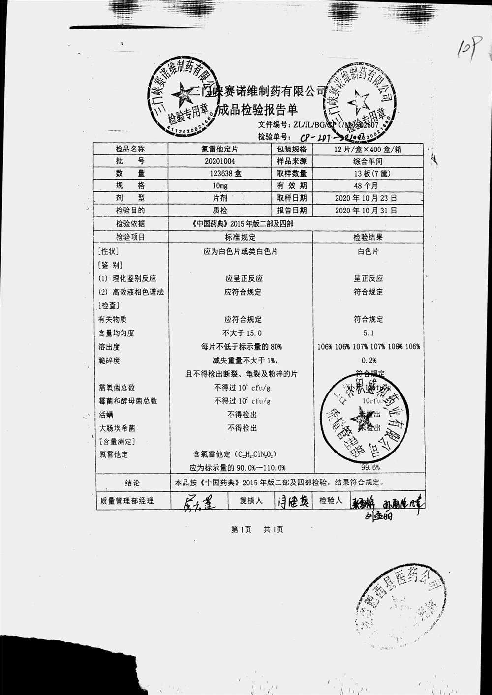 | 氯雷他定片 | 10mg*12片*1板 | 20201004 | 查看详情 |