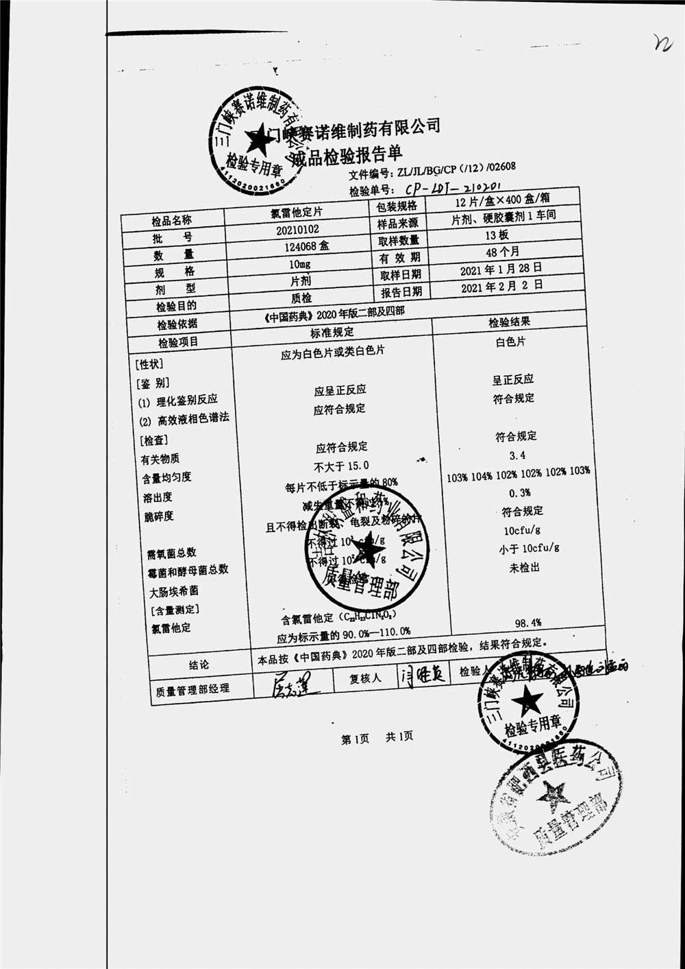 | 氯雷他定片 | 10mg*12片*1板 | 20210102 | 查看详情 |