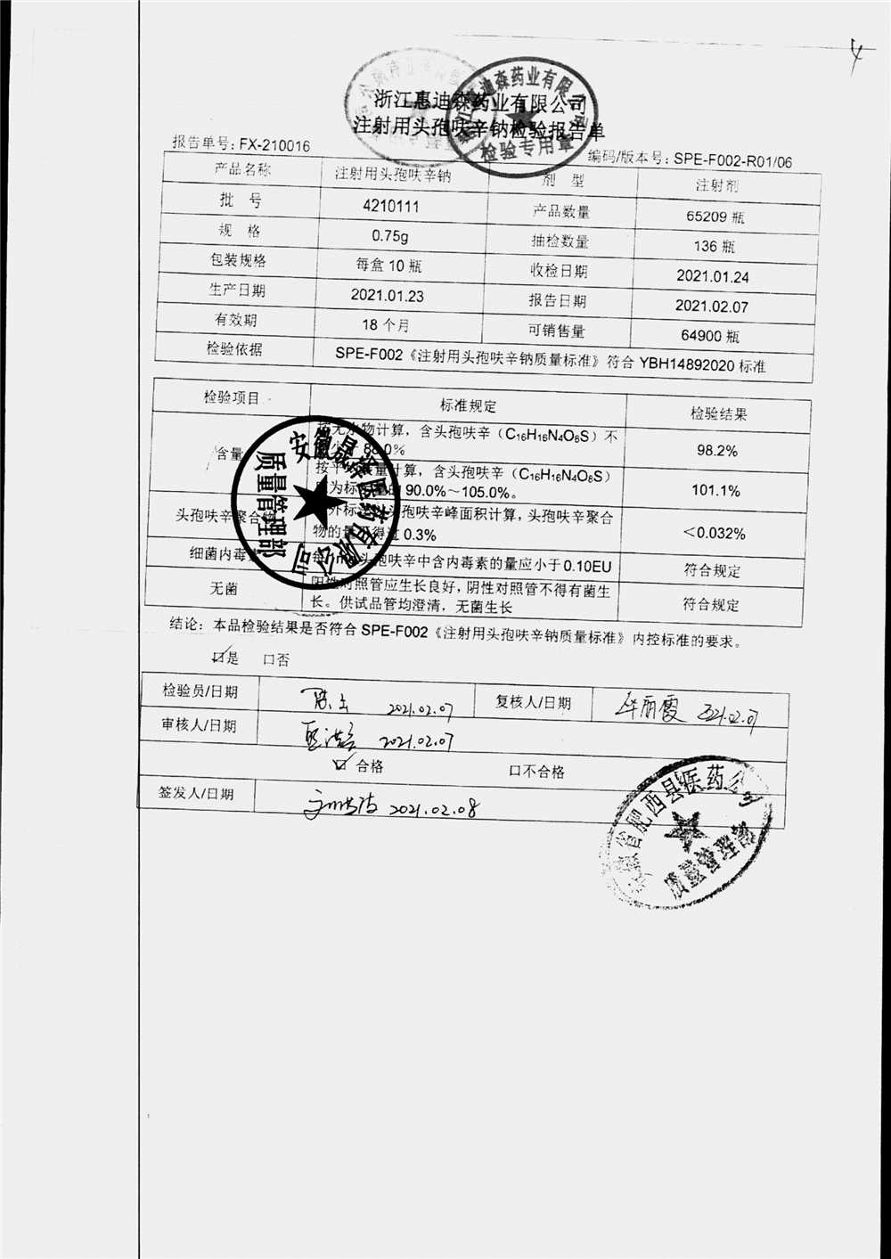 | 注射用头孢呋辛钠 | 0.75g*10瓶 | 4210111(2/2) | 查看详情 |