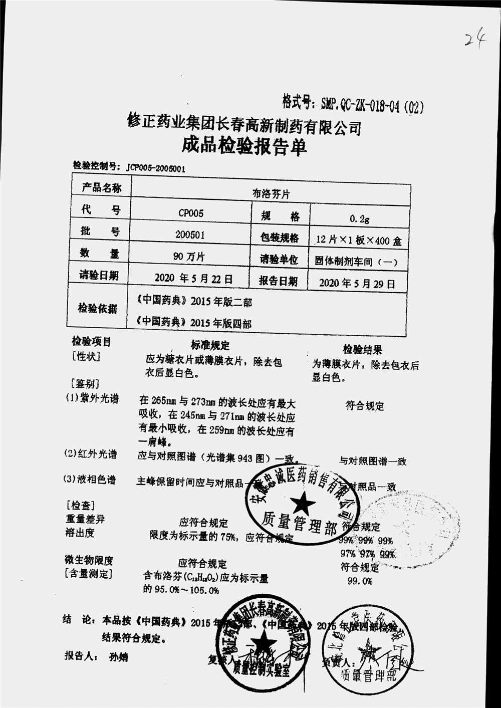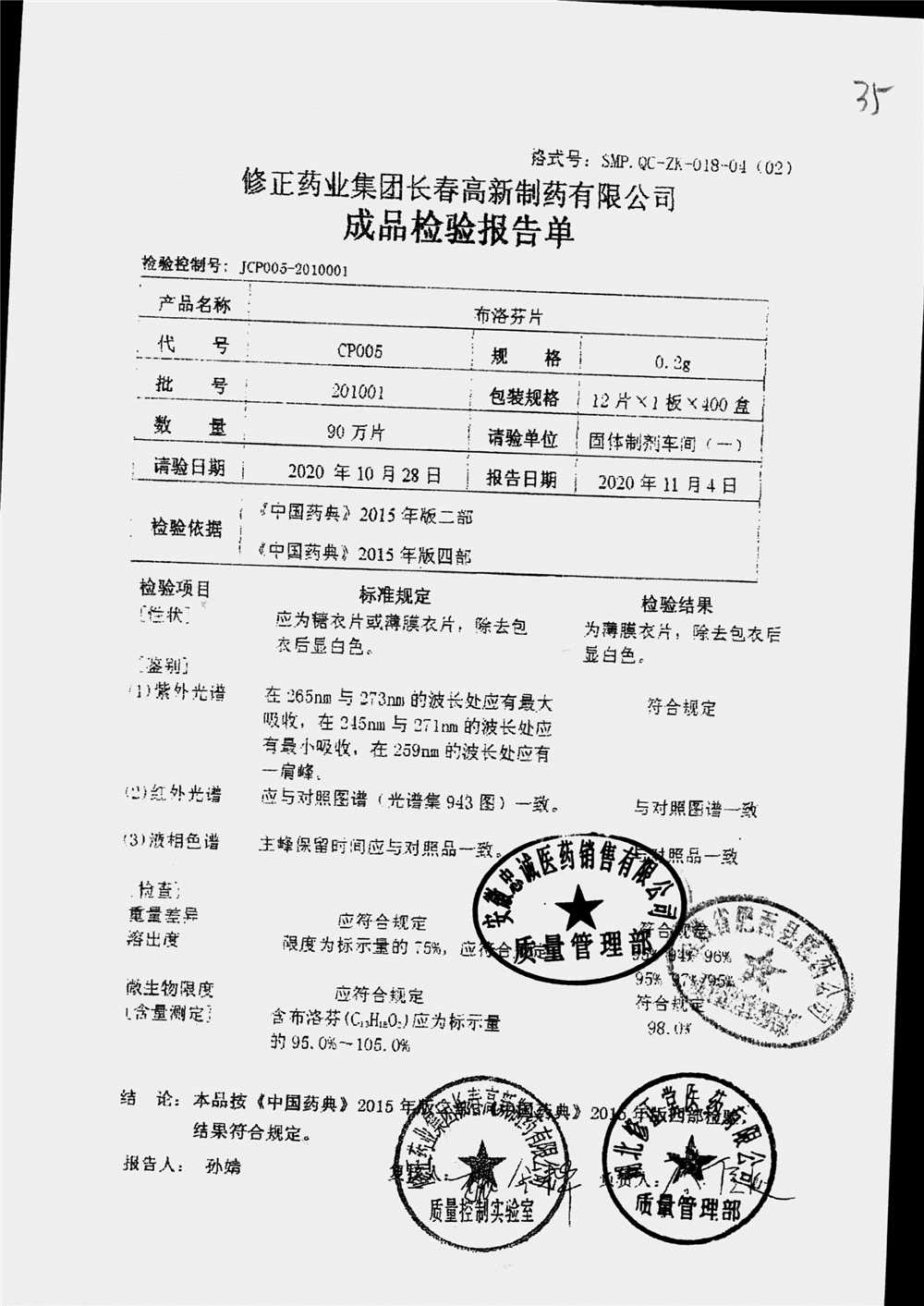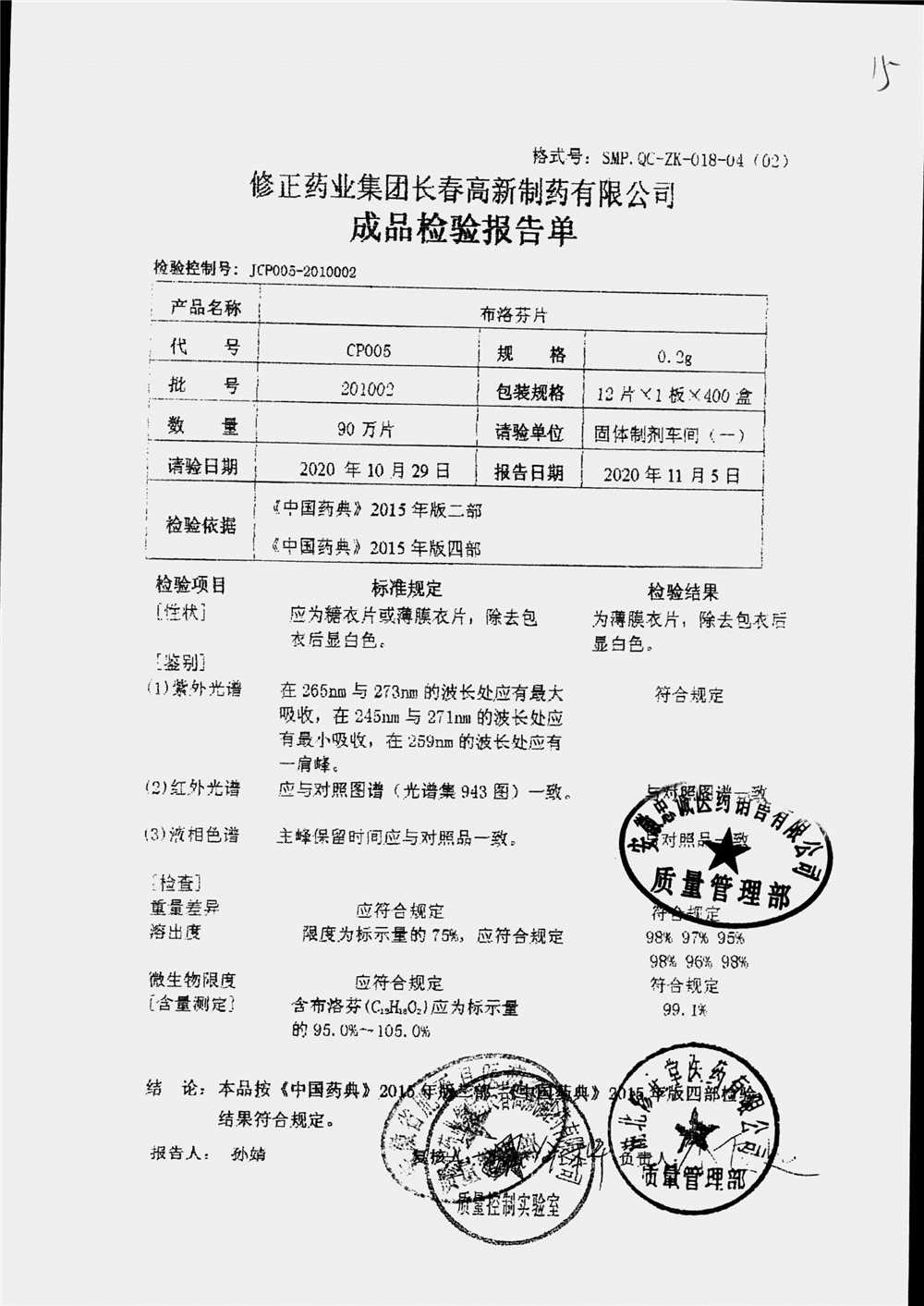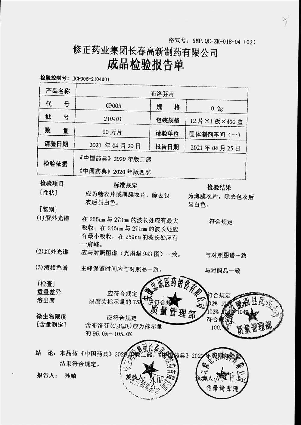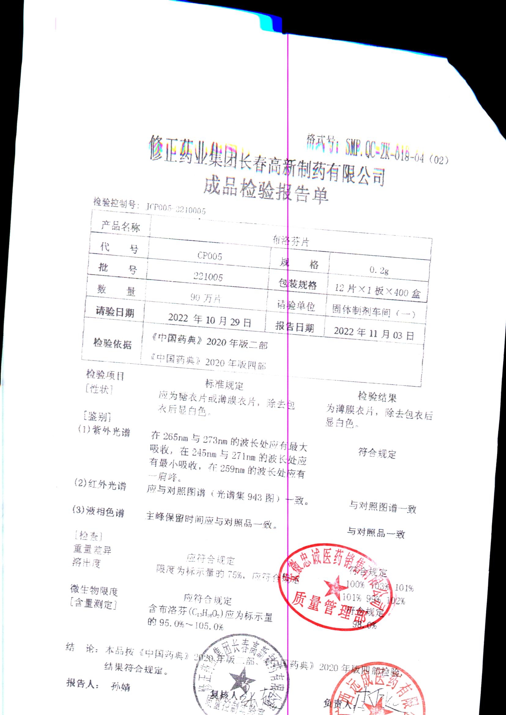 | 名称 | 规格 | 批号 | 药检报告 |
