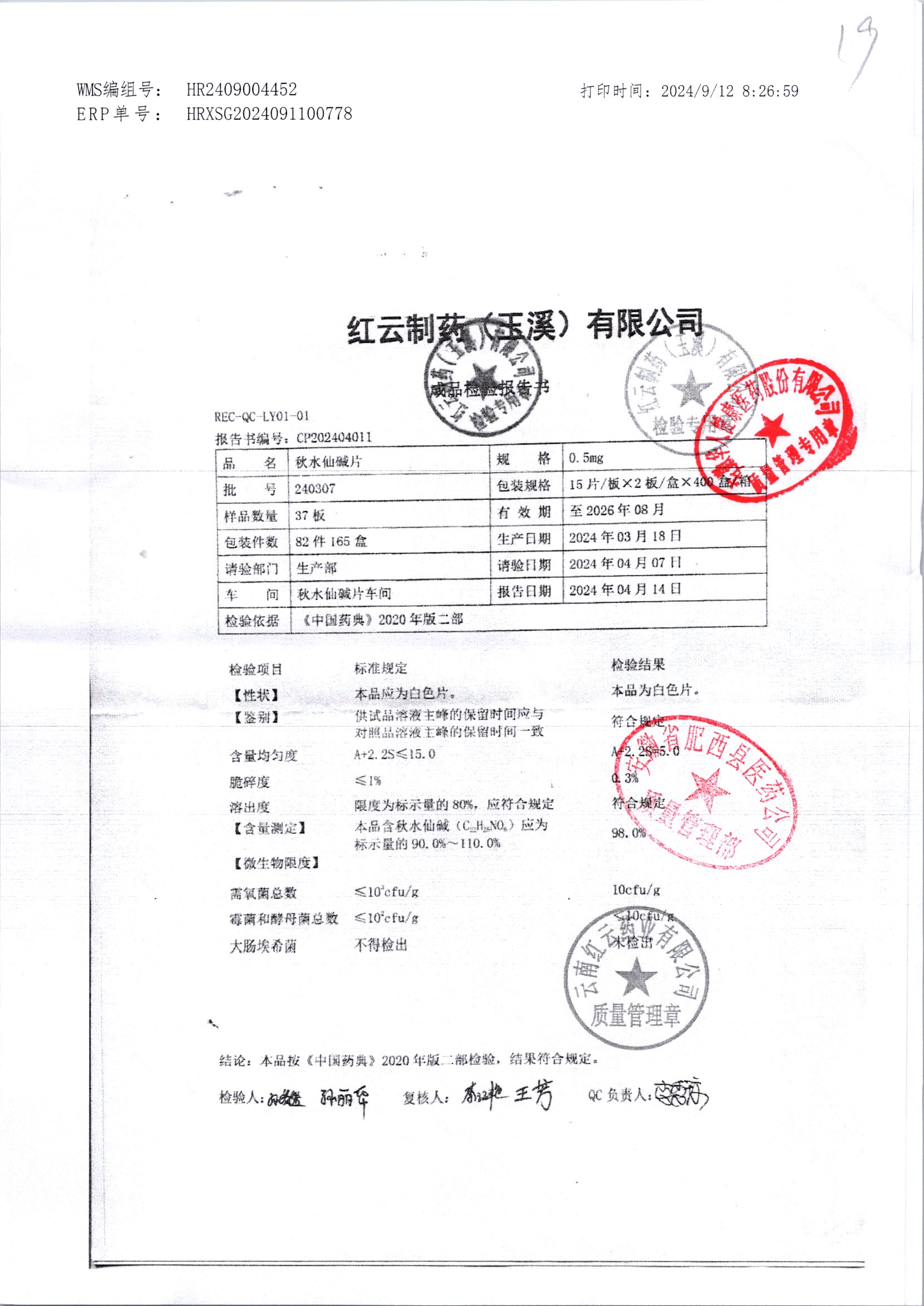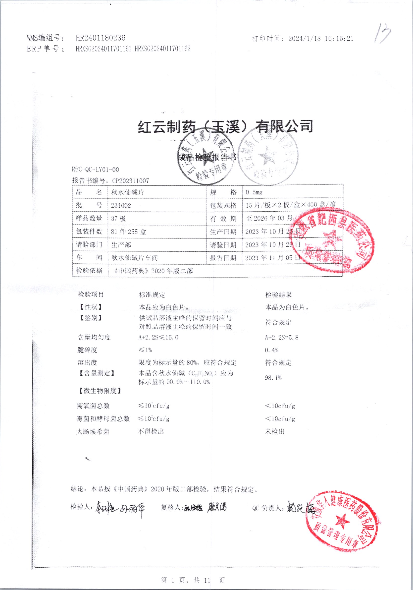 | 秋水仙碱片 | 0.5mg*15片*2板 | 240307 | 查看详情 |