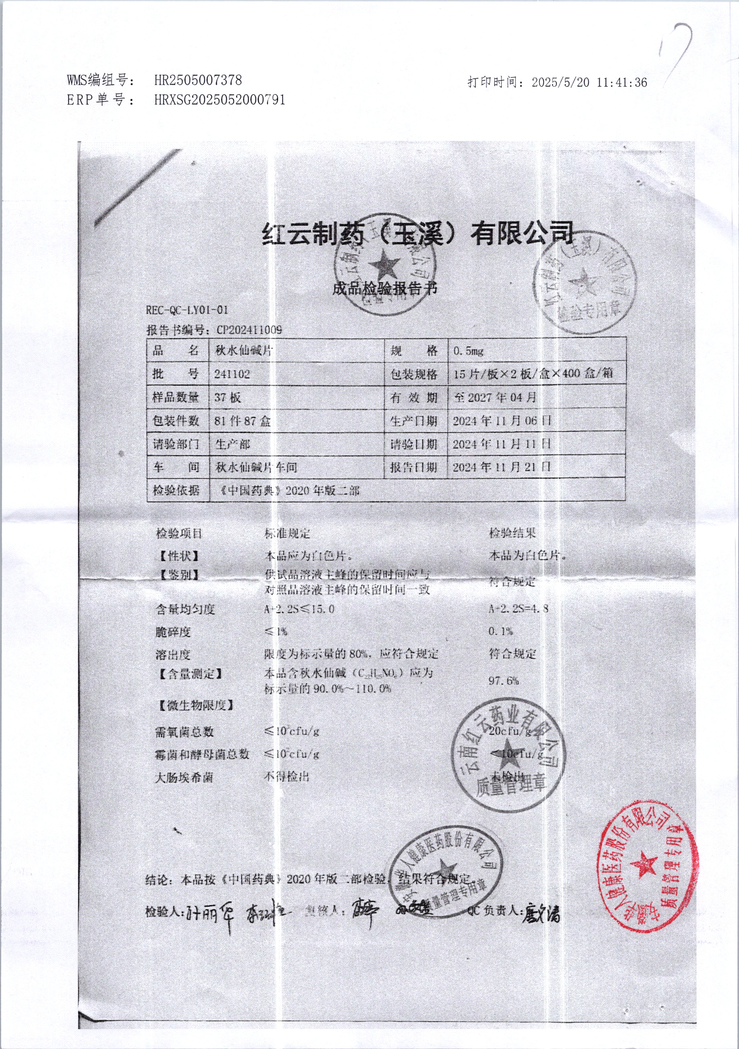 | 秋水仙碱片 | 0.5mg*15片*2板 | 241102 | 查看详情 |