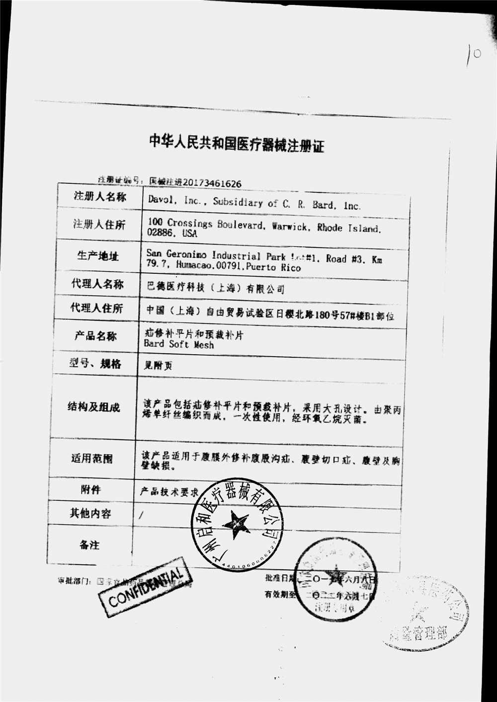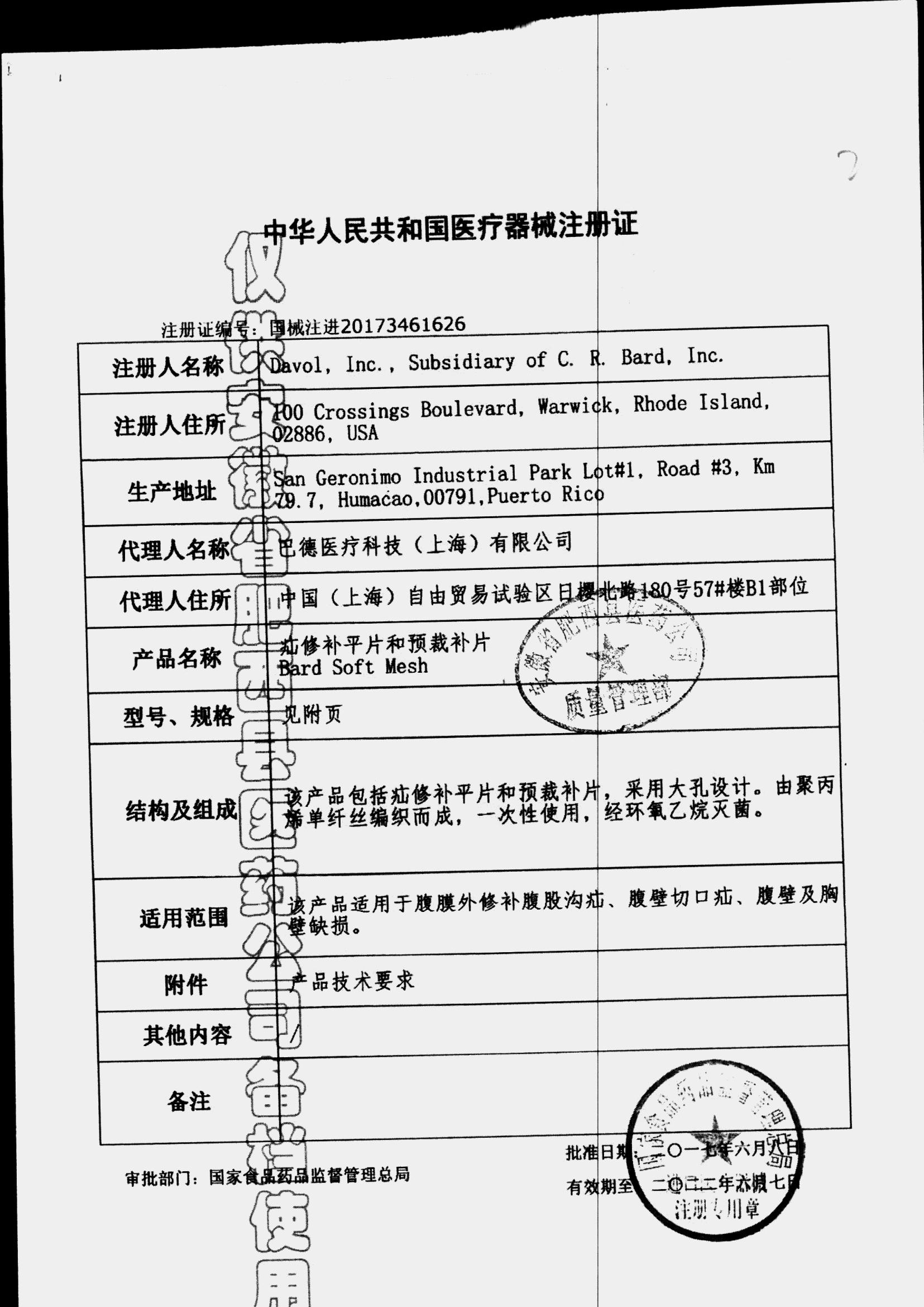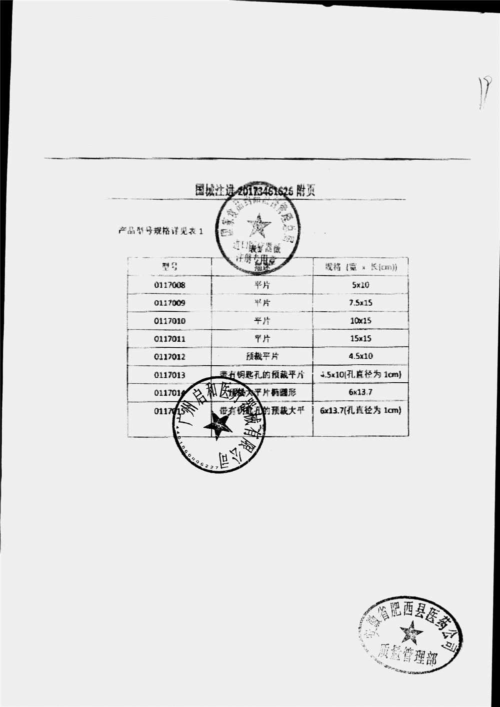 | 疝修补平片和预裁补片 | 10cm*15cm(型号:0117010) | 注册证(1/2) | 查看详情 |