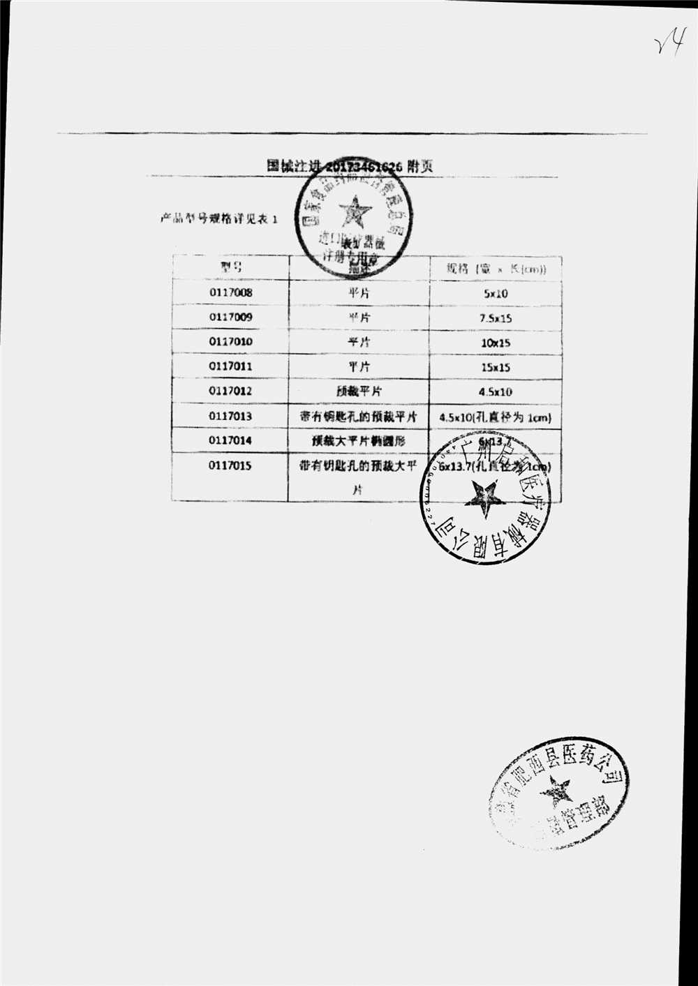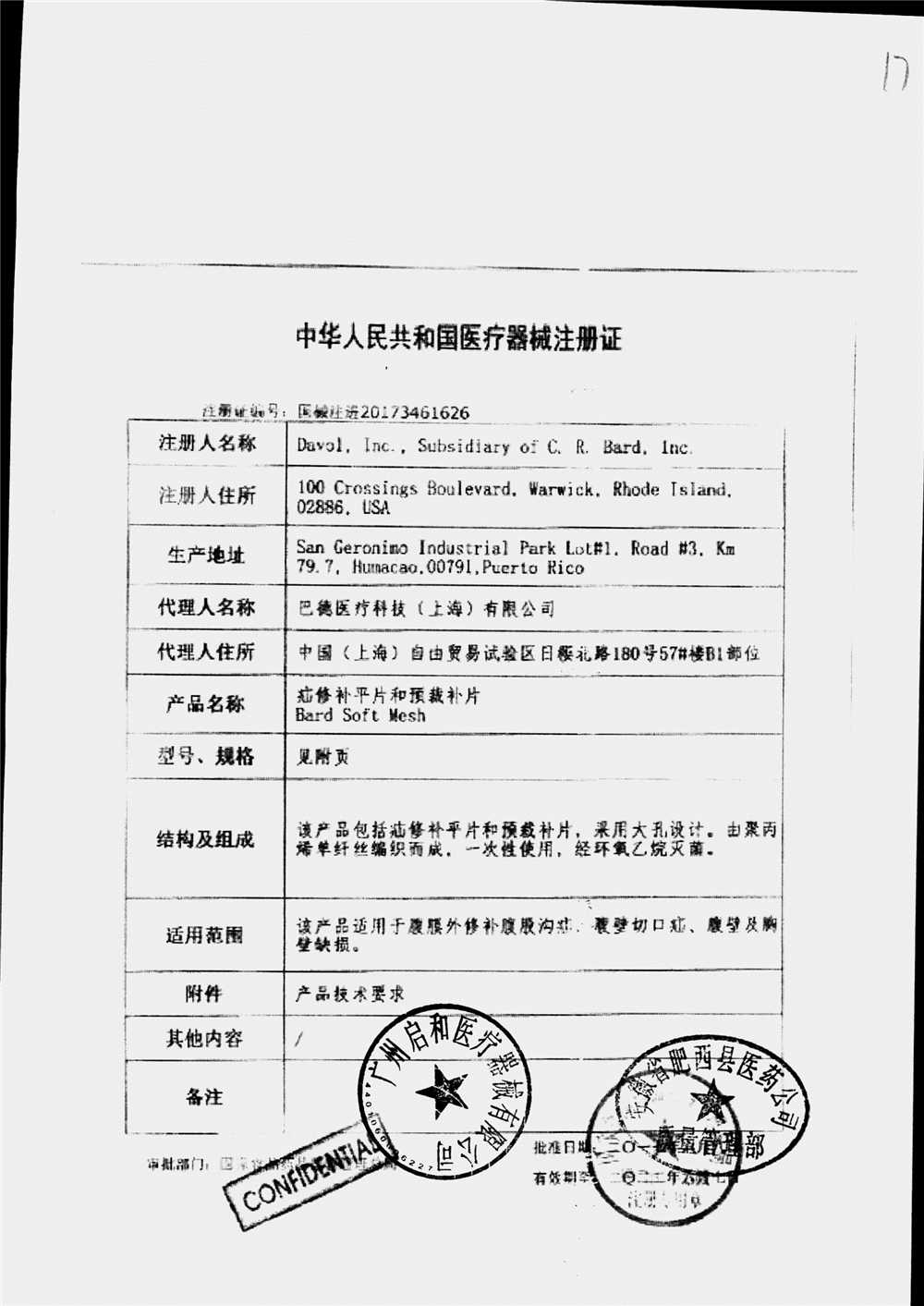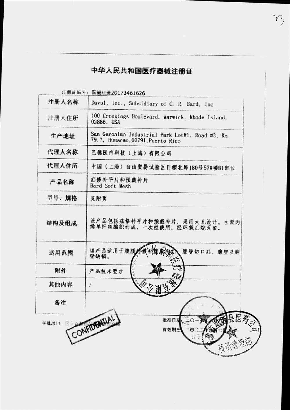 | 疝修补平片和预裁补片 | 10cm*15cm(型号:0117010) | 注册证(1/2) | 查看详情 |
