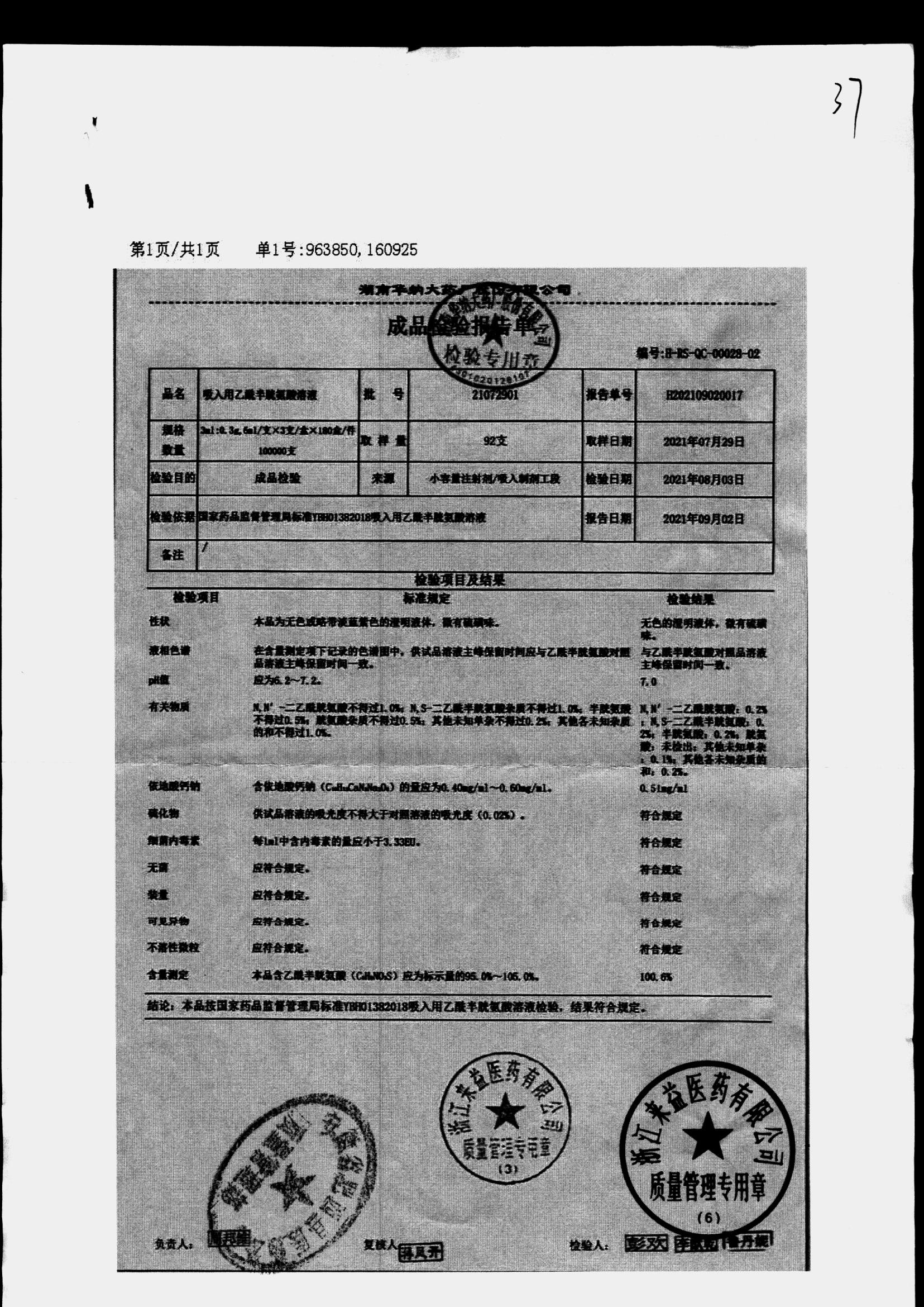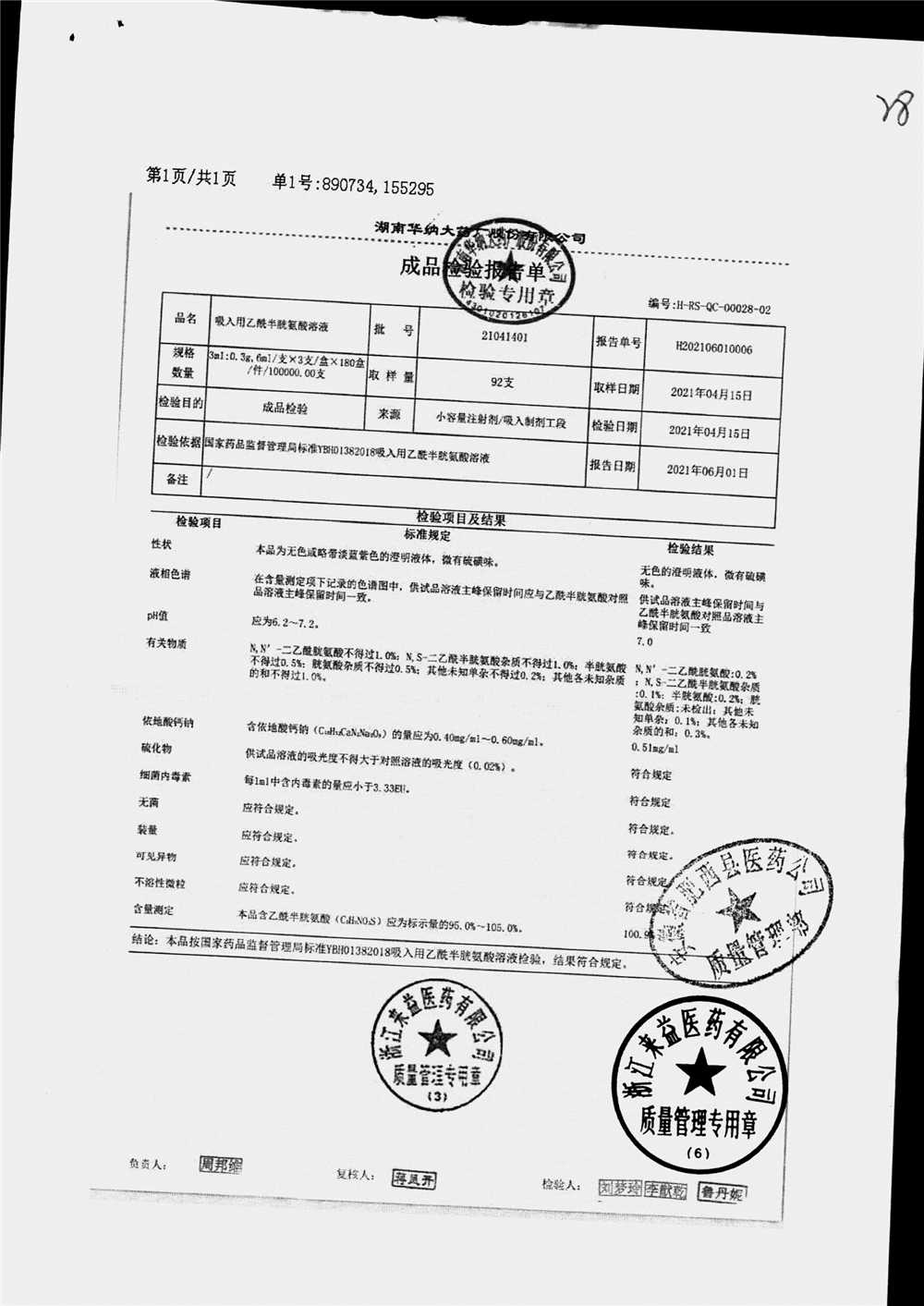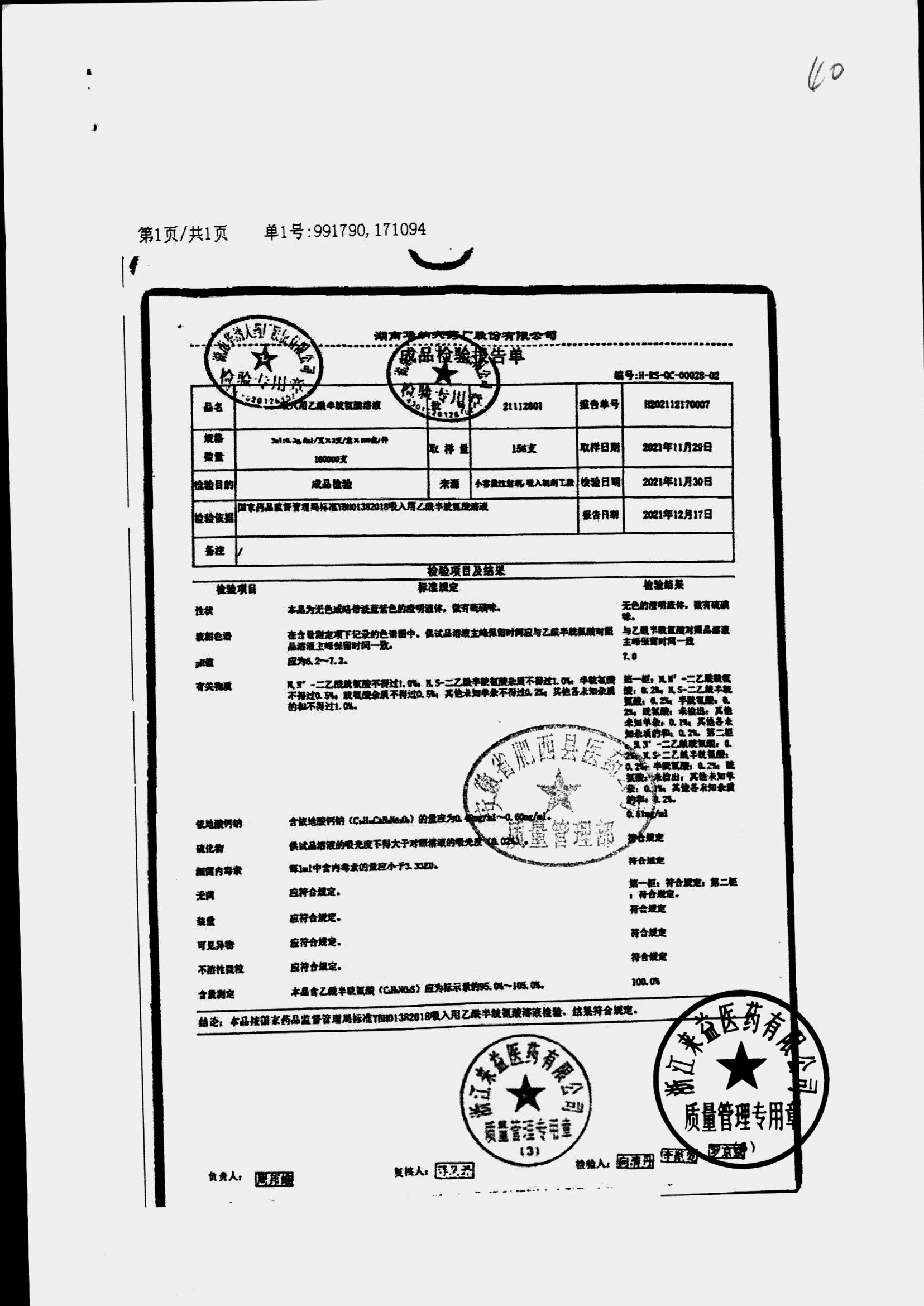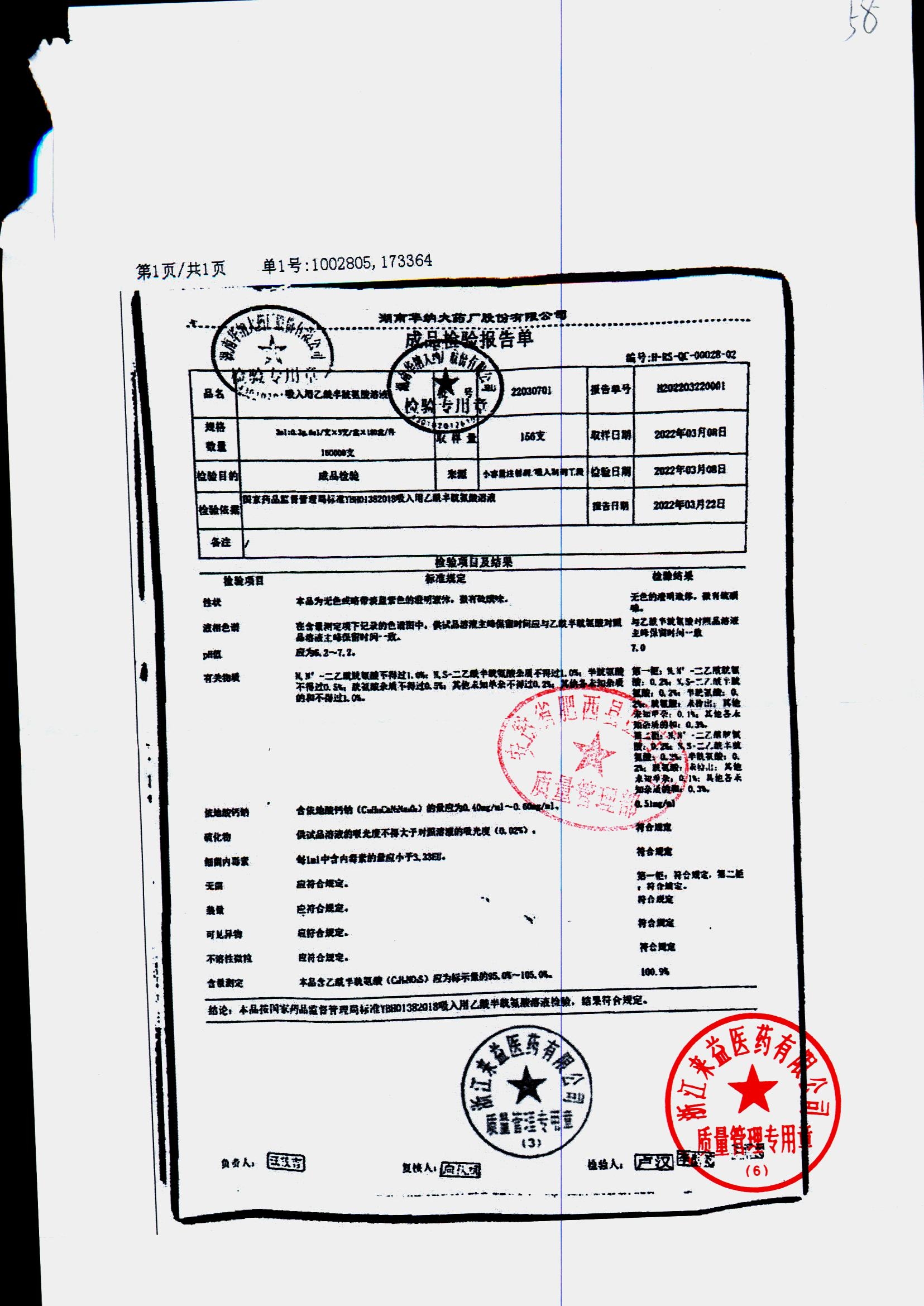 | 吸入用乙酰半胱氨酸溶液 | 6ml*3支 | 21041401(1/2) | 查看详情 |
