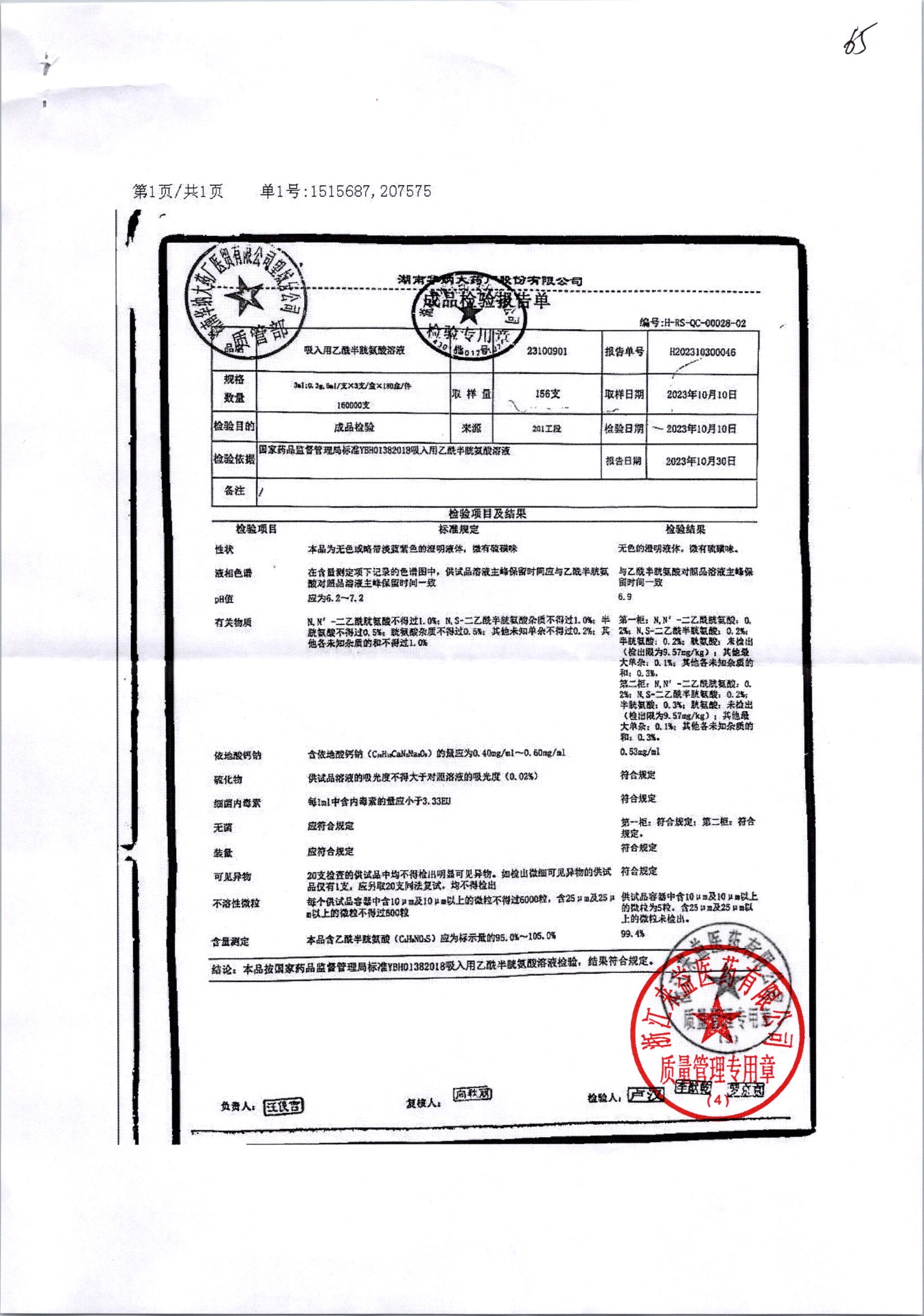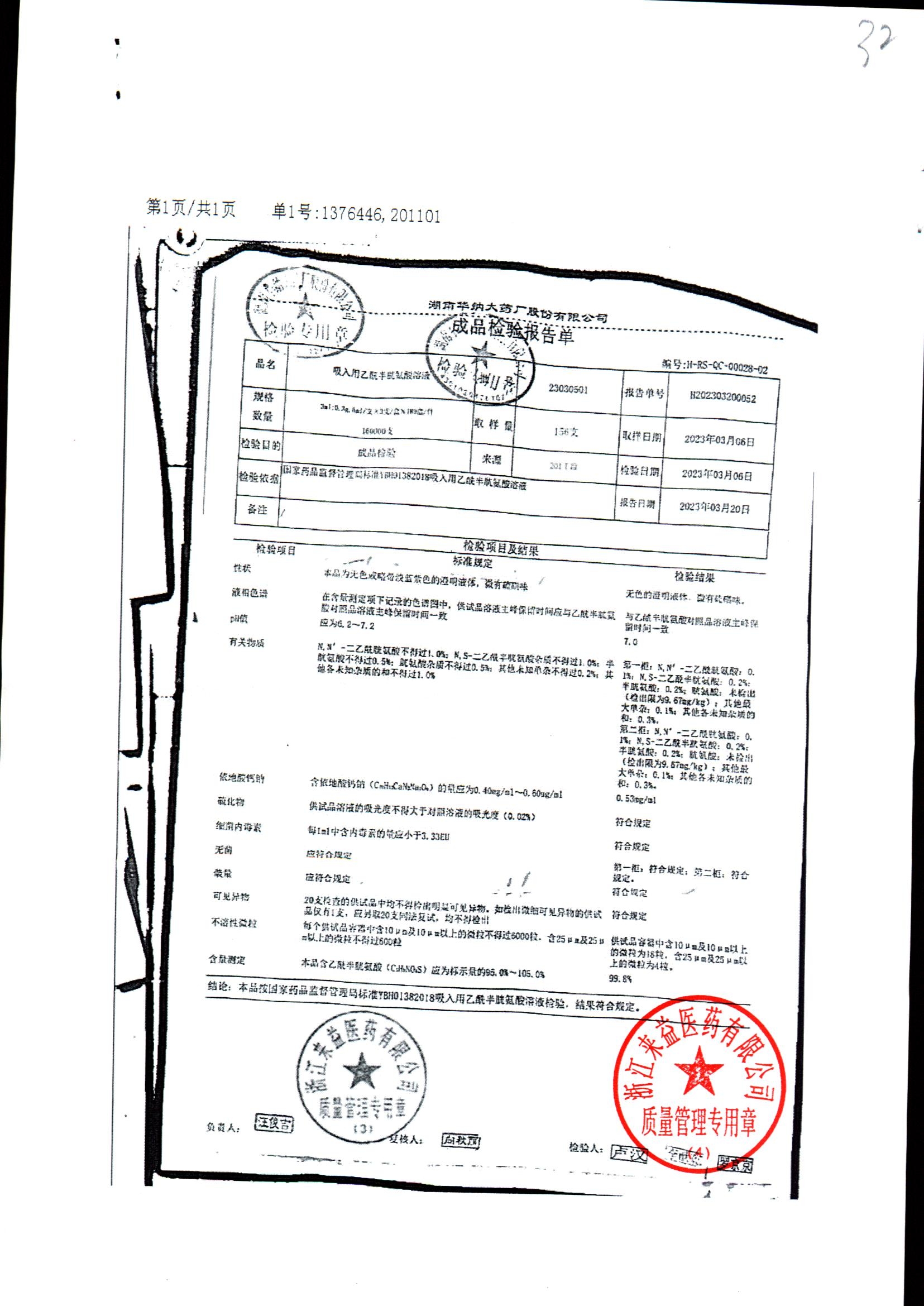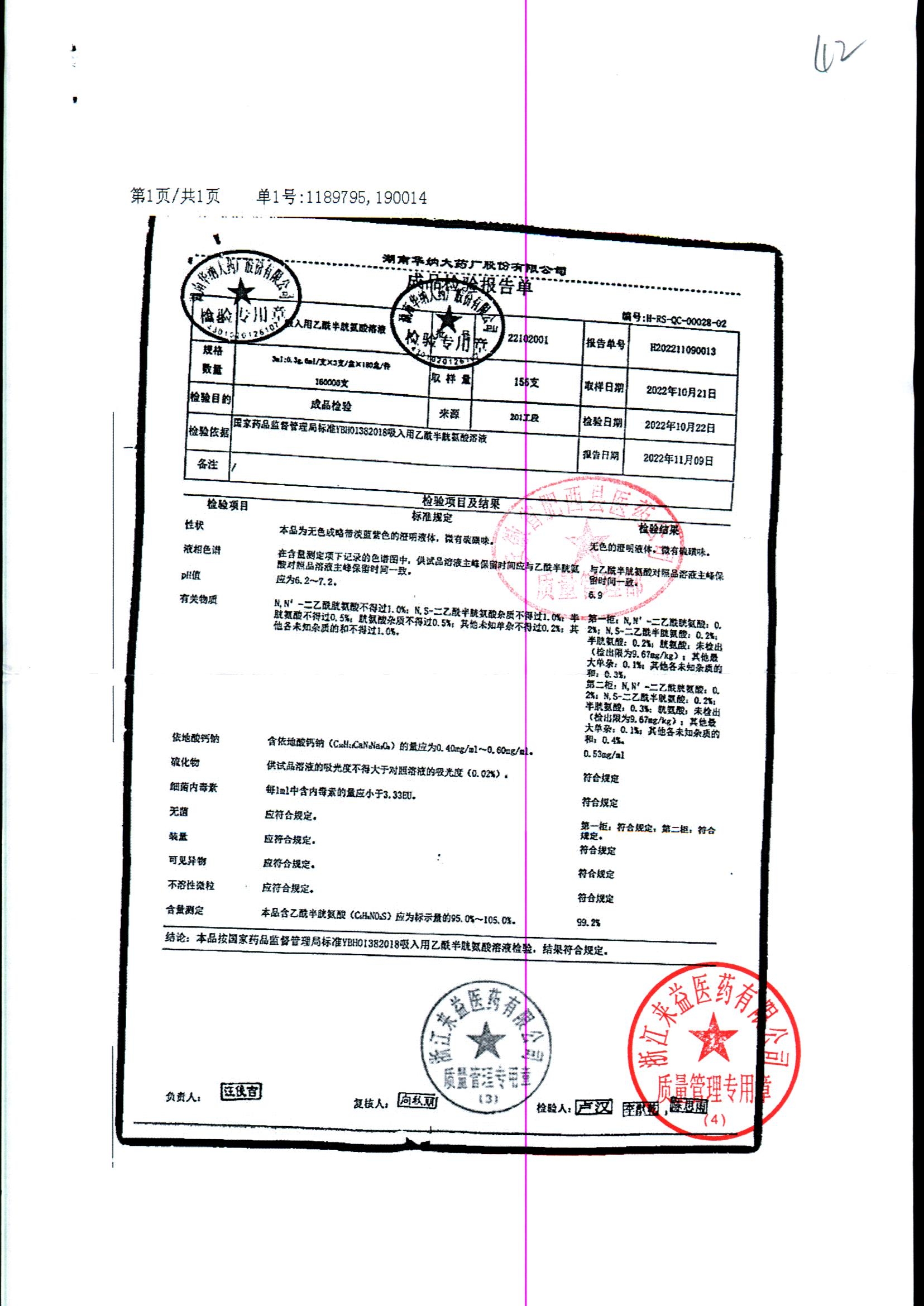 | 吸入用乙酰半胱氨酸溶液 | 6ml*3支 | 21041401(1/2) | 查看详情 |