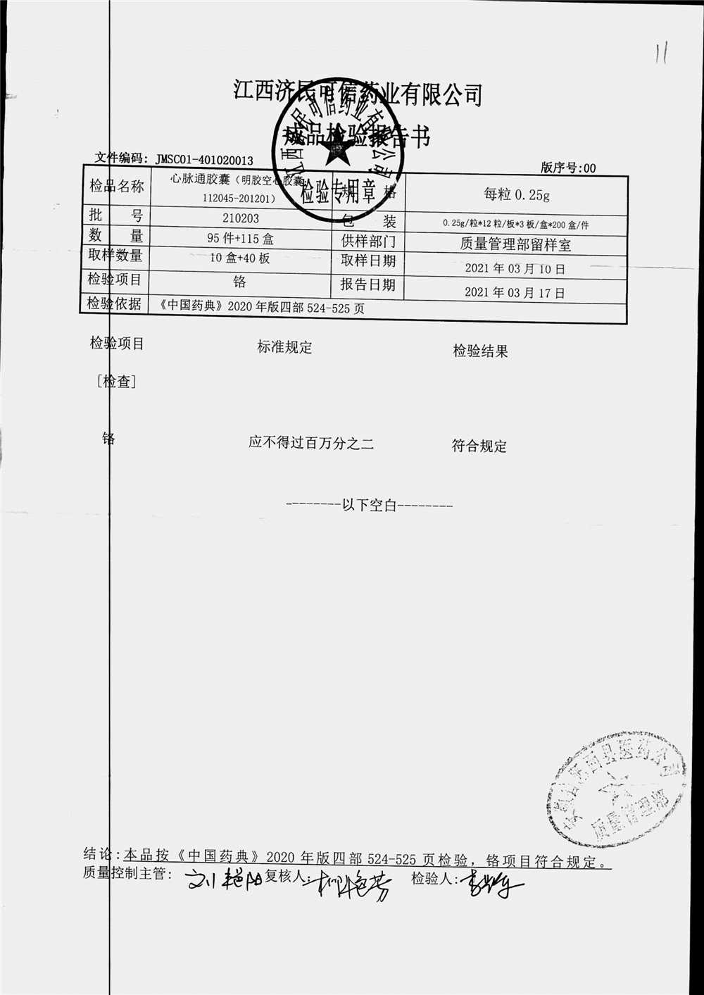 | 心脉通胶囊 | 0.25g*12s*3板 | 210203(1/2) | 查看详情 |