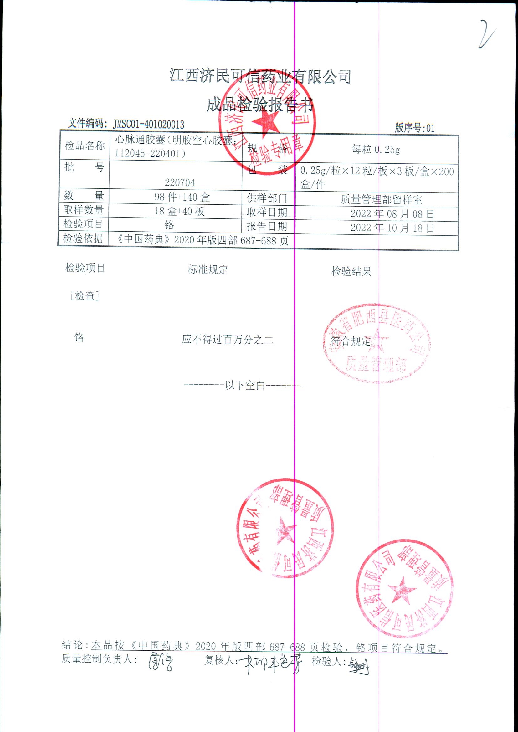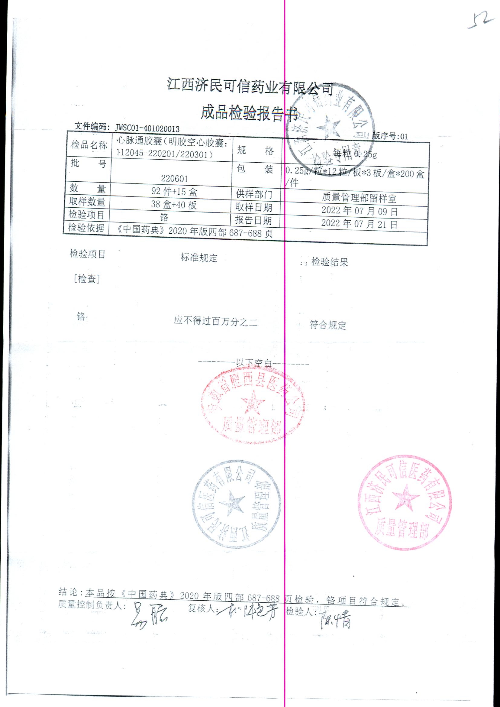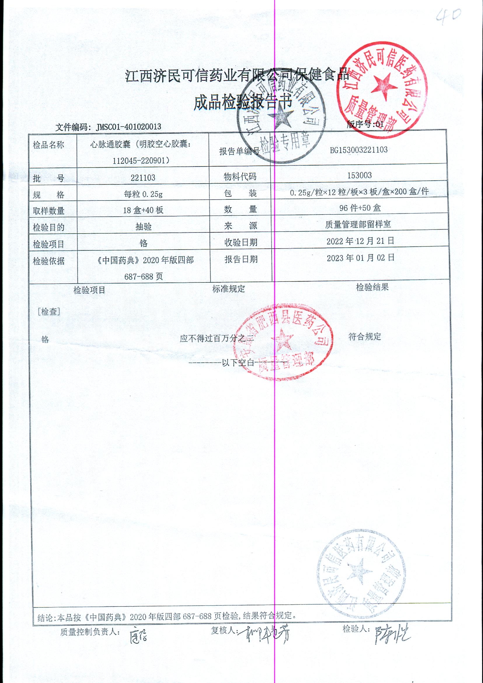 | 心脉通胶囊 | 0.25g*12s*3板 | 220601/2 | 查看详情 |