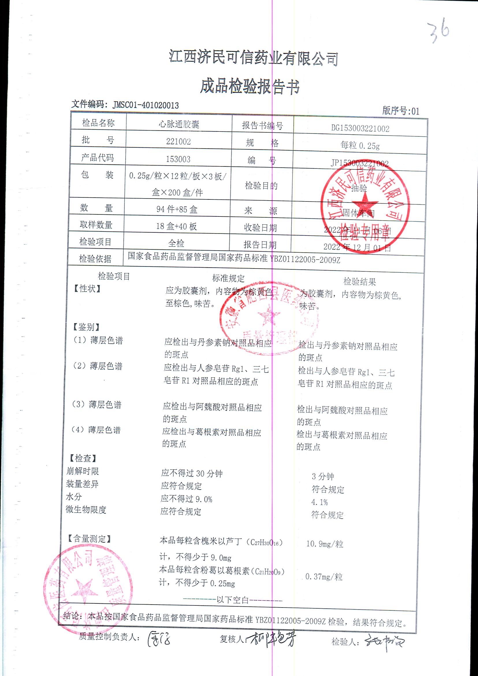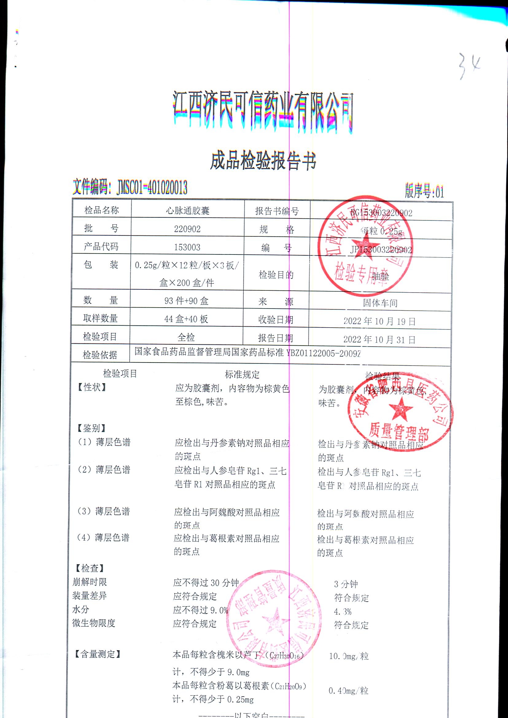 | 心脉通胶囊 | 0.25g*12s*3板 | 220902/2 | 查看详情 |