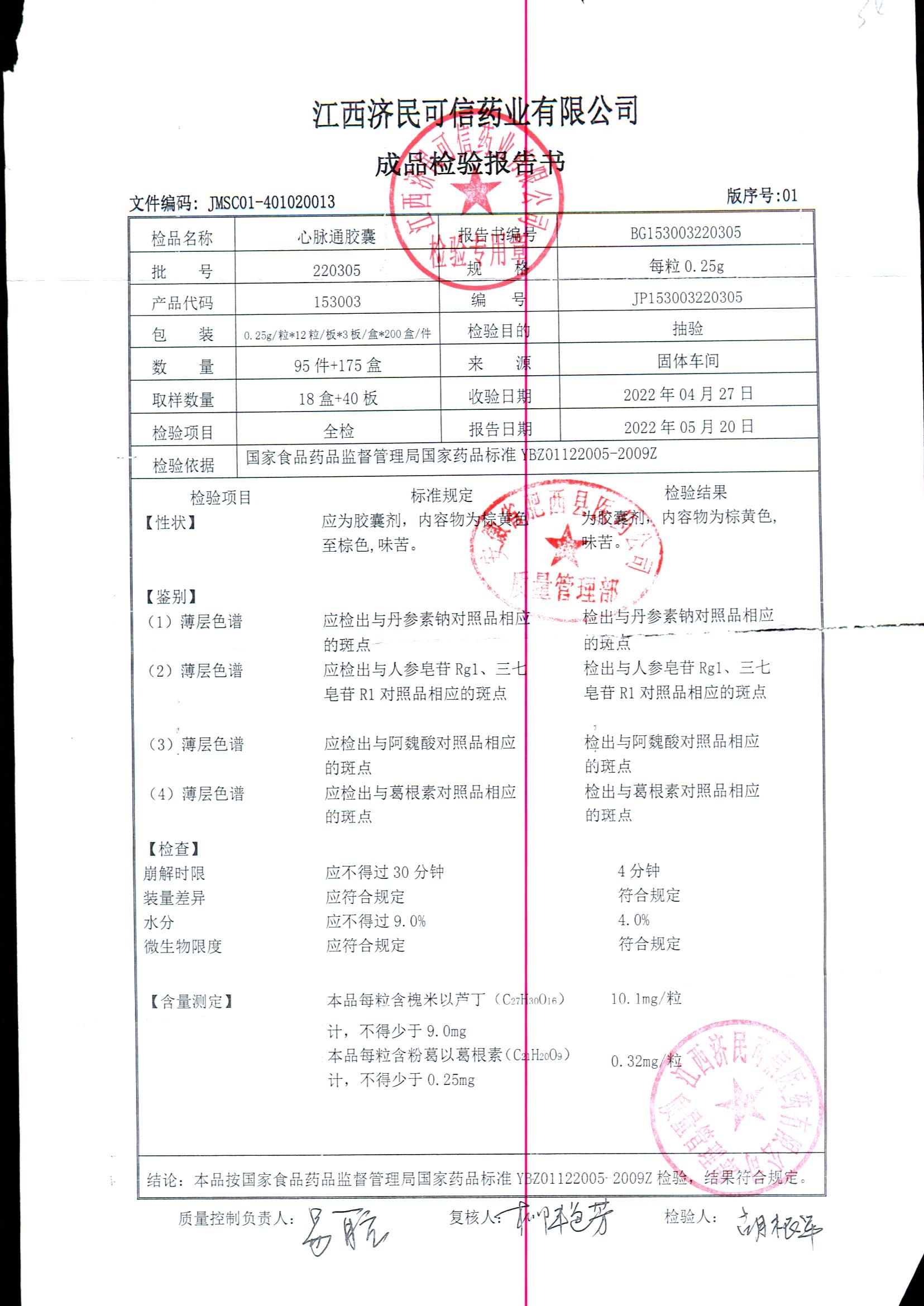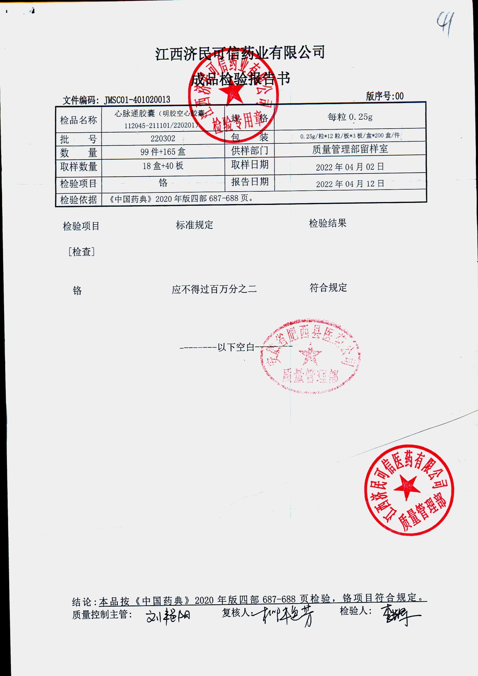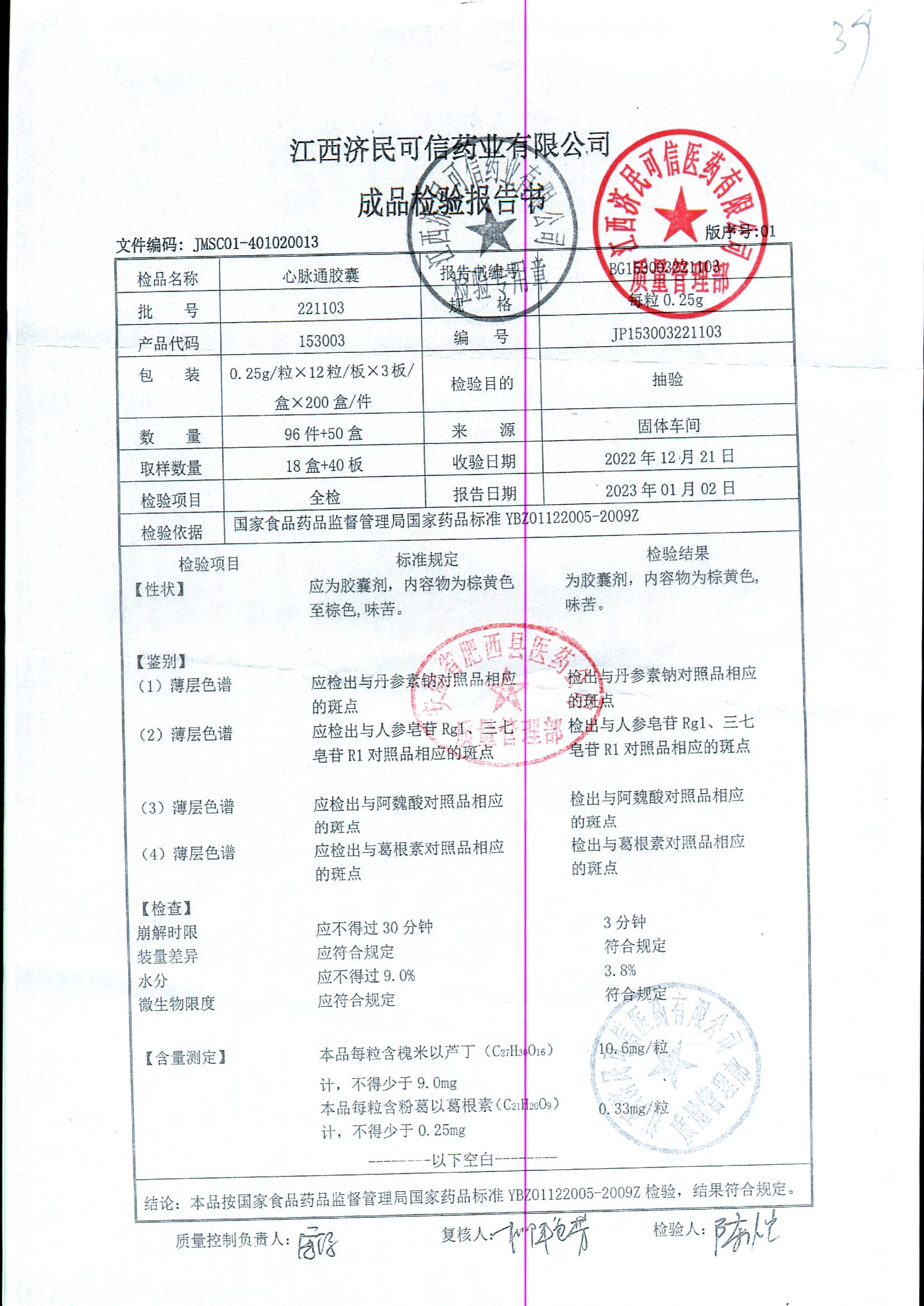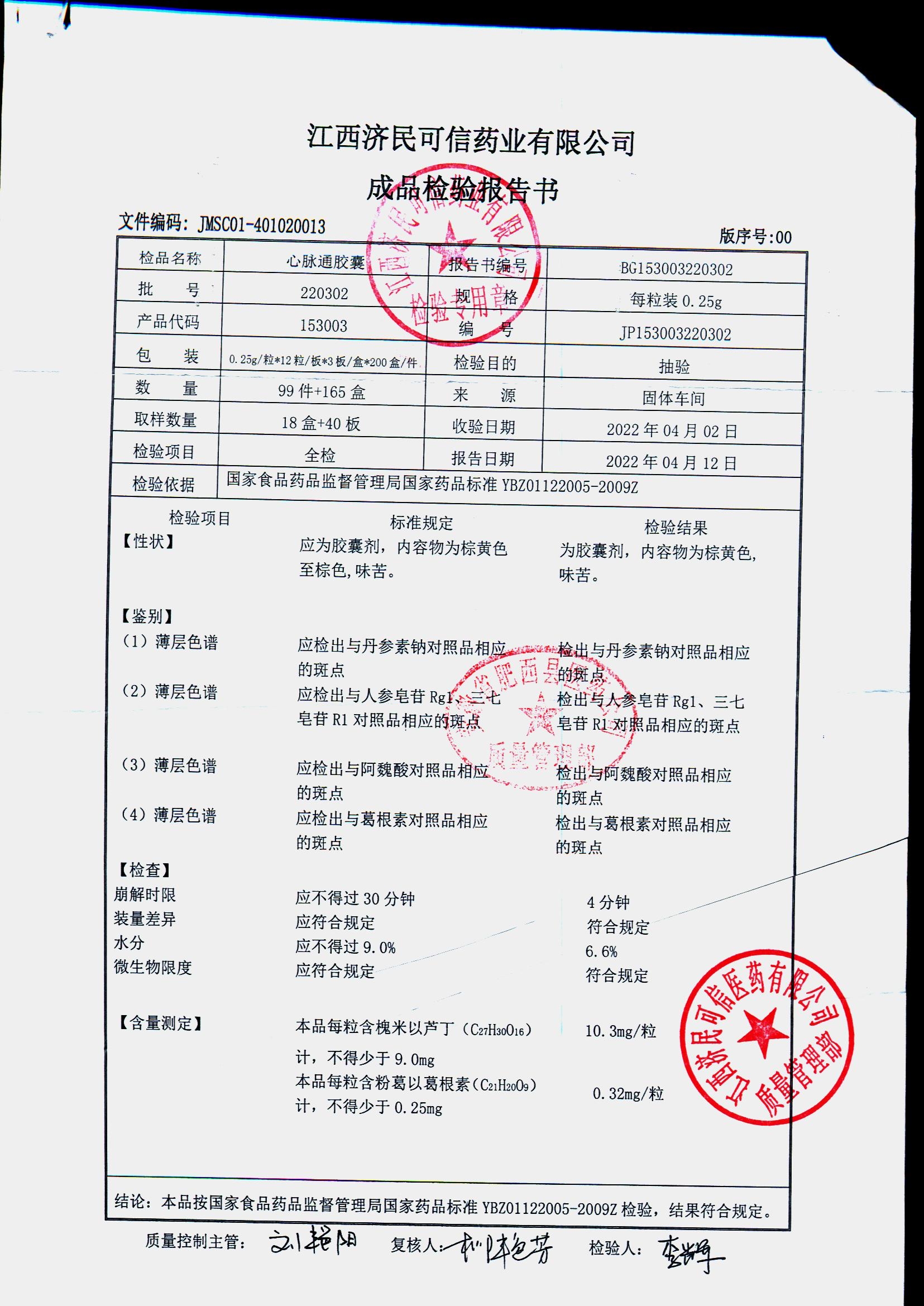 | 心脉通胶囊 | 0.25g*12s*3板 | 220302/2 | 查看详情 |
