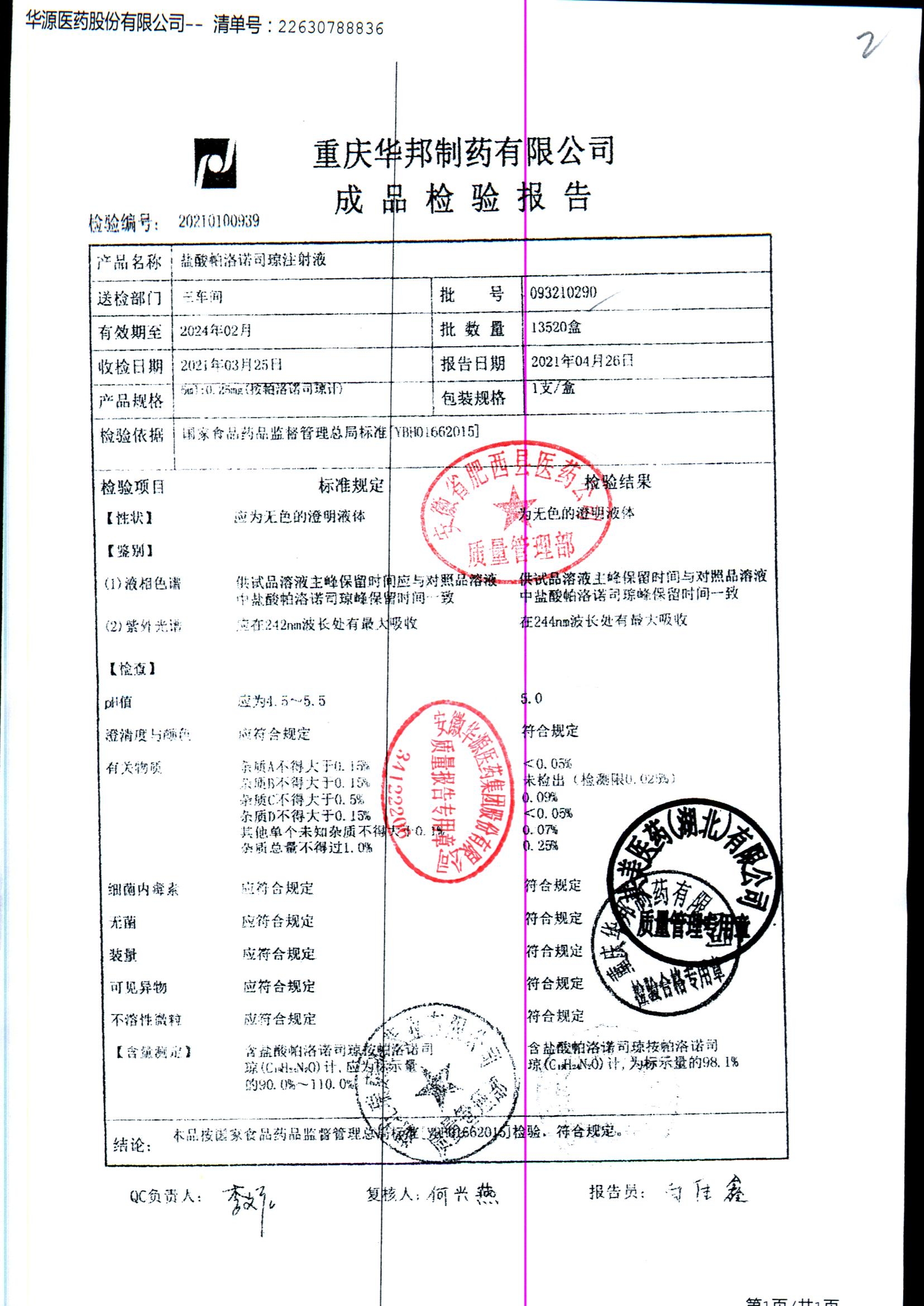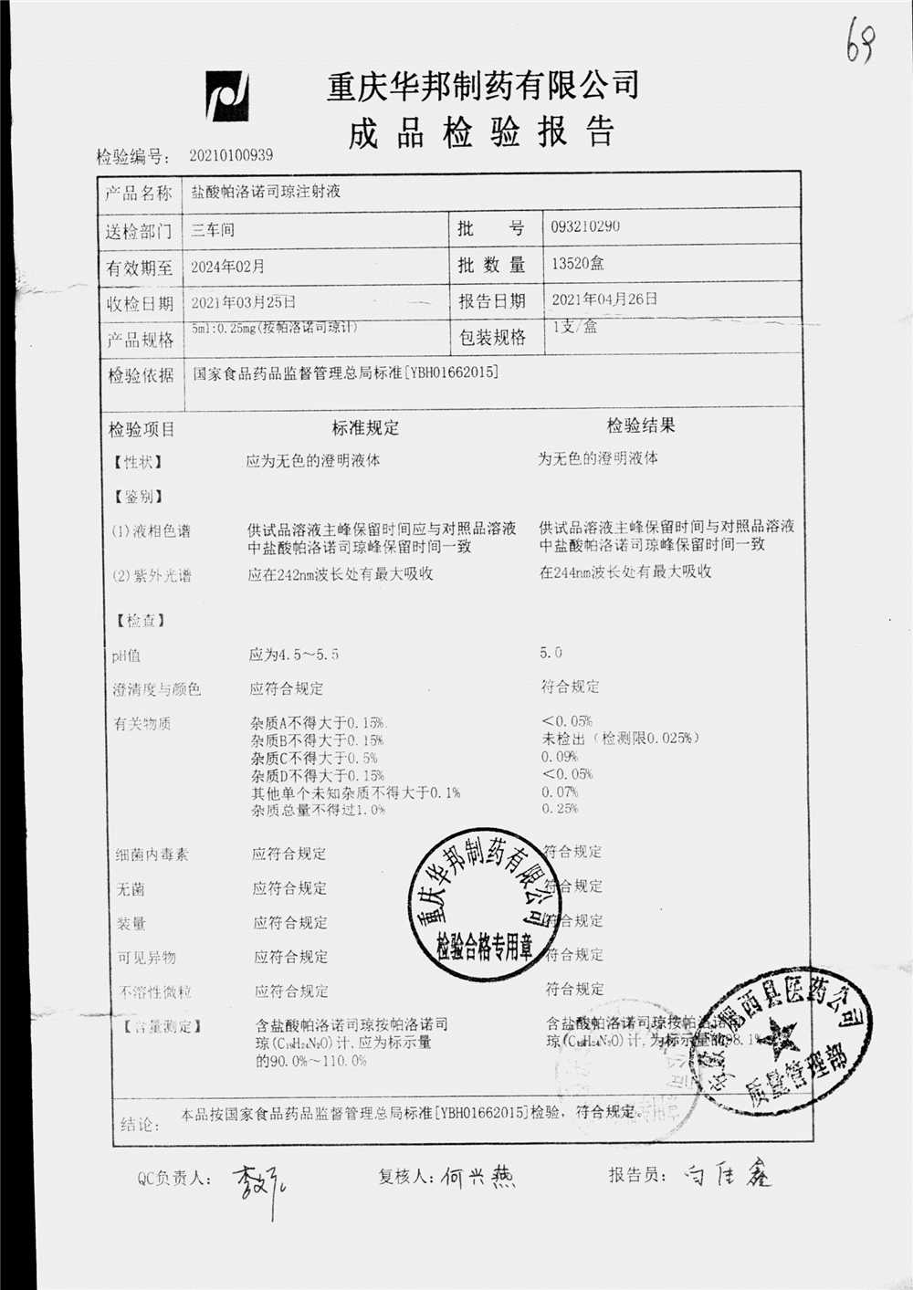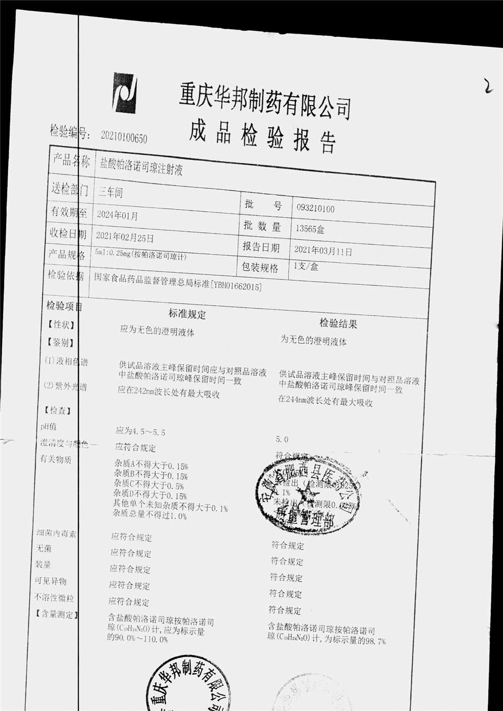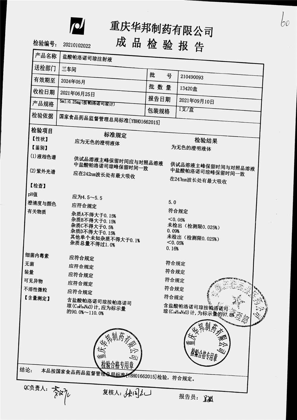 | 盐酸帕洛诺司琼注射液 | 5ml:0.25mg | 210490093 | 查看详情 |