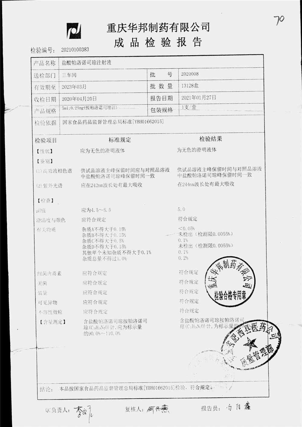 | 盐酸帕洛诺司琼注射液 | 5ml:0.25mg | 2020008 | 查看详情 |