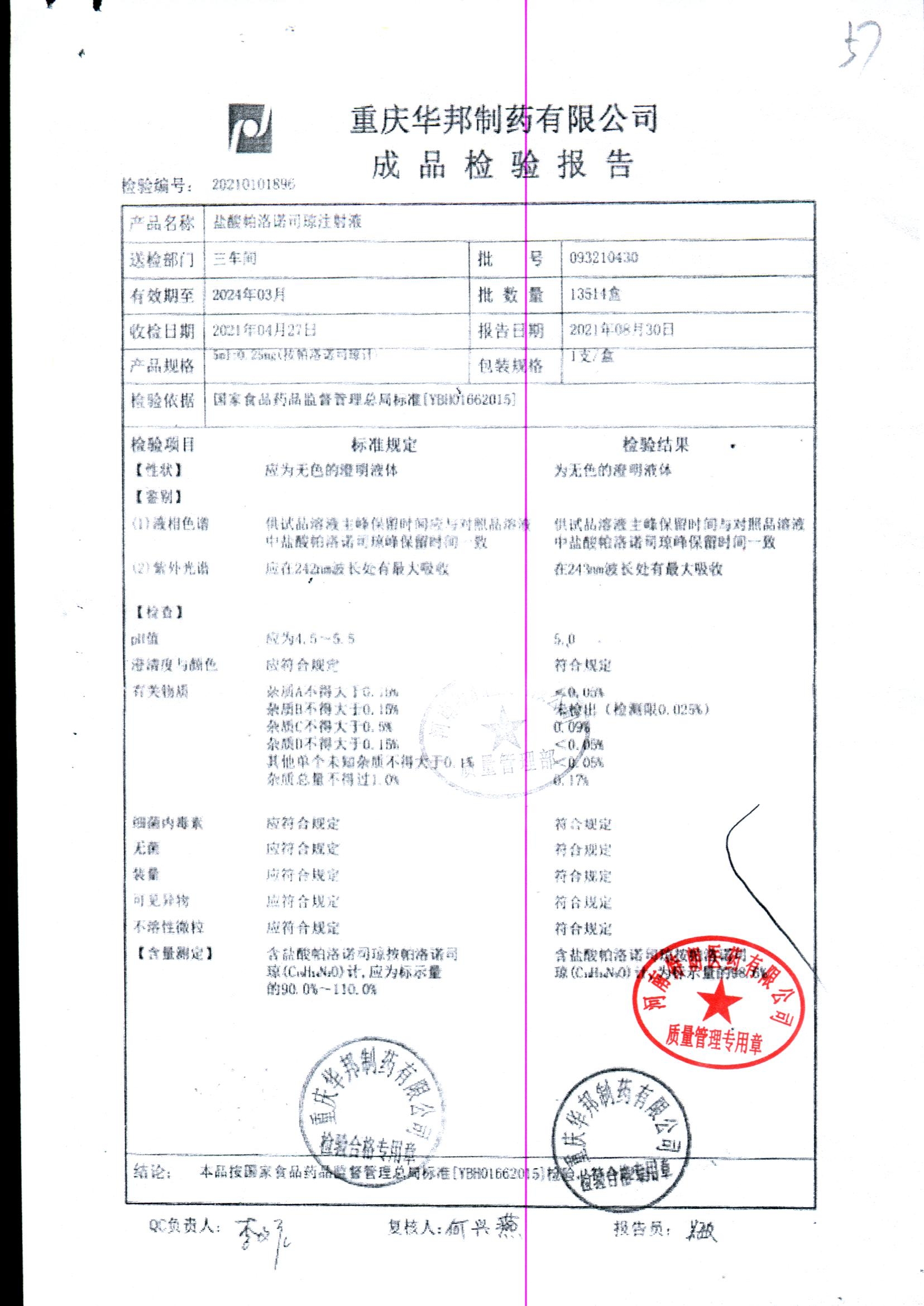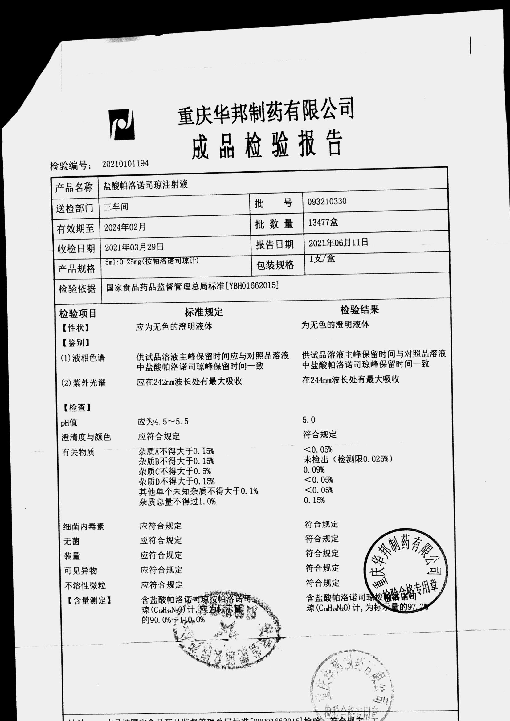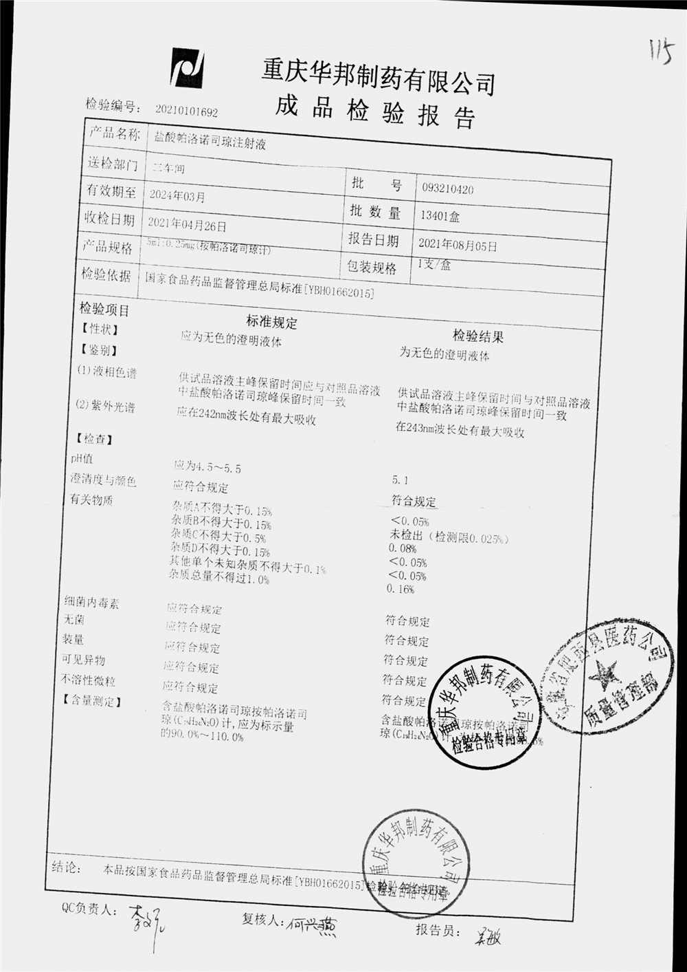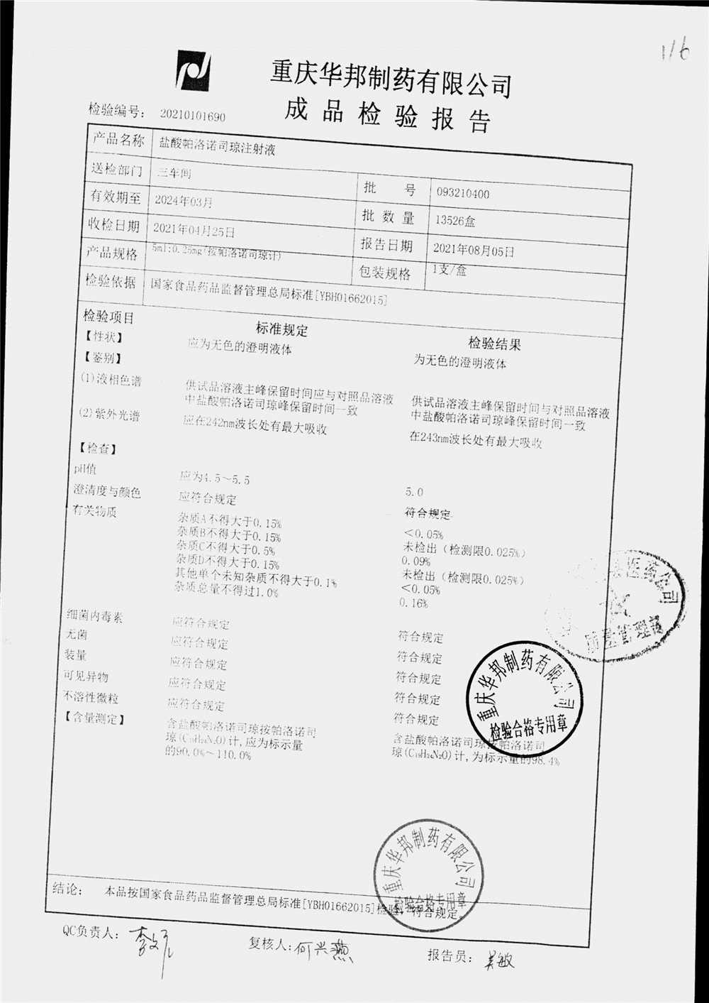 | 盐酸帕洛诺司琼注射液 | 5ml:0.25mg | 093210420 | 查看详情 |