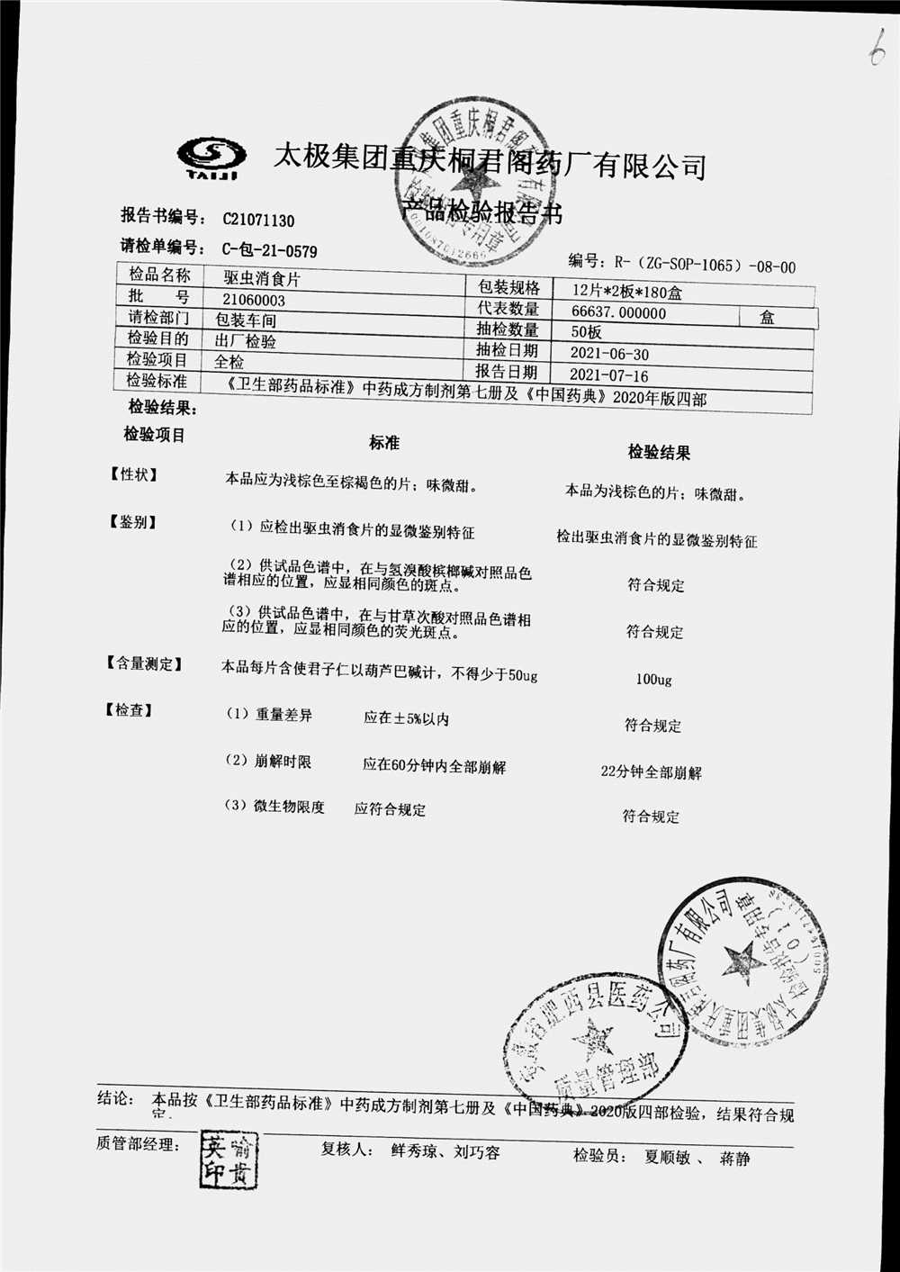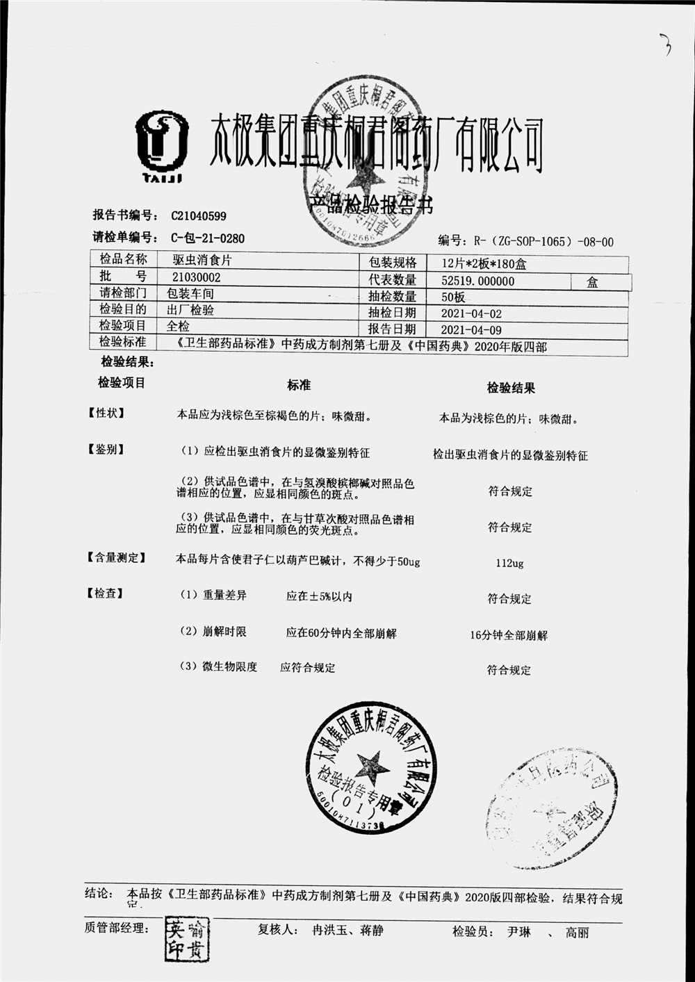 | 驱虫消食片 | 12片*2板(每片重0.4g) | 21030002 | 查看详情 |