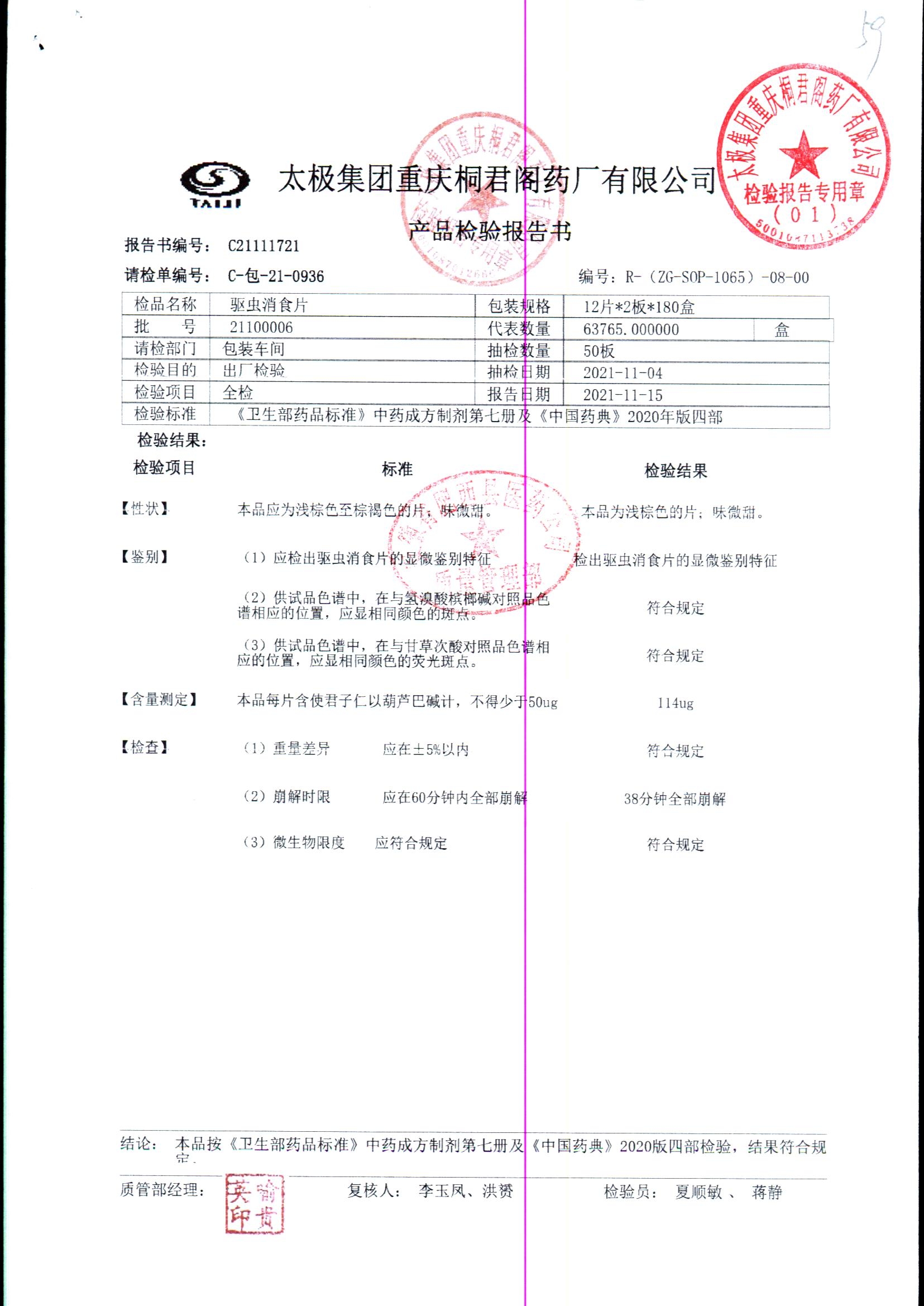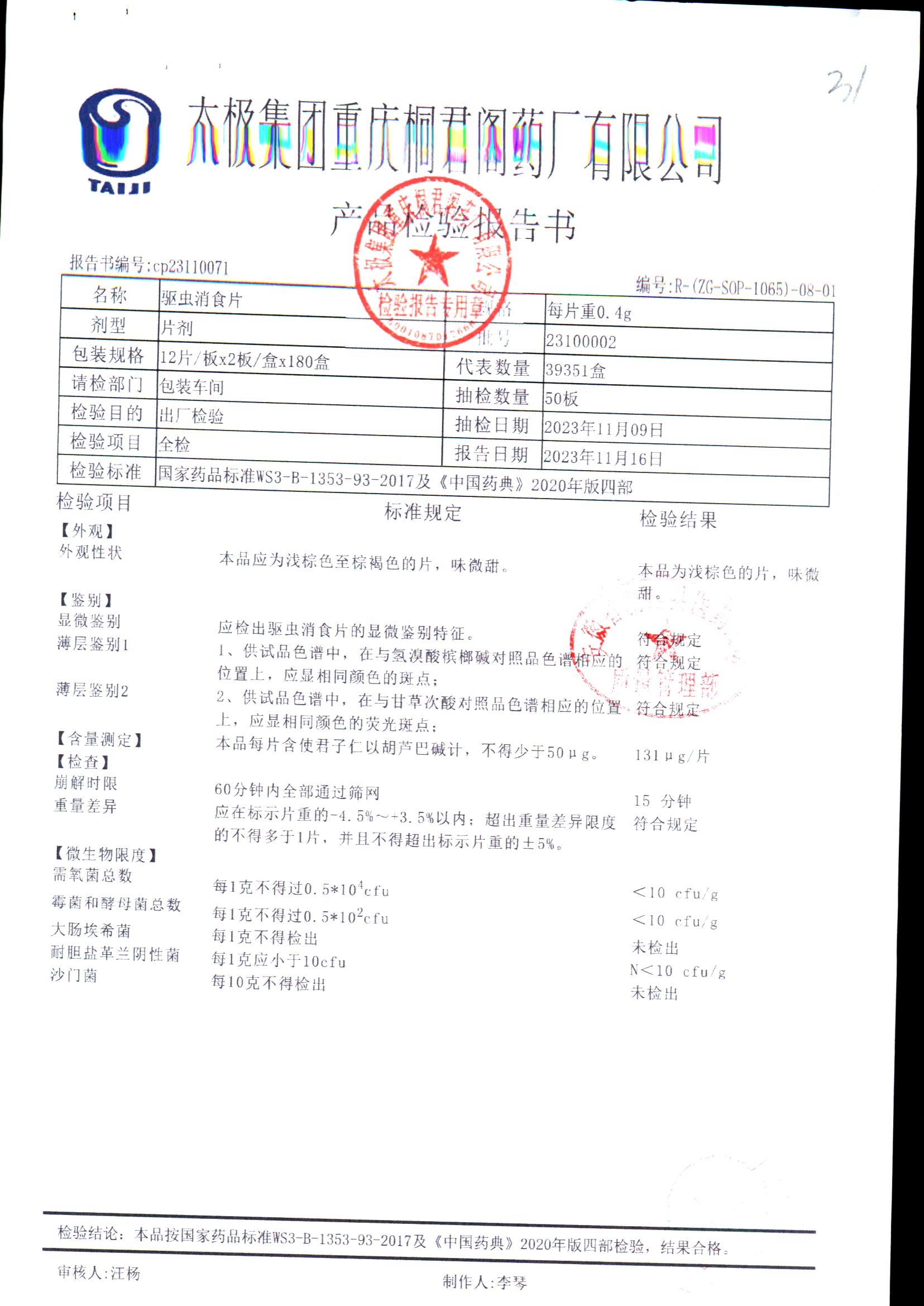 | 驱虫消食片 | 12片*2板(每片重0.4g) | 23100002 | 查看详情 |
