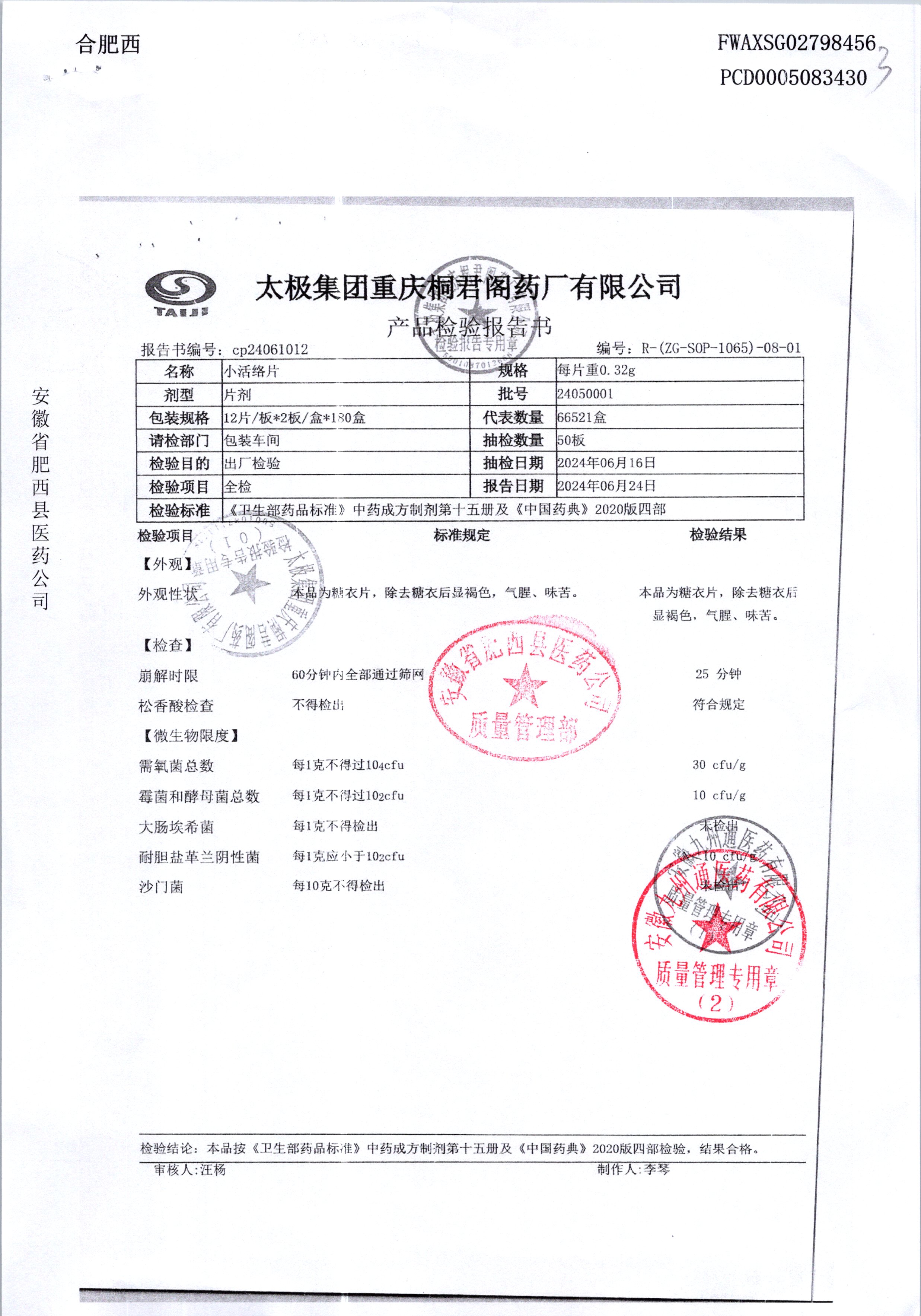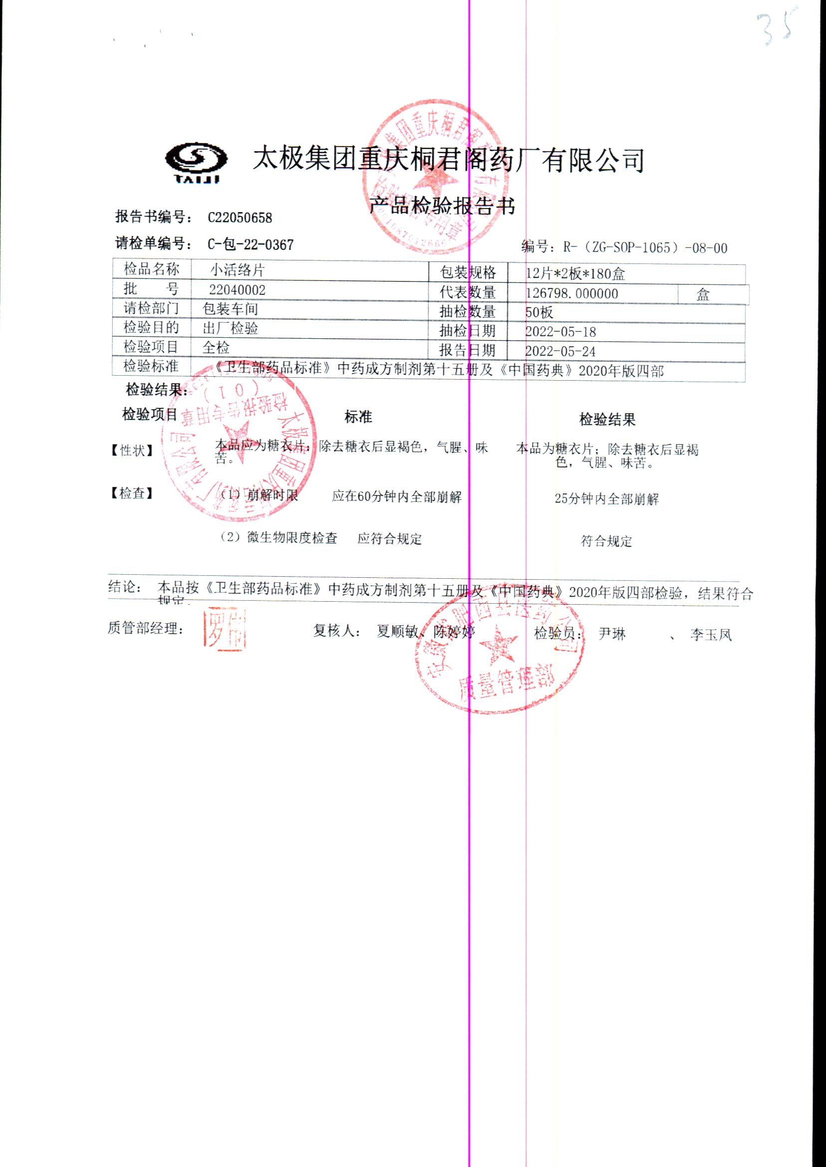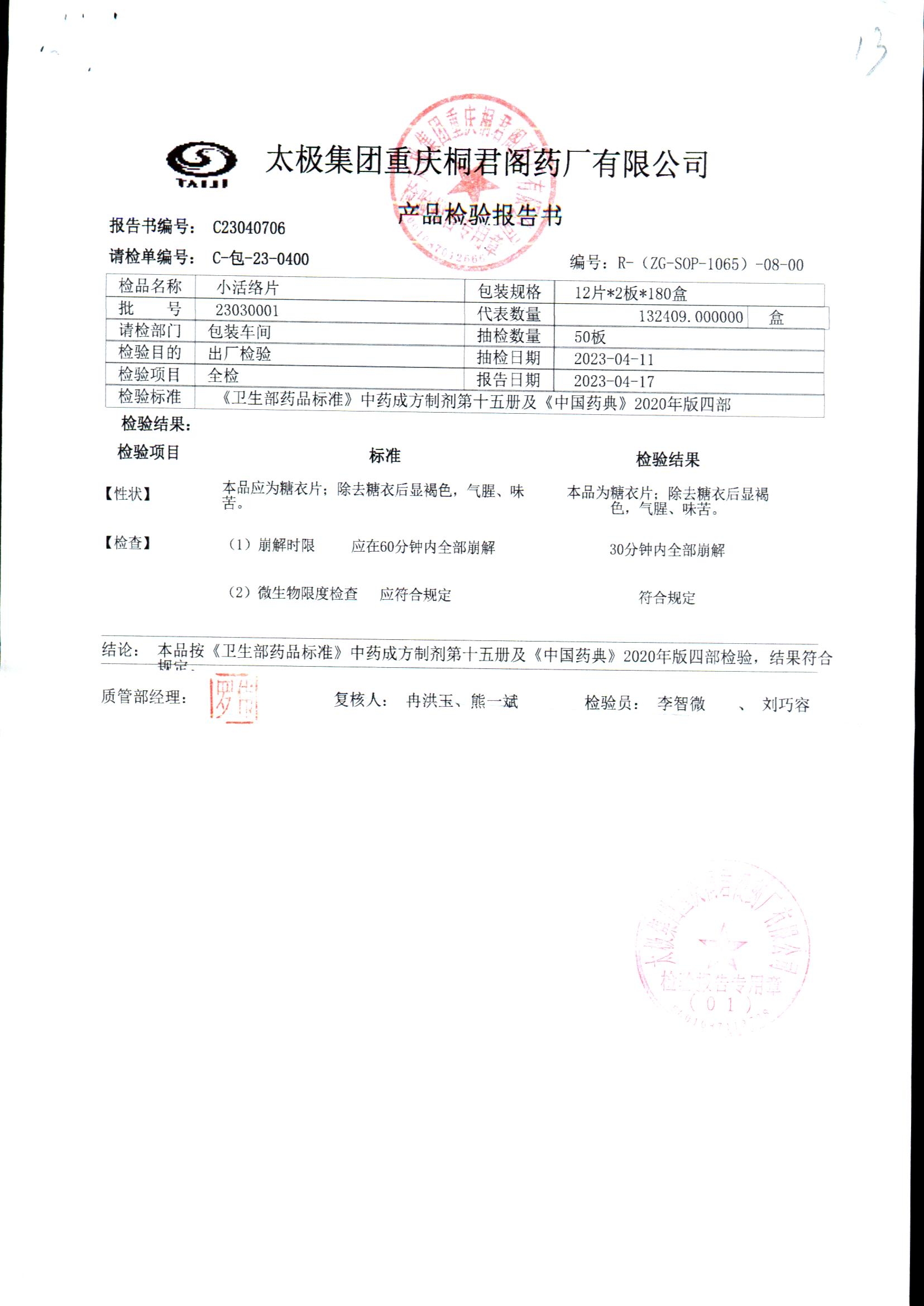 | 小活络片 | 0.32g*12片/板*2板 | 24050001/2 | 查看详情 |