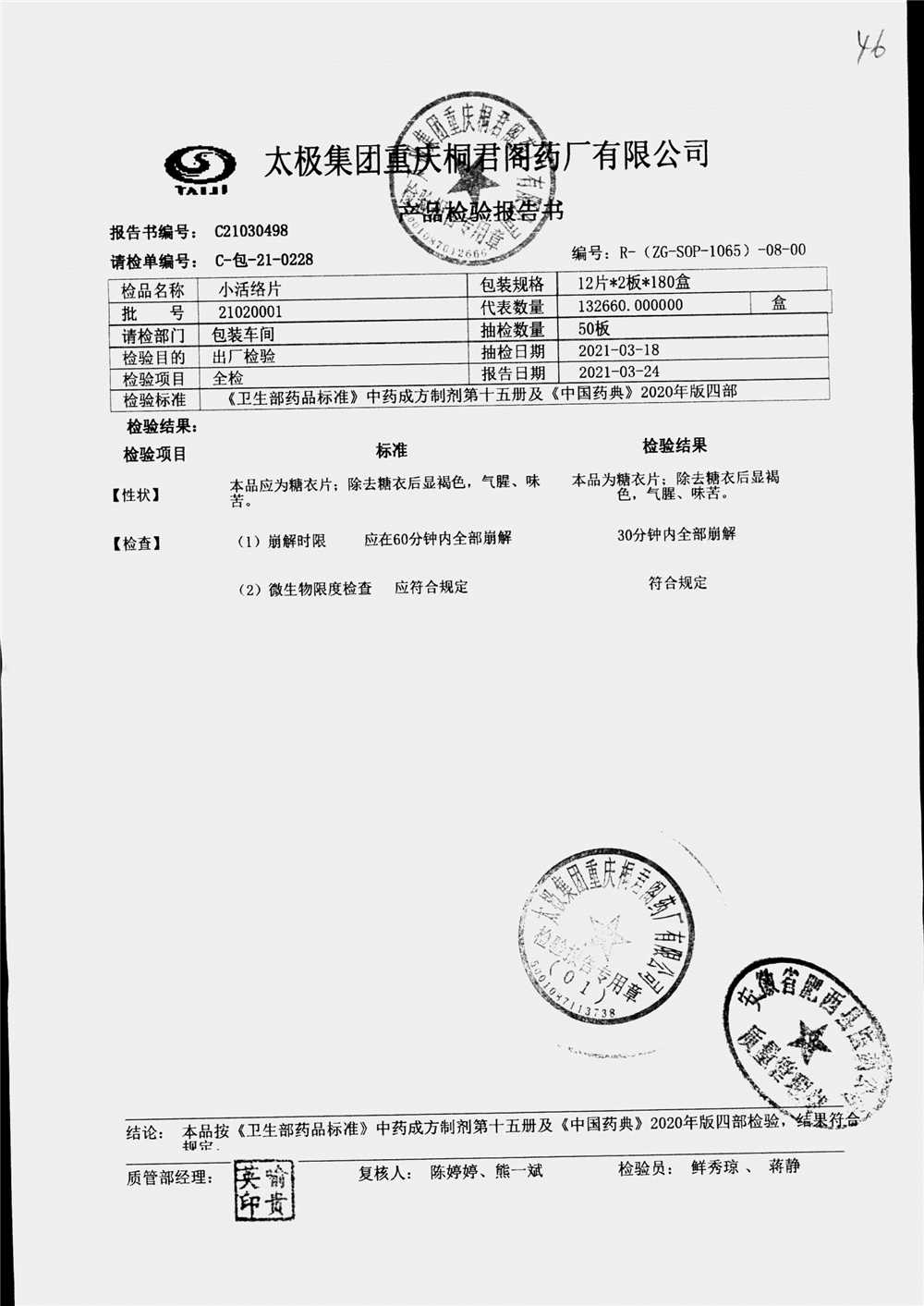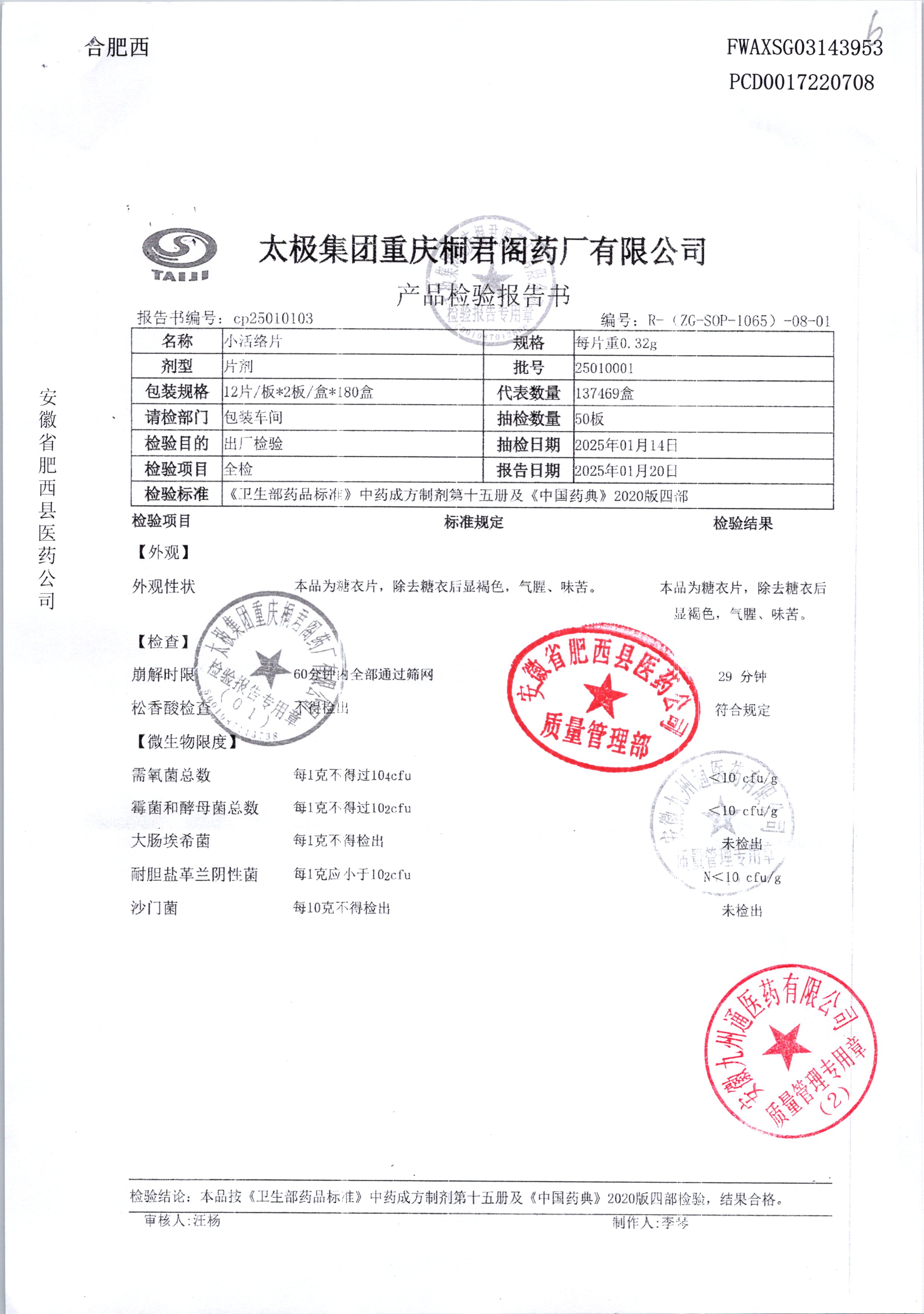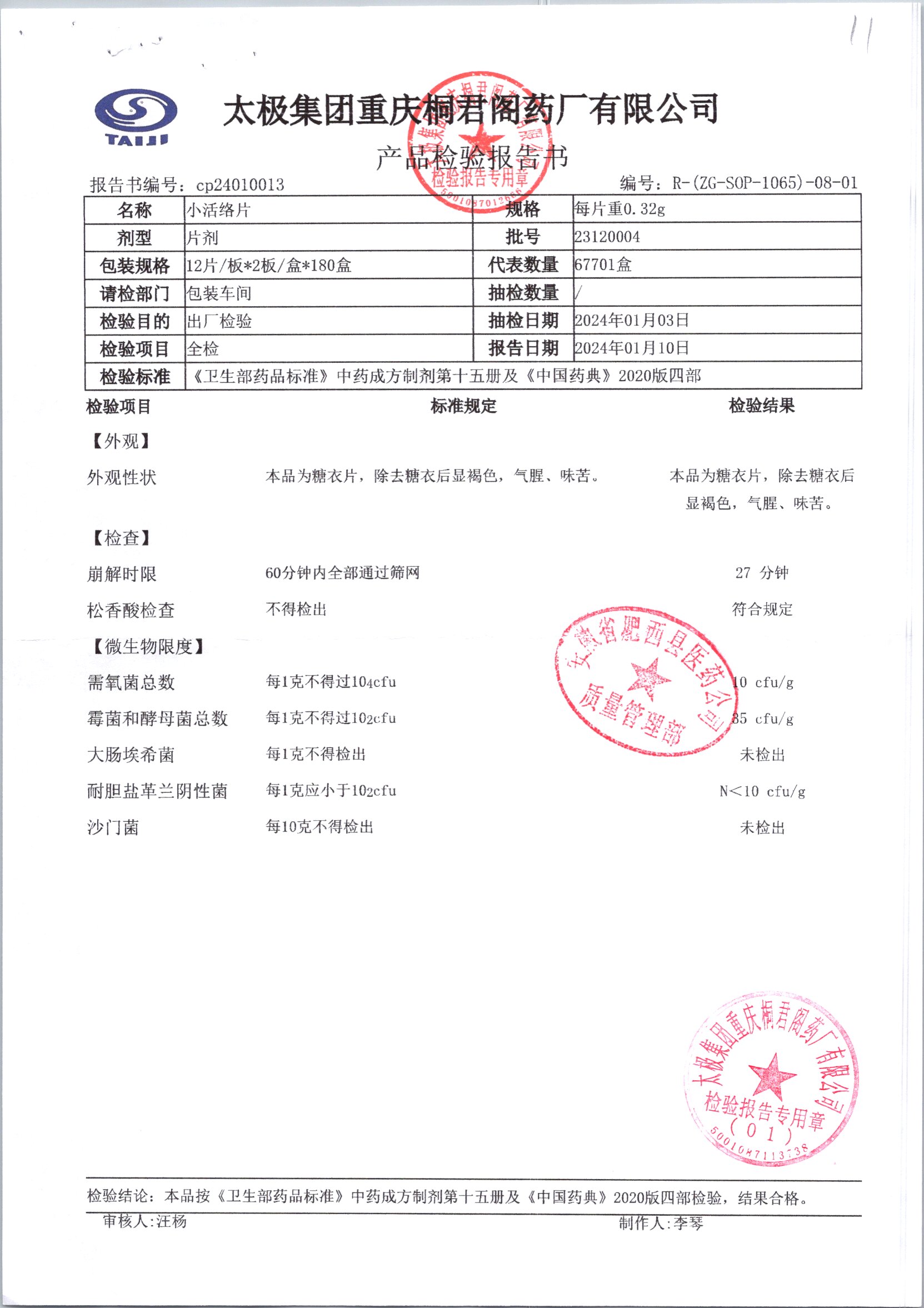 | 小活络片 | 0.32g*12片/板*2板 | 24050001/2 | 查看详情 |