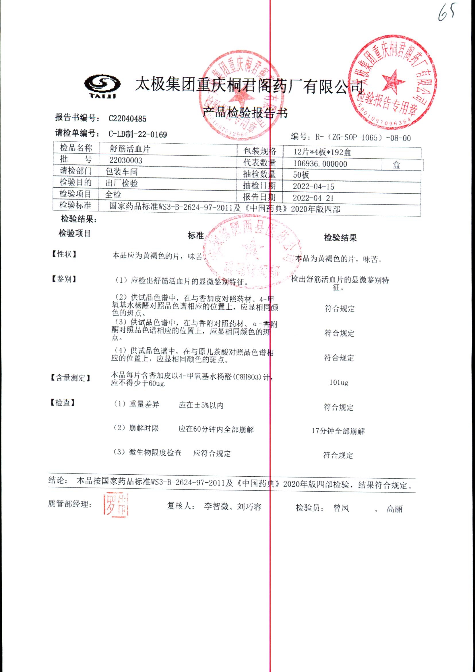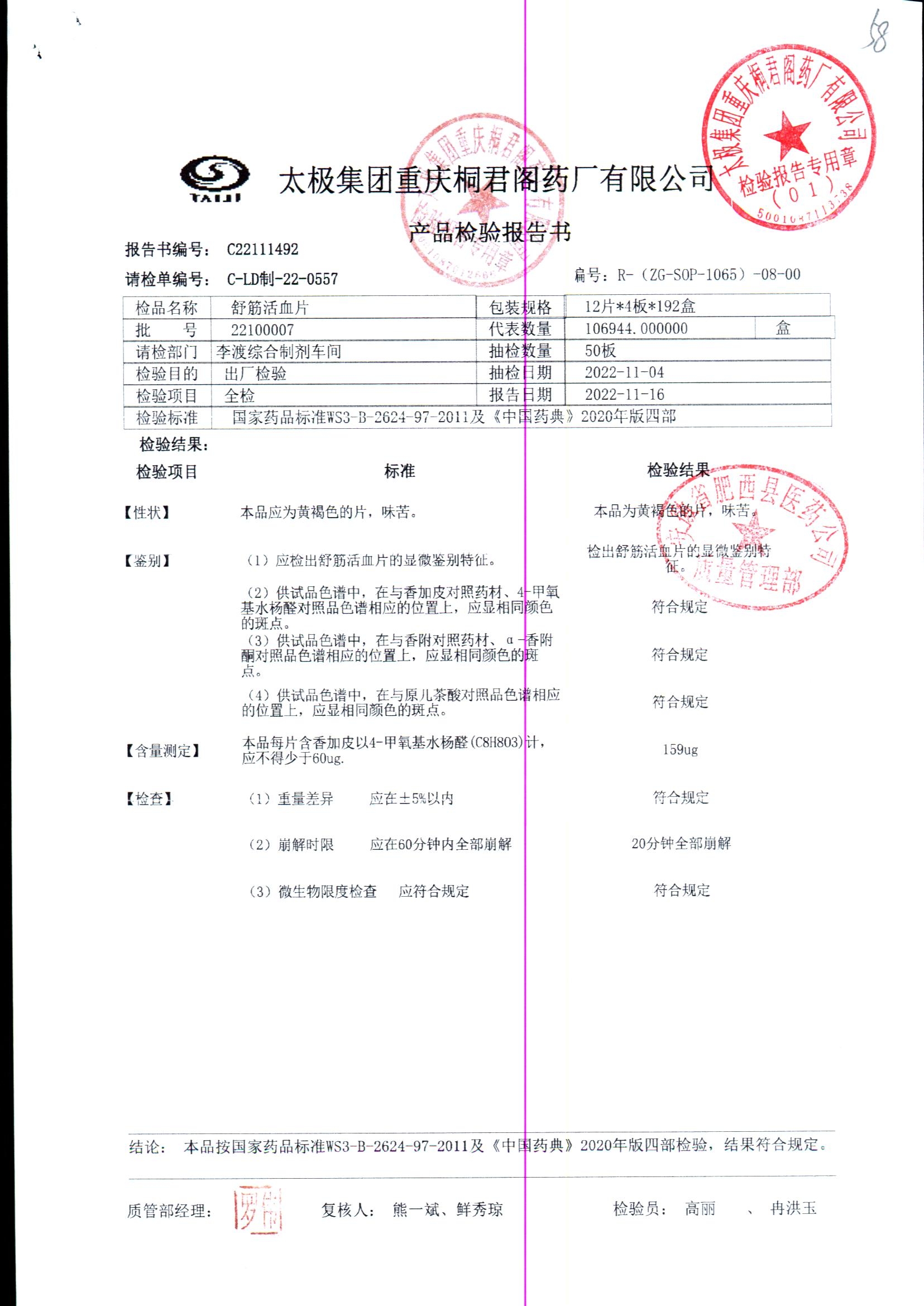 | 舒筋活血片 | 0.3g*12片/板*4板 | 22030003 | 查看详情 |