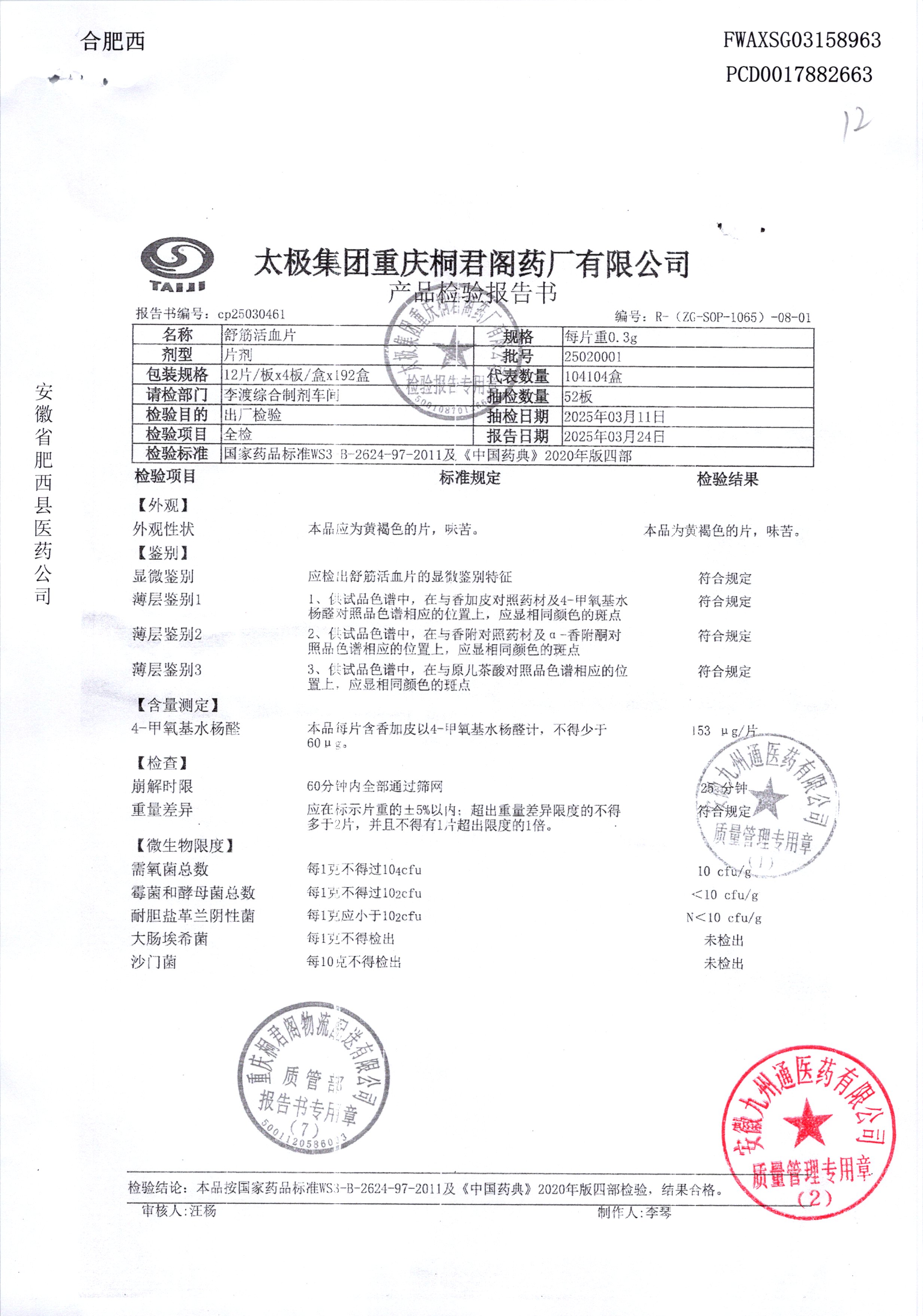 | 舒筋活血片 | 0.3g*12片/板*4板 | 20120009 | 查看详情 |