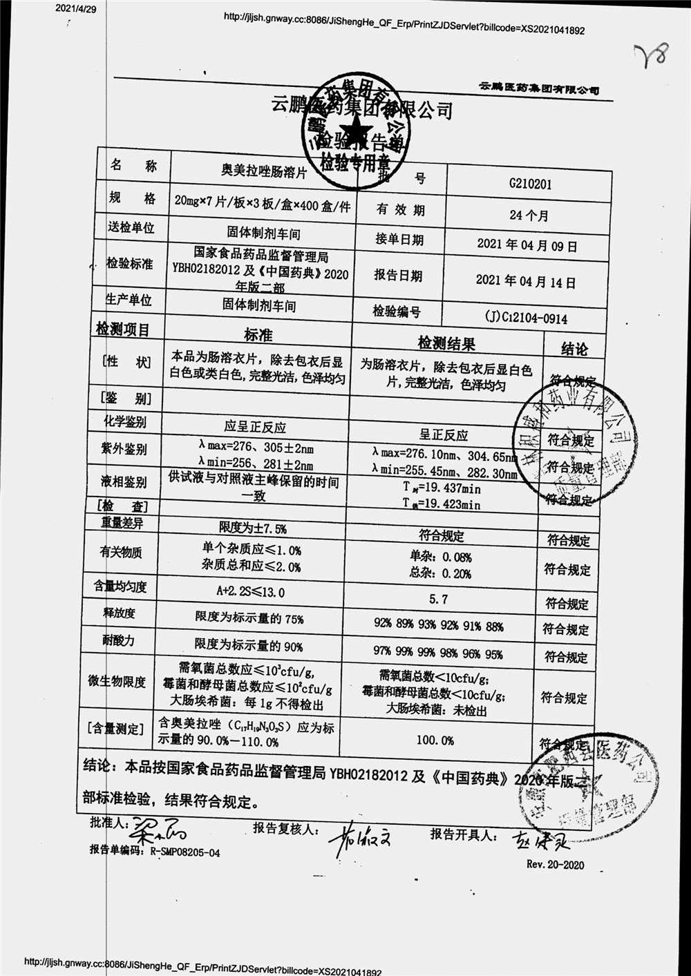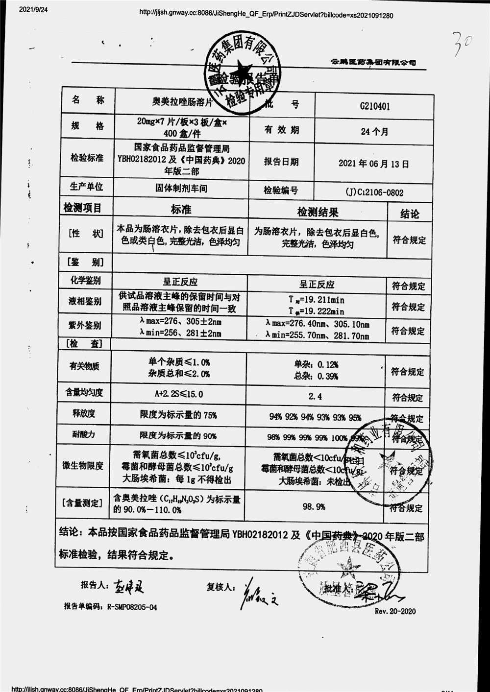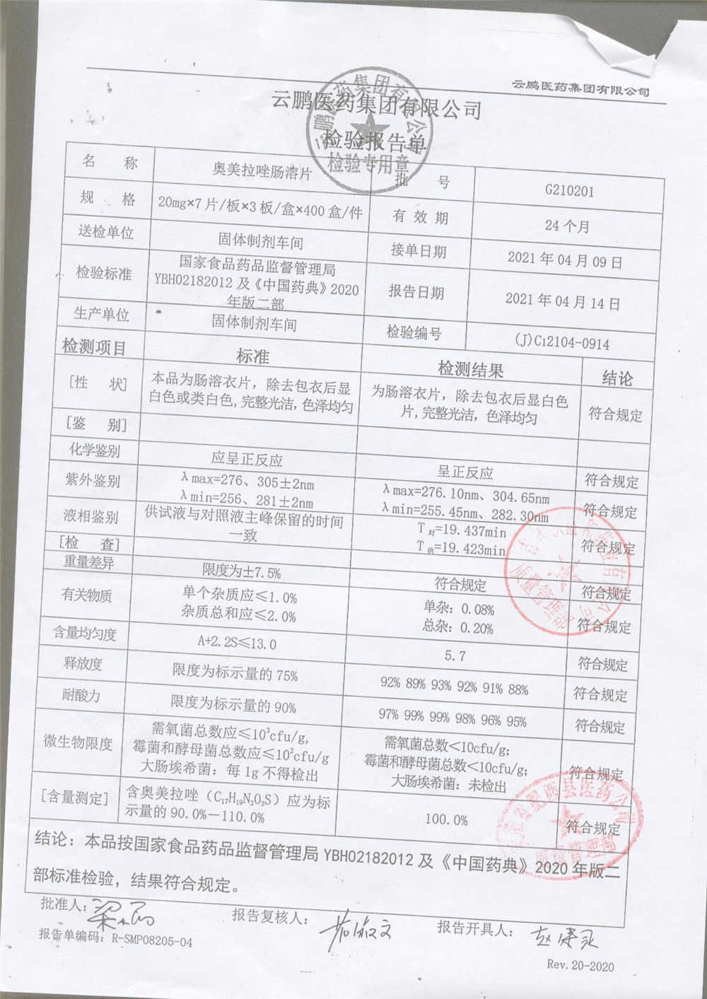 | 奥美拉唑肠溶片 | 20mg*7片*3板 | G210401 | 查看详情 |