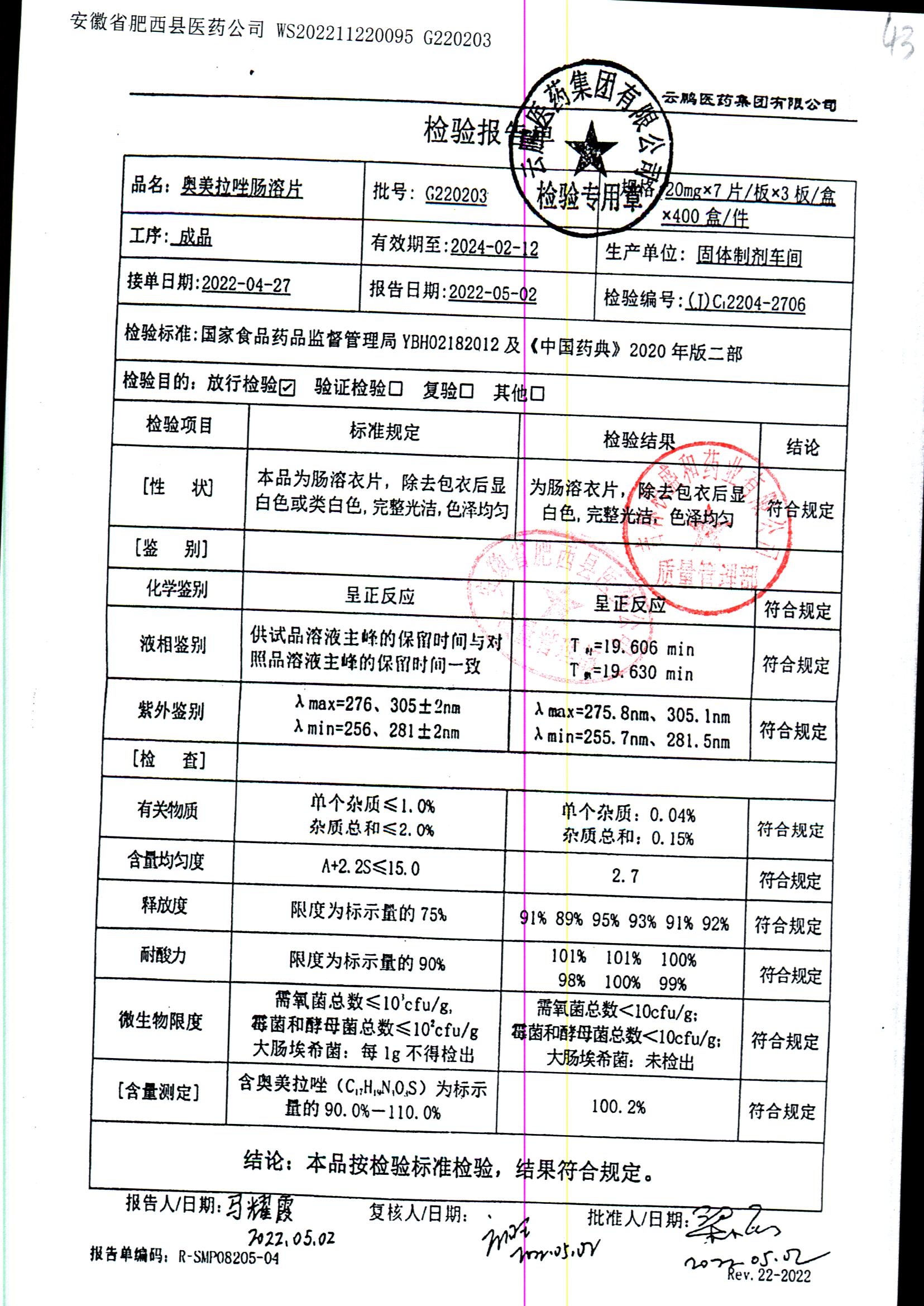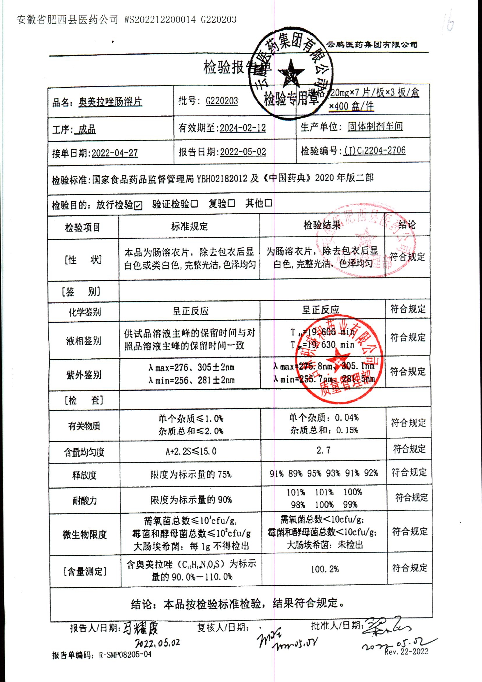| 奥美拉唑肠溶片 | 20mg*7片*3板 | G220203 | 查看详情 |