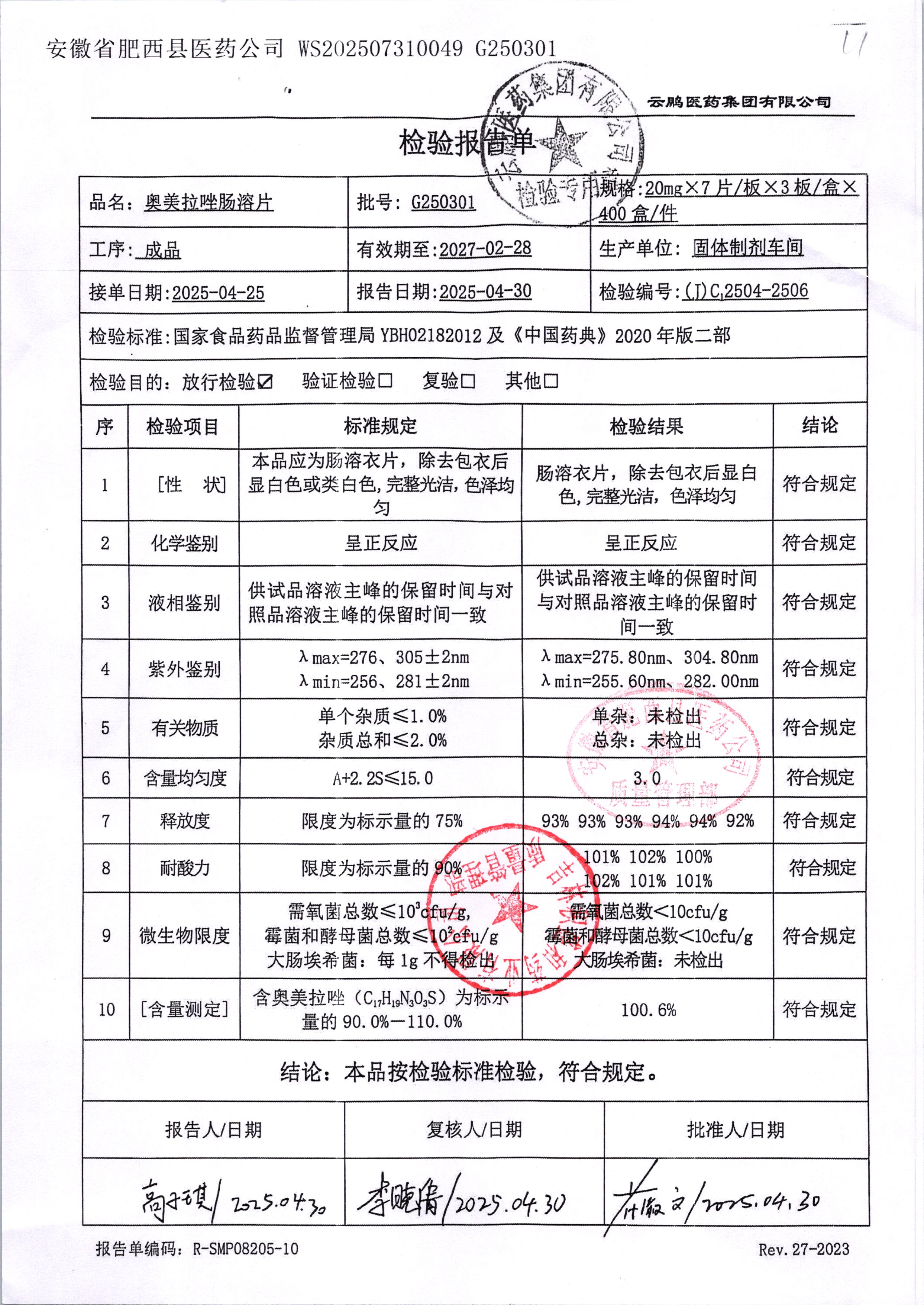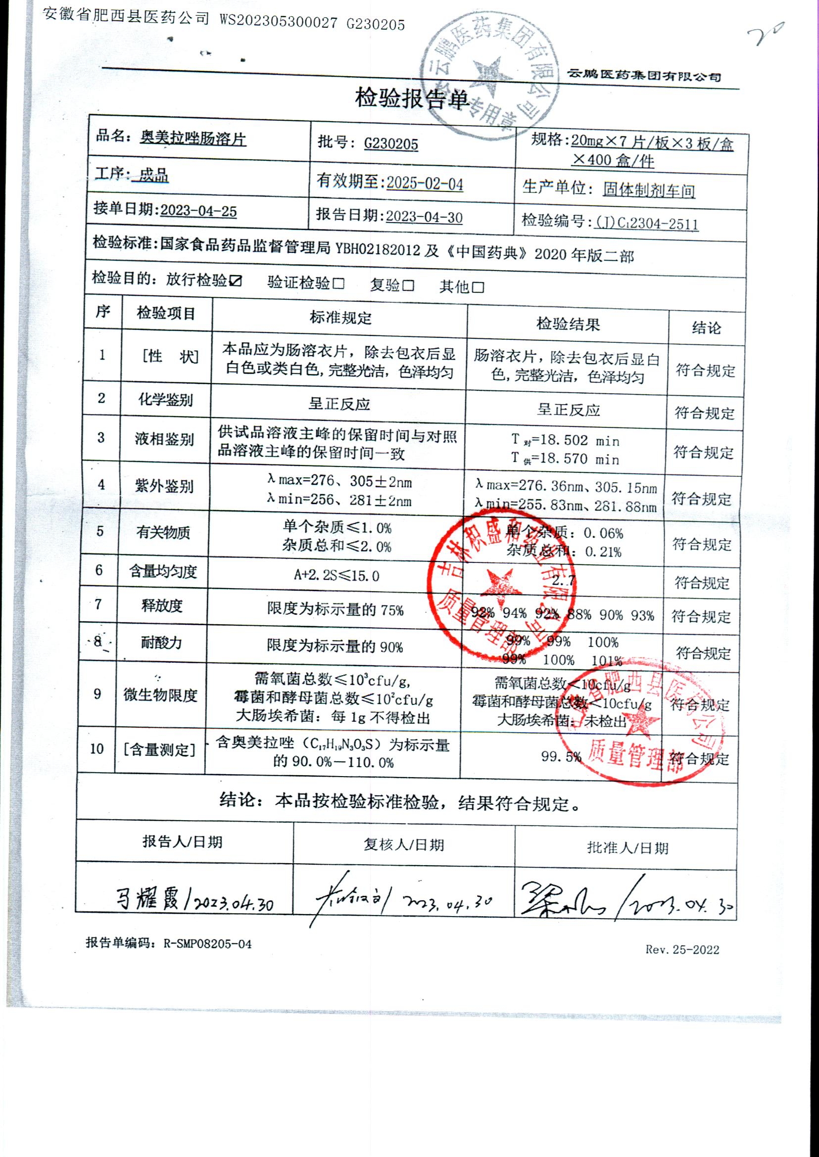 | 奥美拉唑肠溶片 | 20mg*7片*3板 | G250301 | 查看详情 |