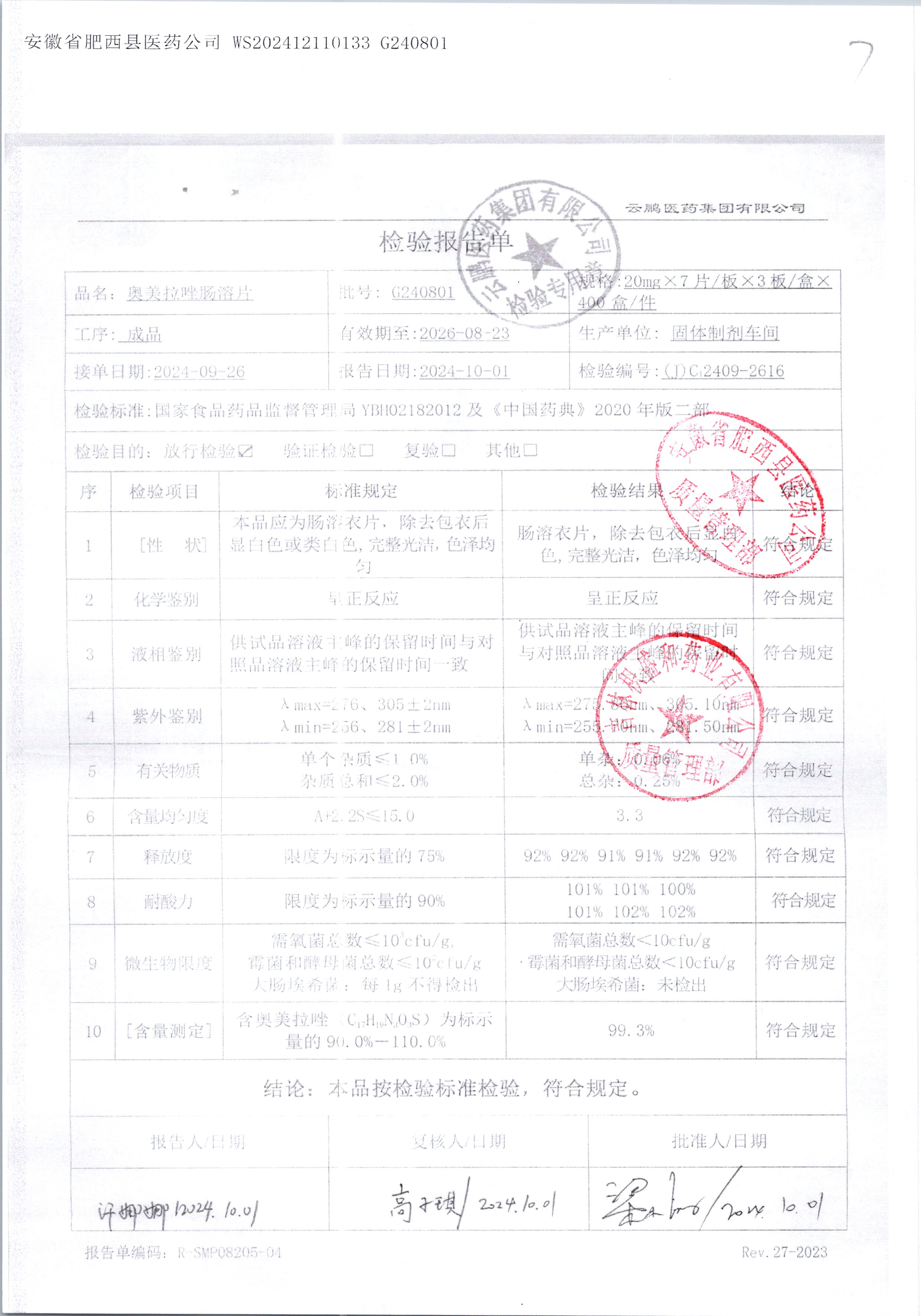 | 奥美拉唑肠溶片 | 20mg*7片*3板 | G240801 | 查看详情 |