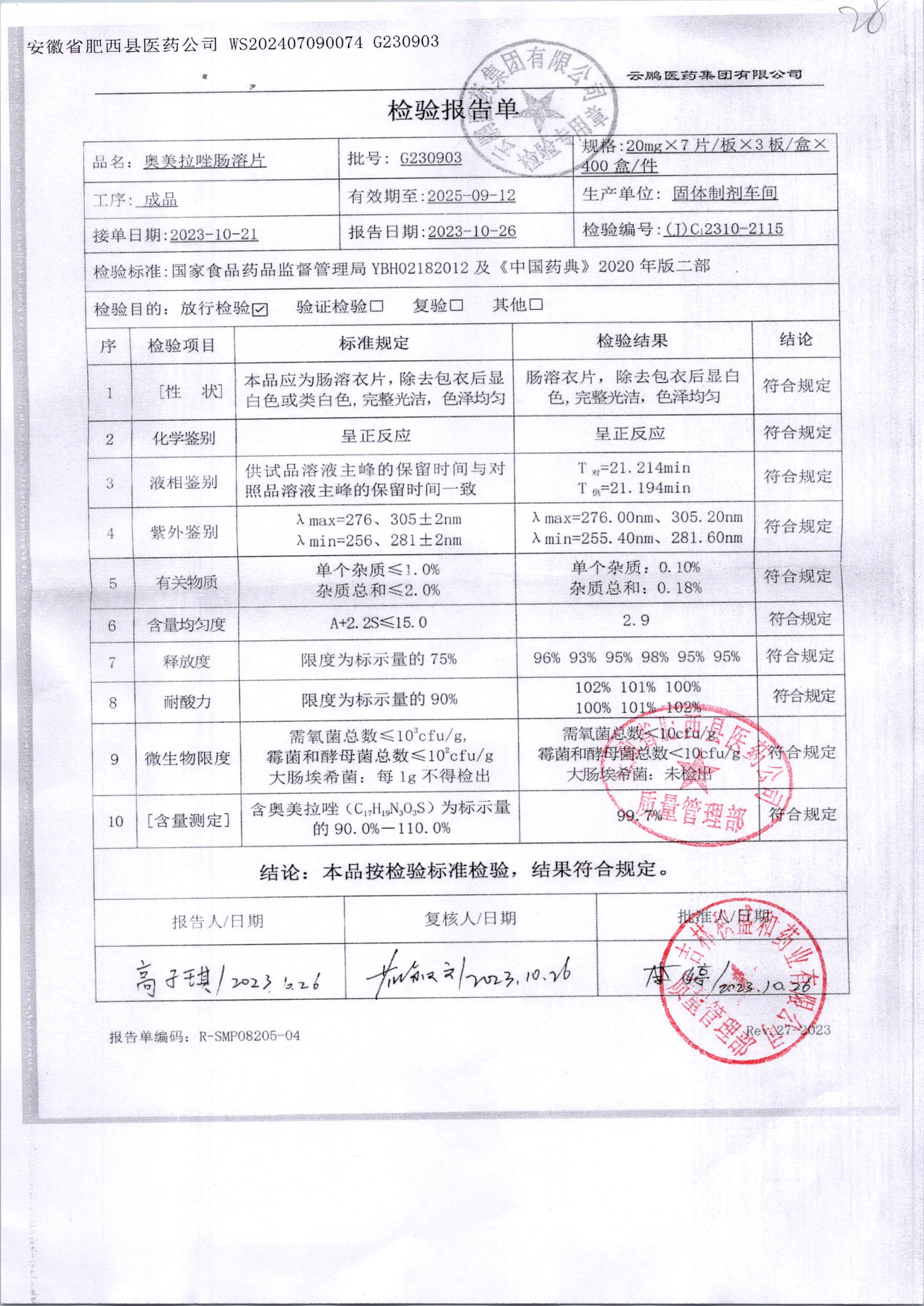 | 奥美拉唑肠溶片 | 20mg*7片*3板 | G230903 | 查看详情 |