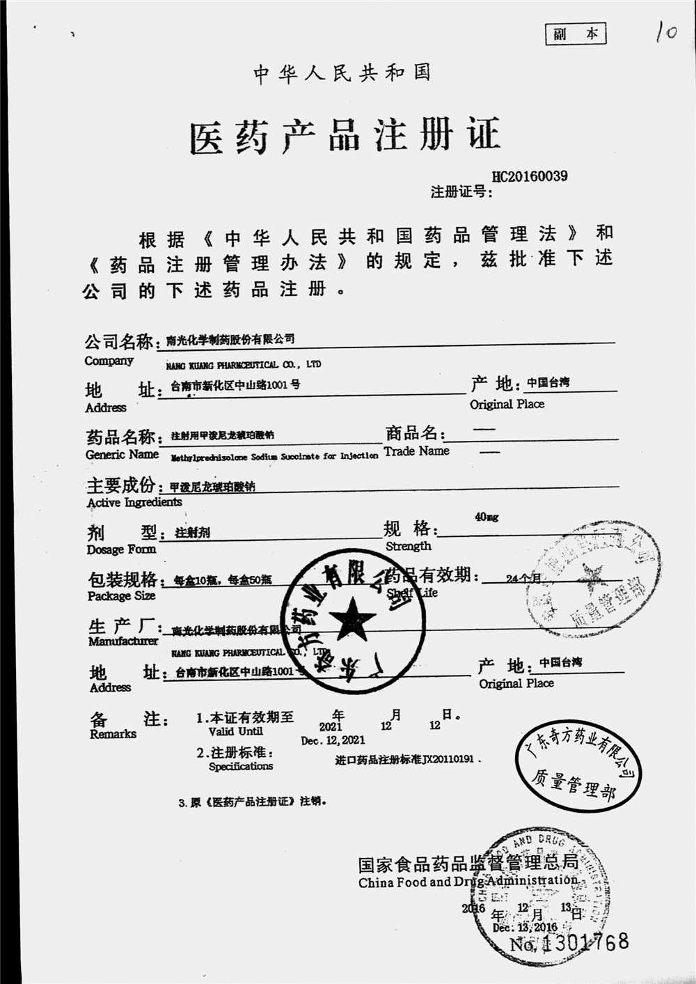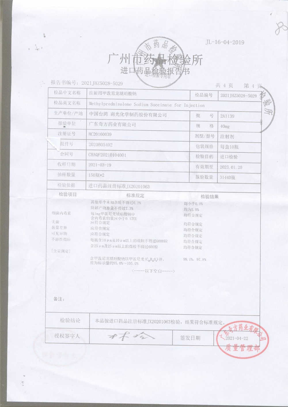 | 注射用甲泼尼龙琥珀酸钠 | 40mg(10瓶装) | 2A1139(5/5) | 查看详情 |