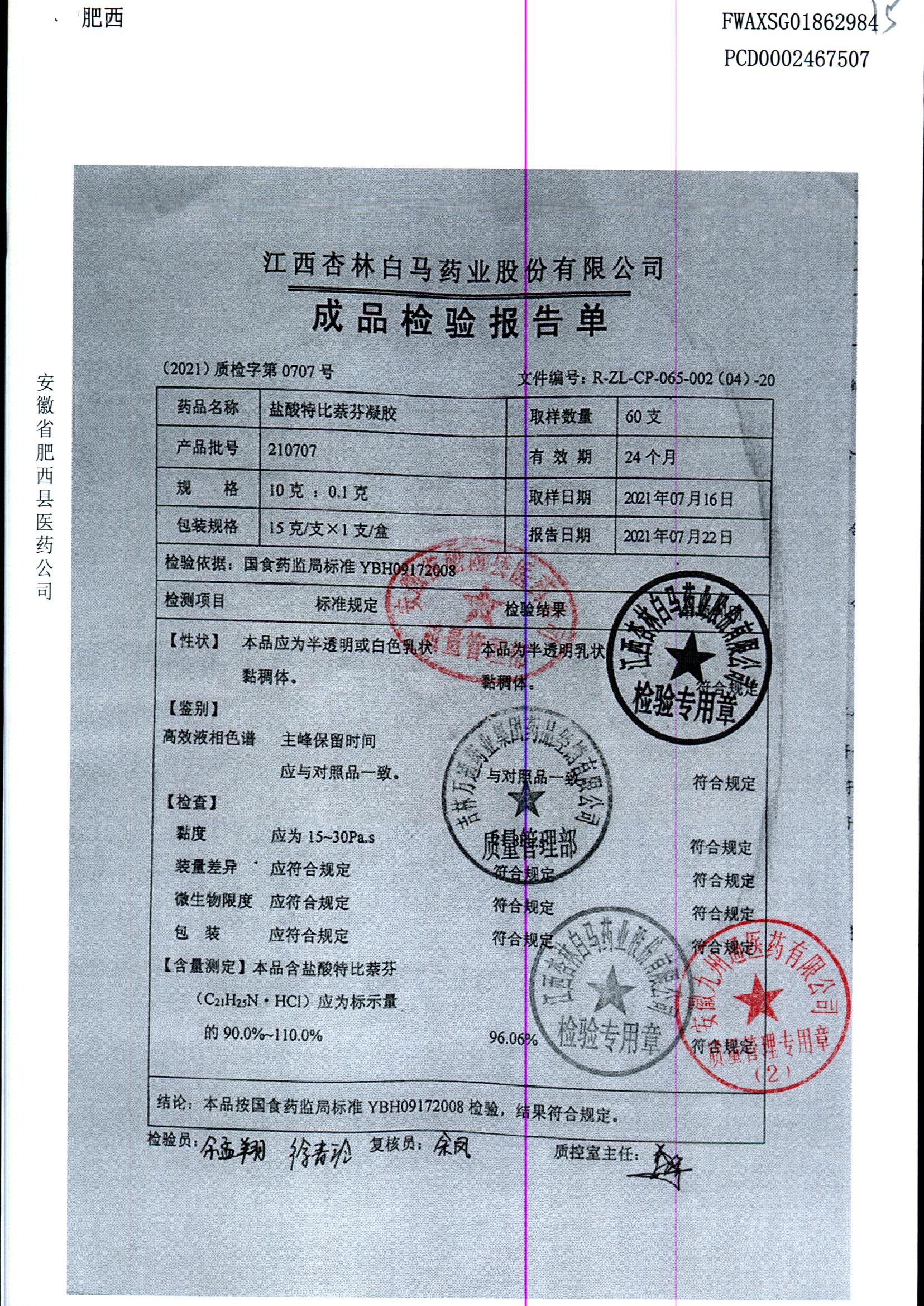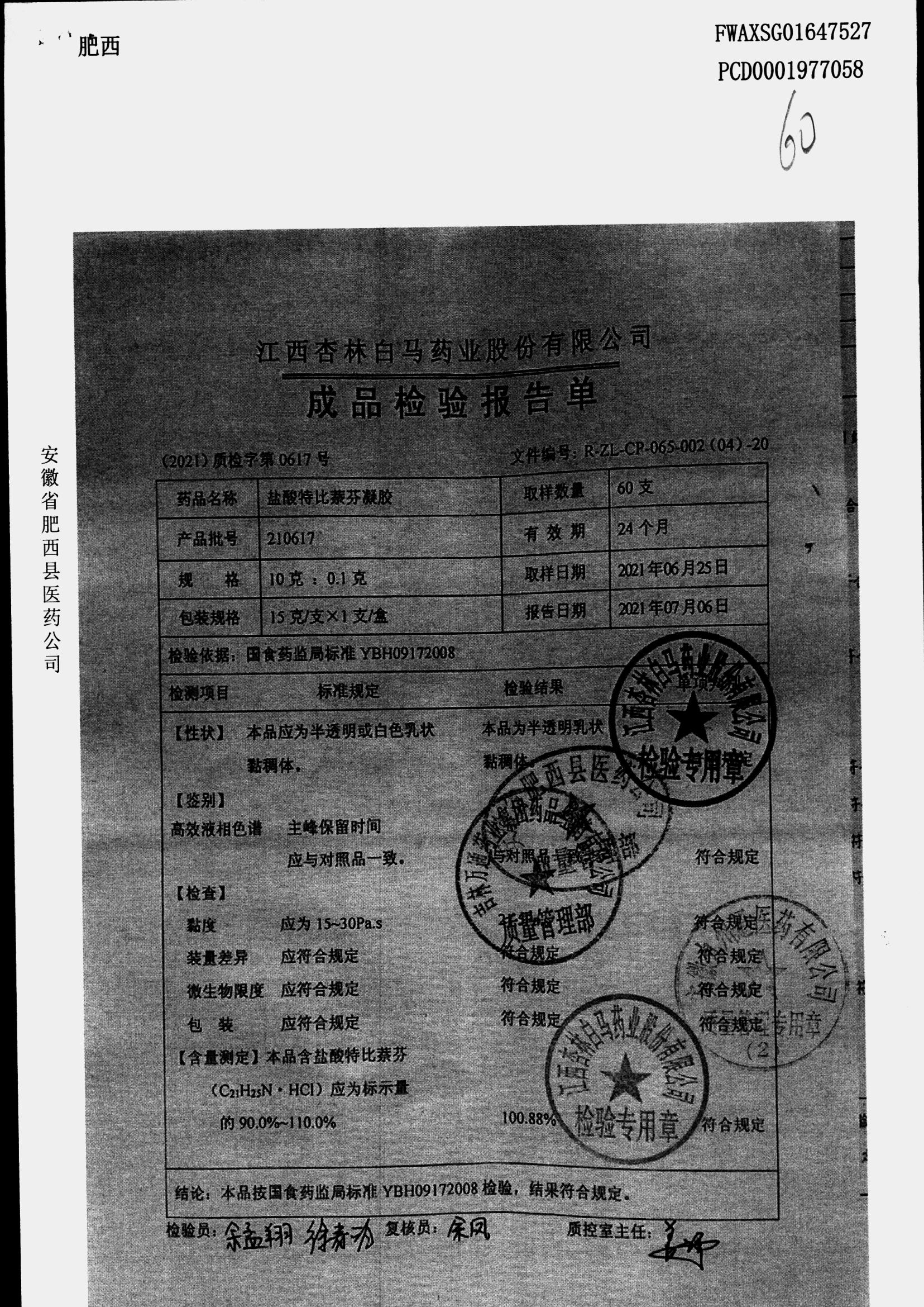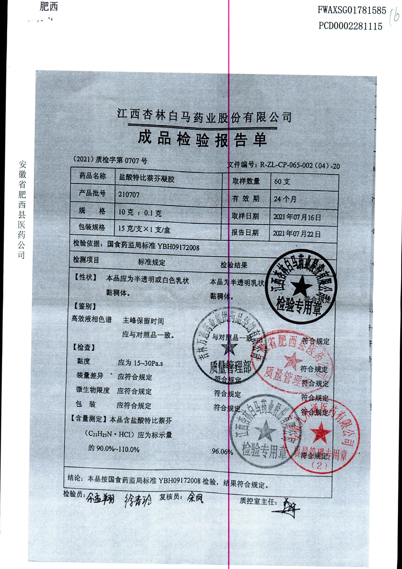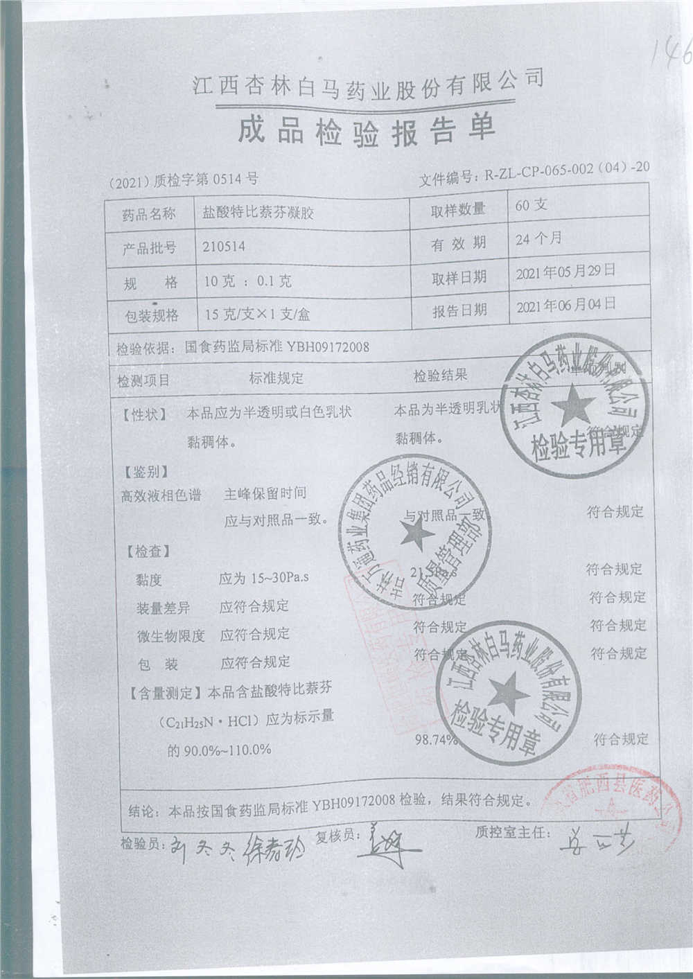 | 盐酸特比萘芬凝胶 | 15g( 10克:0.1克 ) | 210617 | 查看详情 |