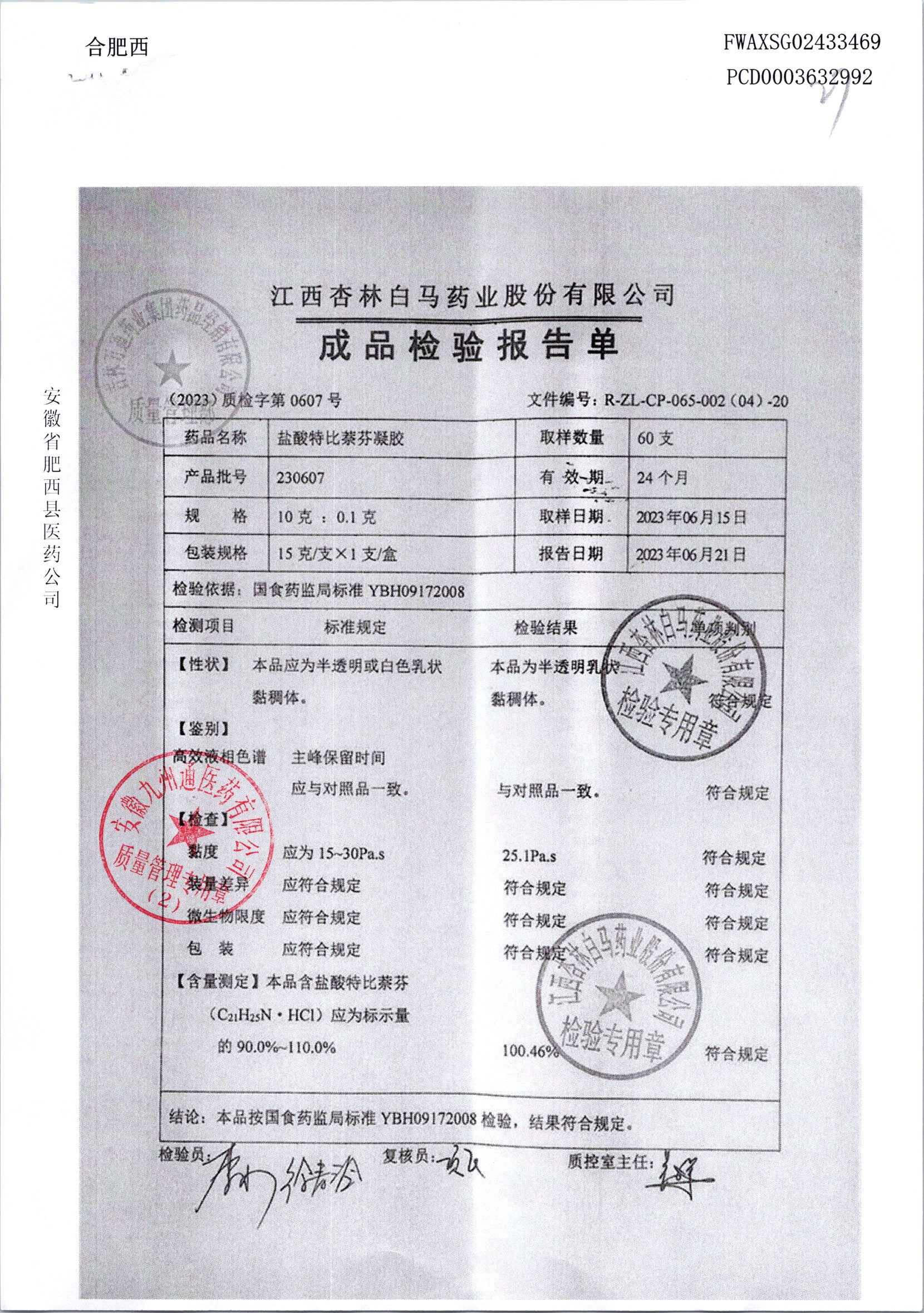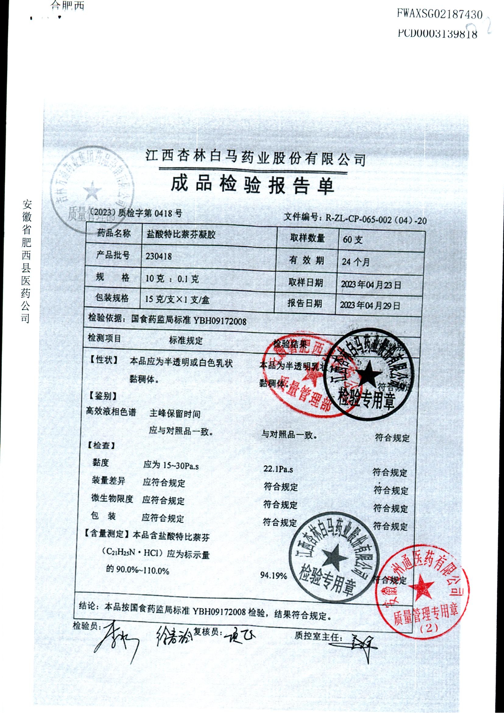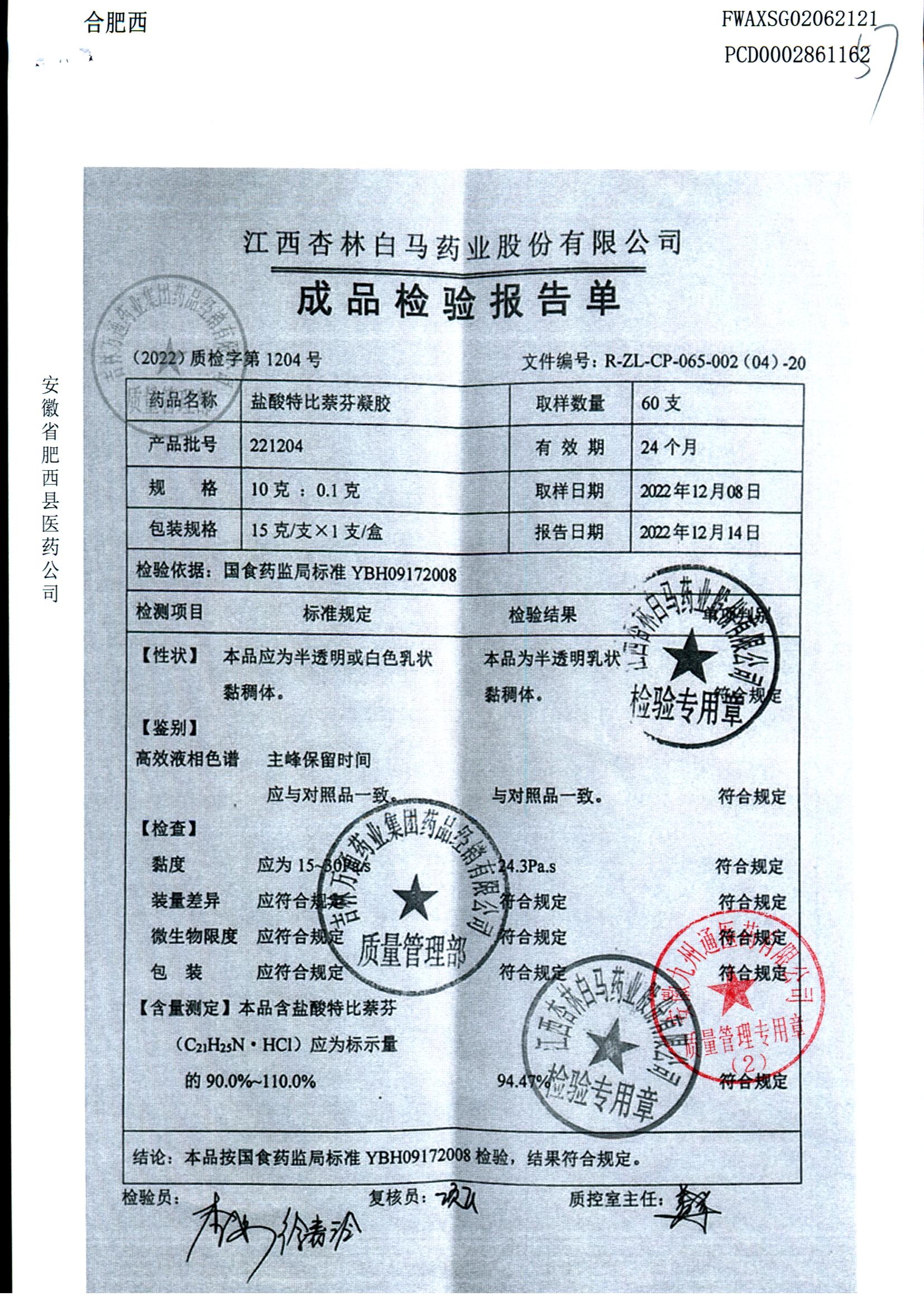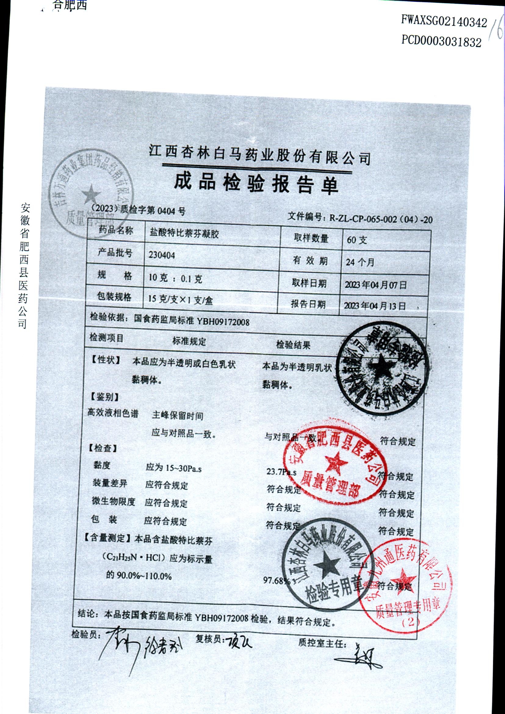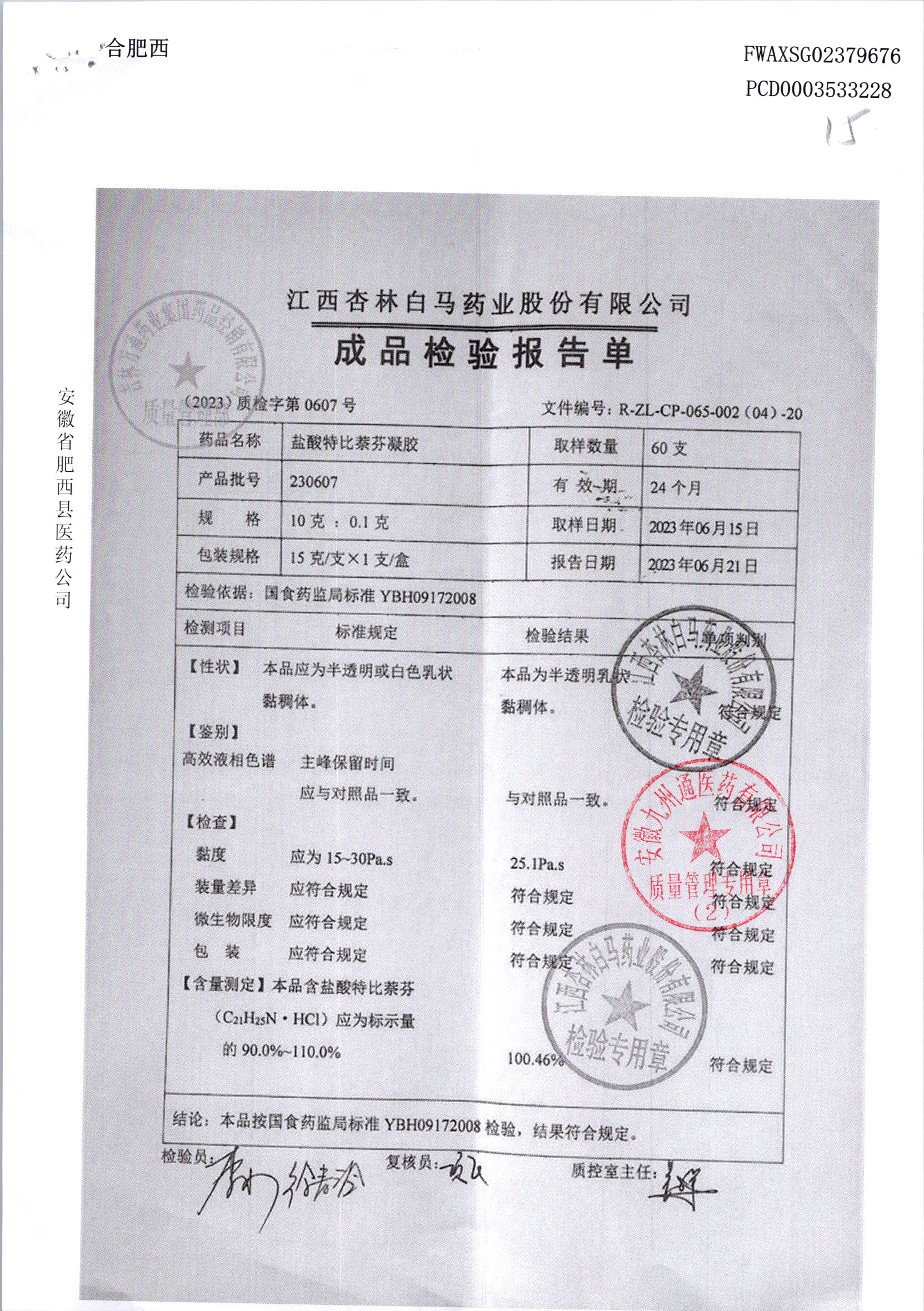 | 盐酸特比萘芬凝胶 | 15g( 10克:0.1克 ) | 230404 | 查看详情 |
