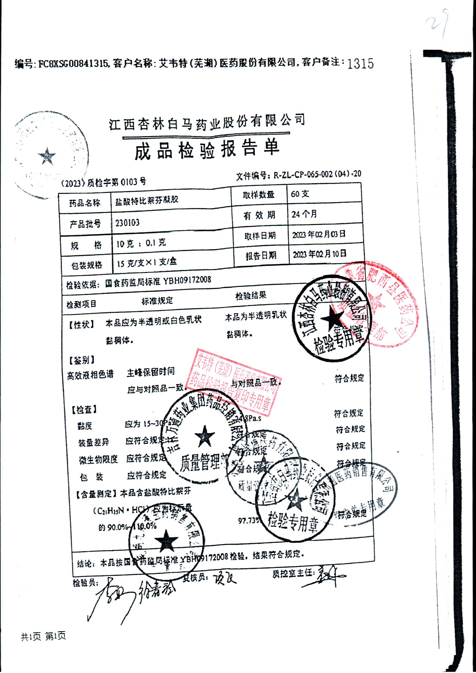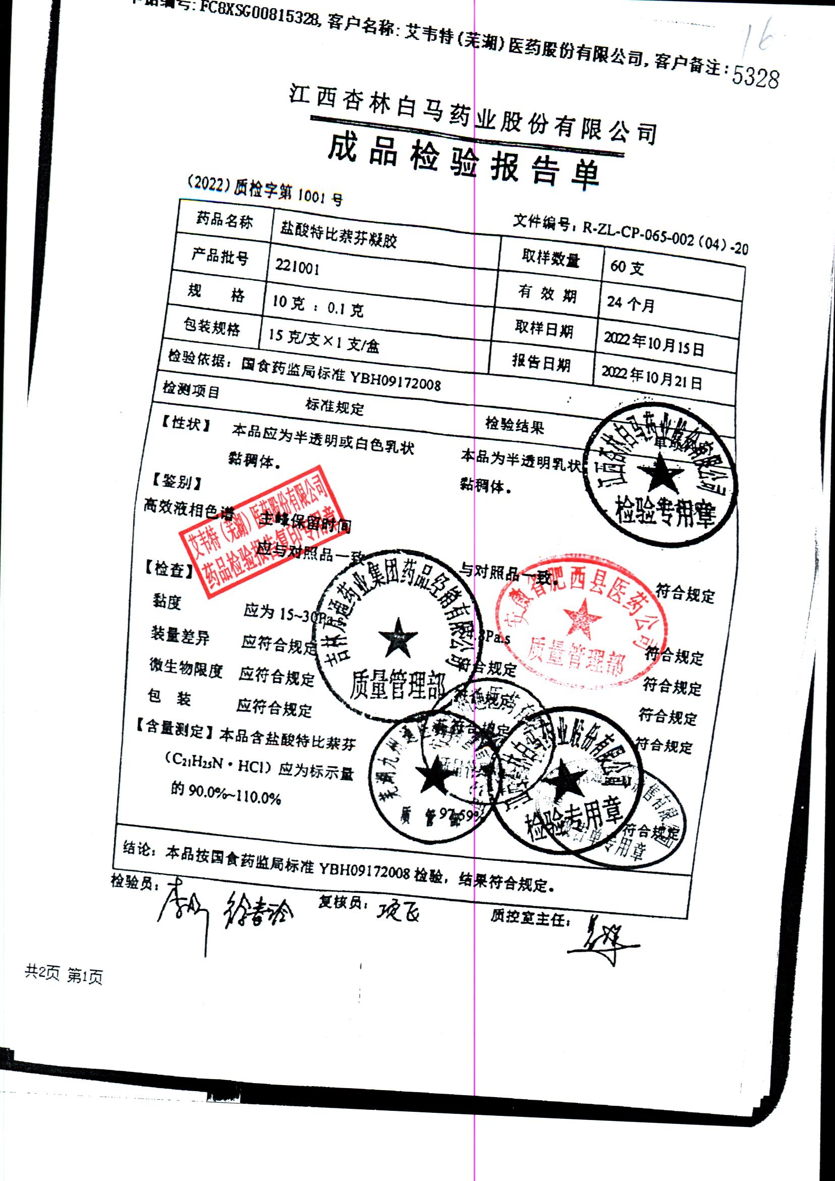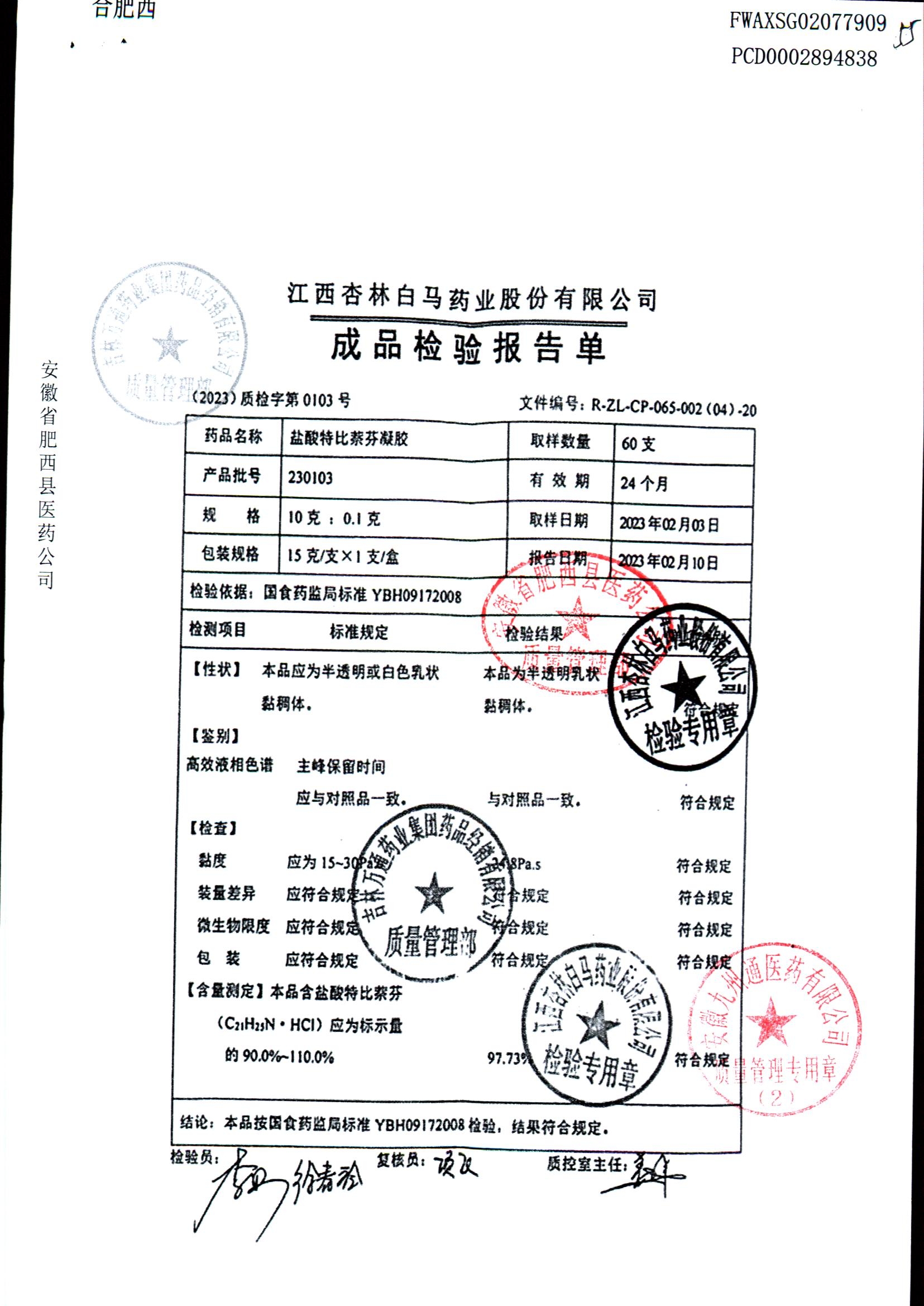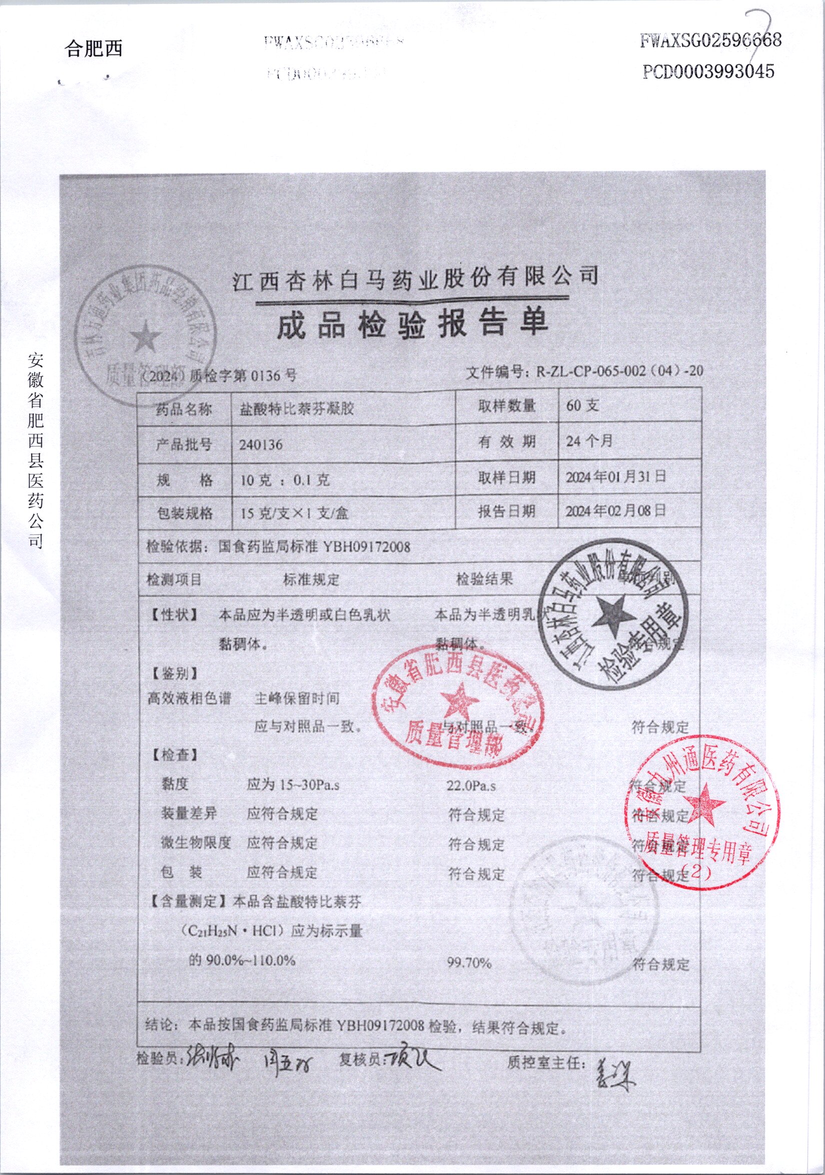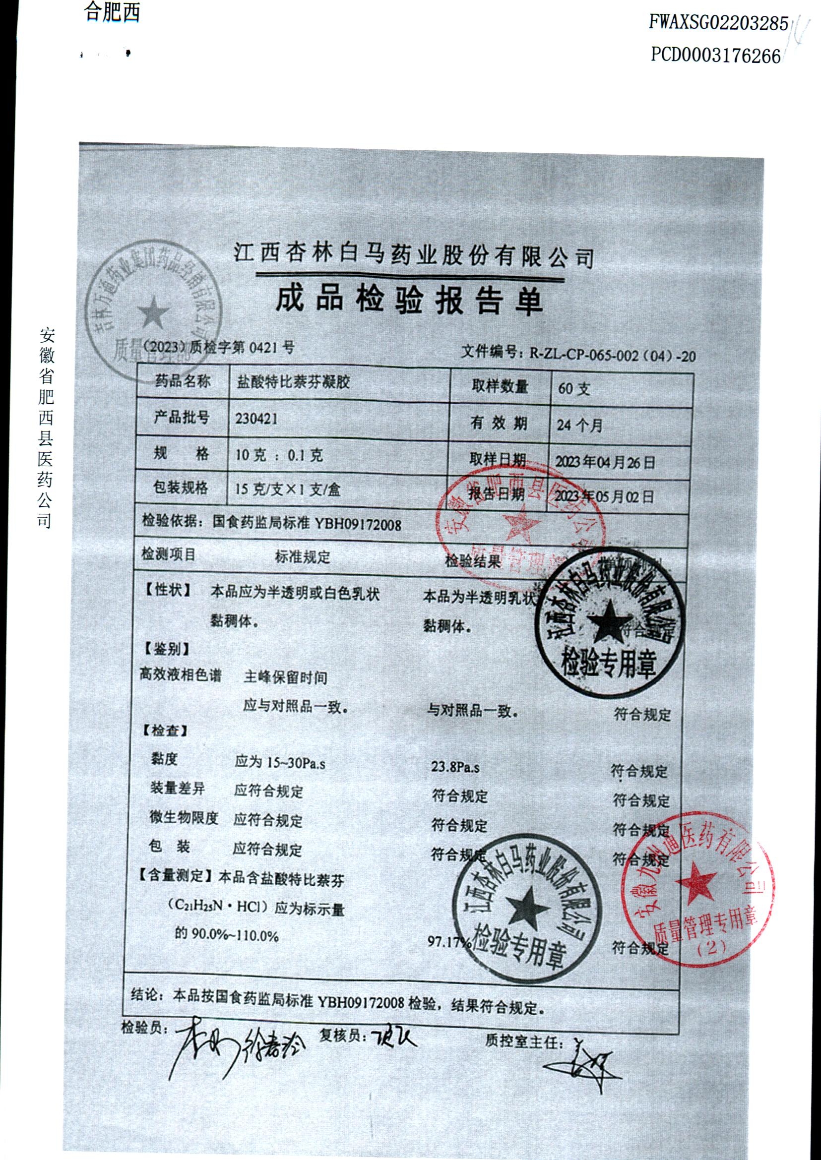 | 盐酸特比萘芬凝胶 | 15g( 10克:0.1克 ) | 230404 | 查看详情 |