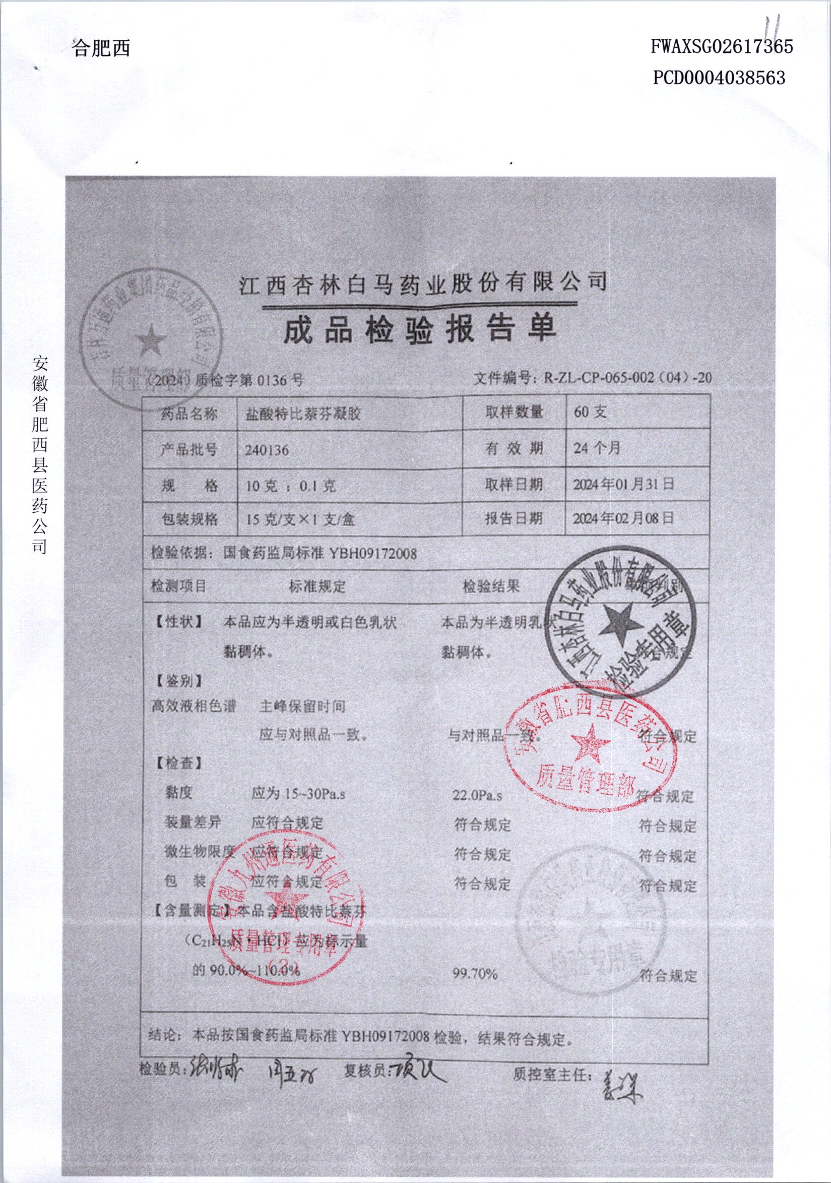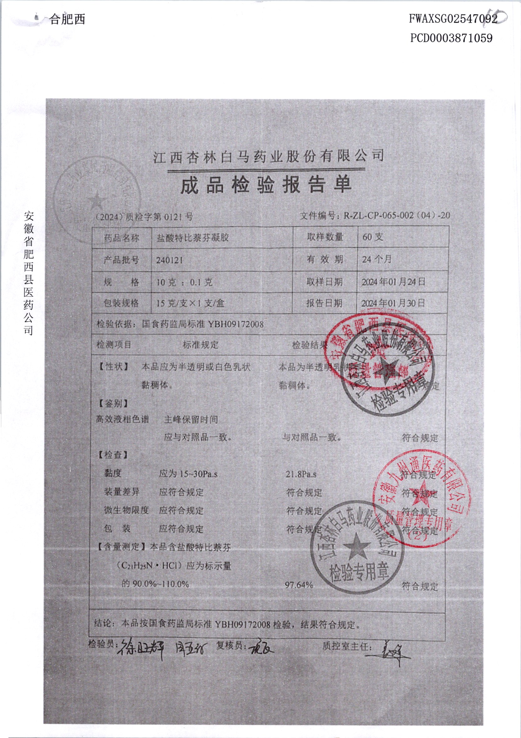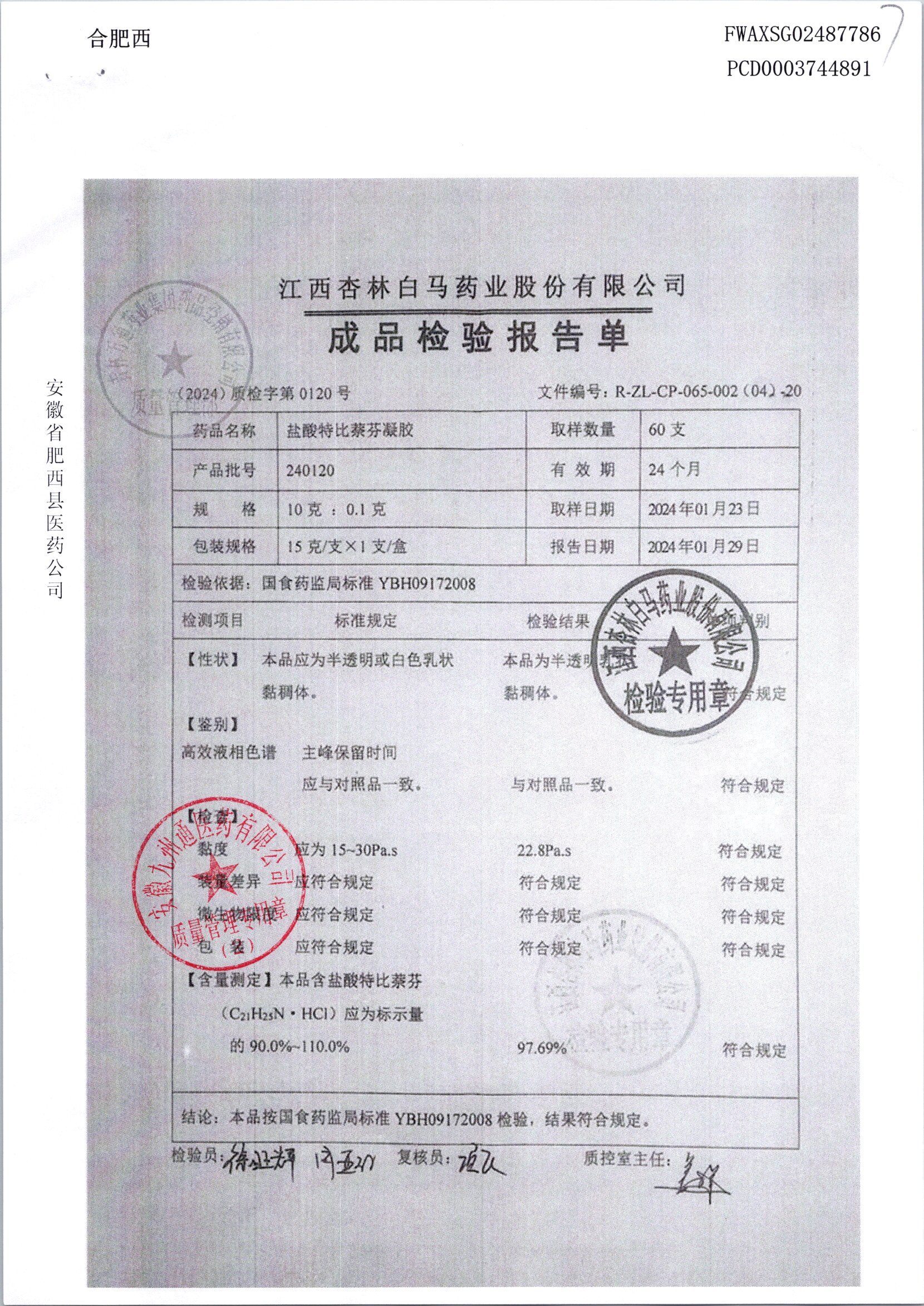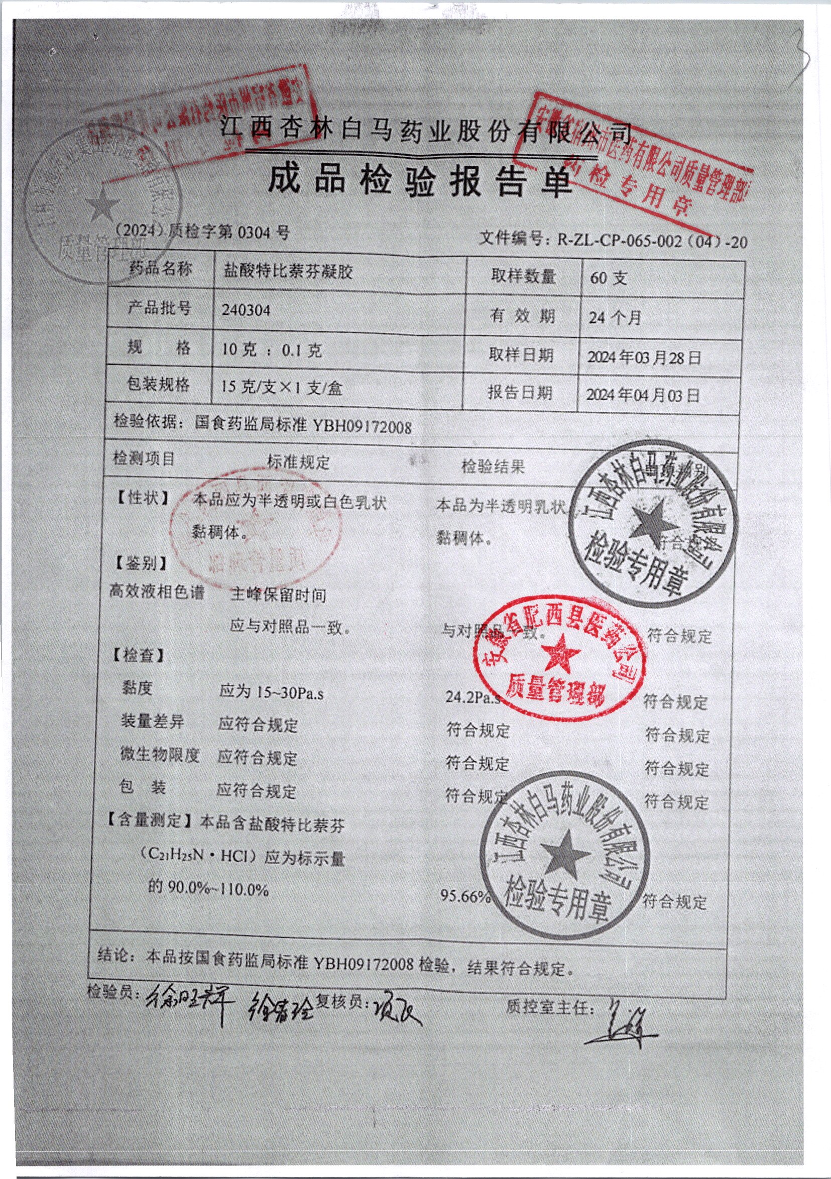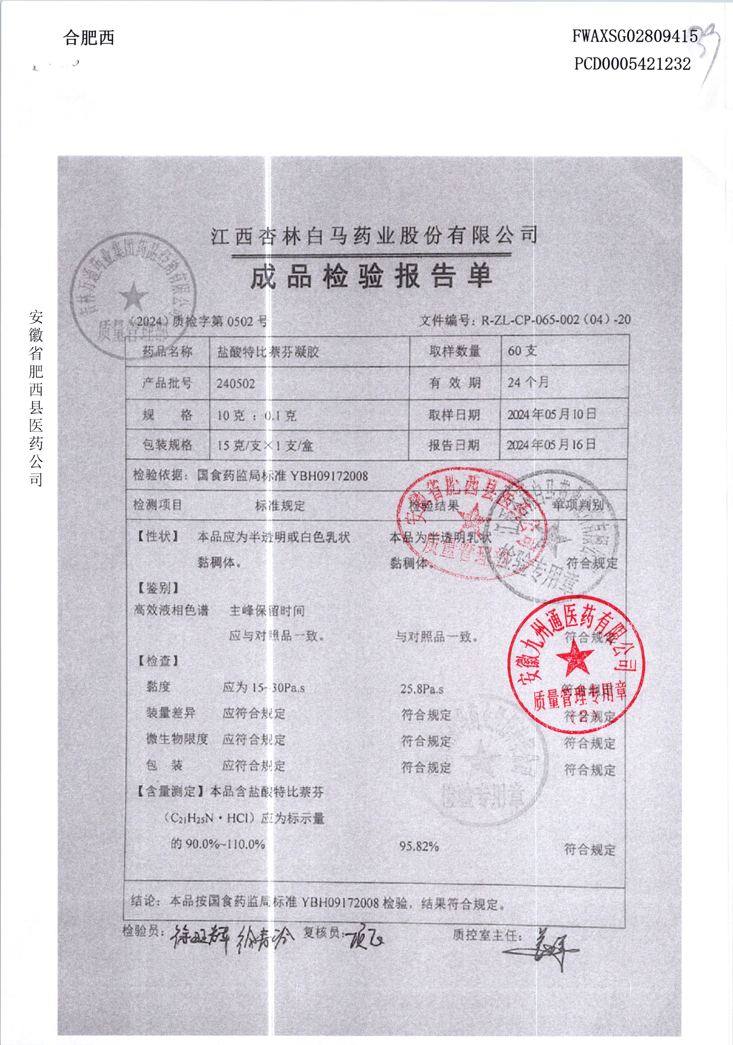 | 盐酸特比萘芬凝胶 | 15g( 10克:0.1克 ) | 240304 | 查看详情 |