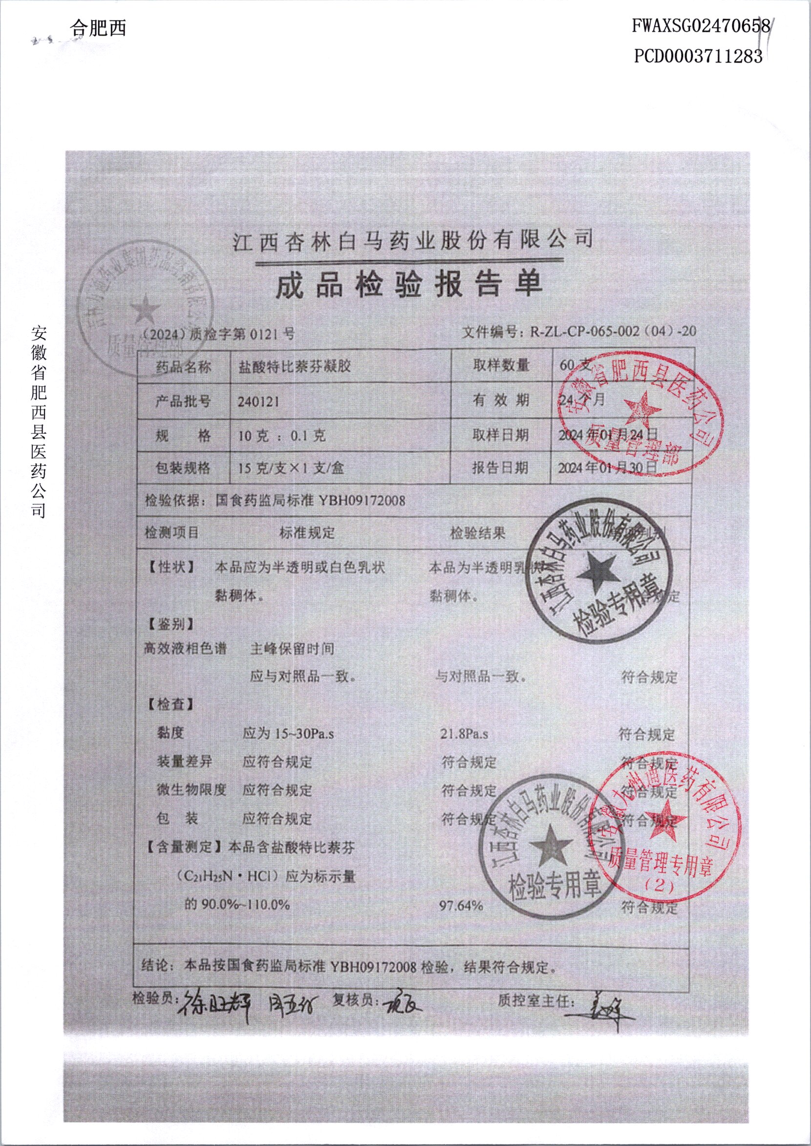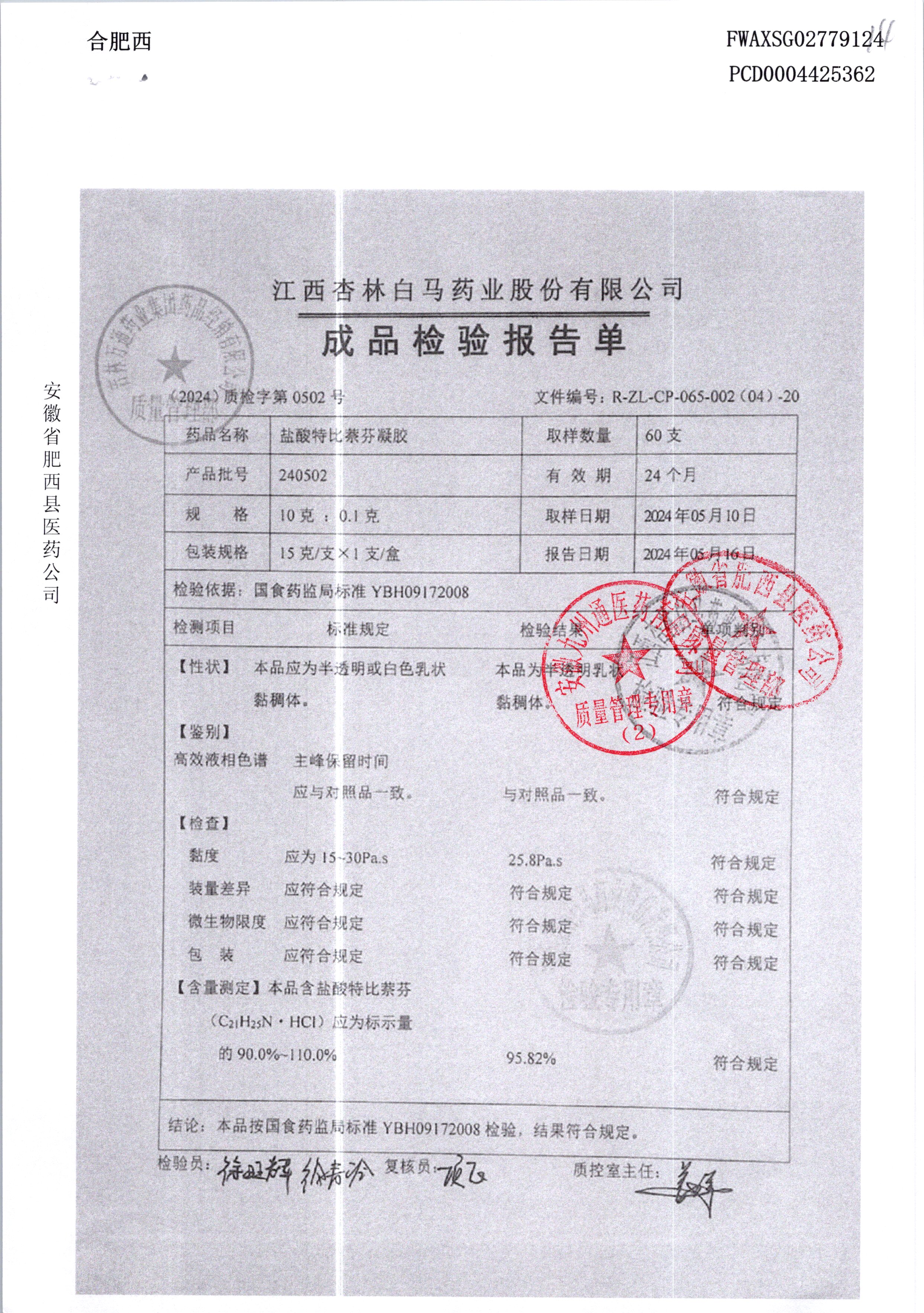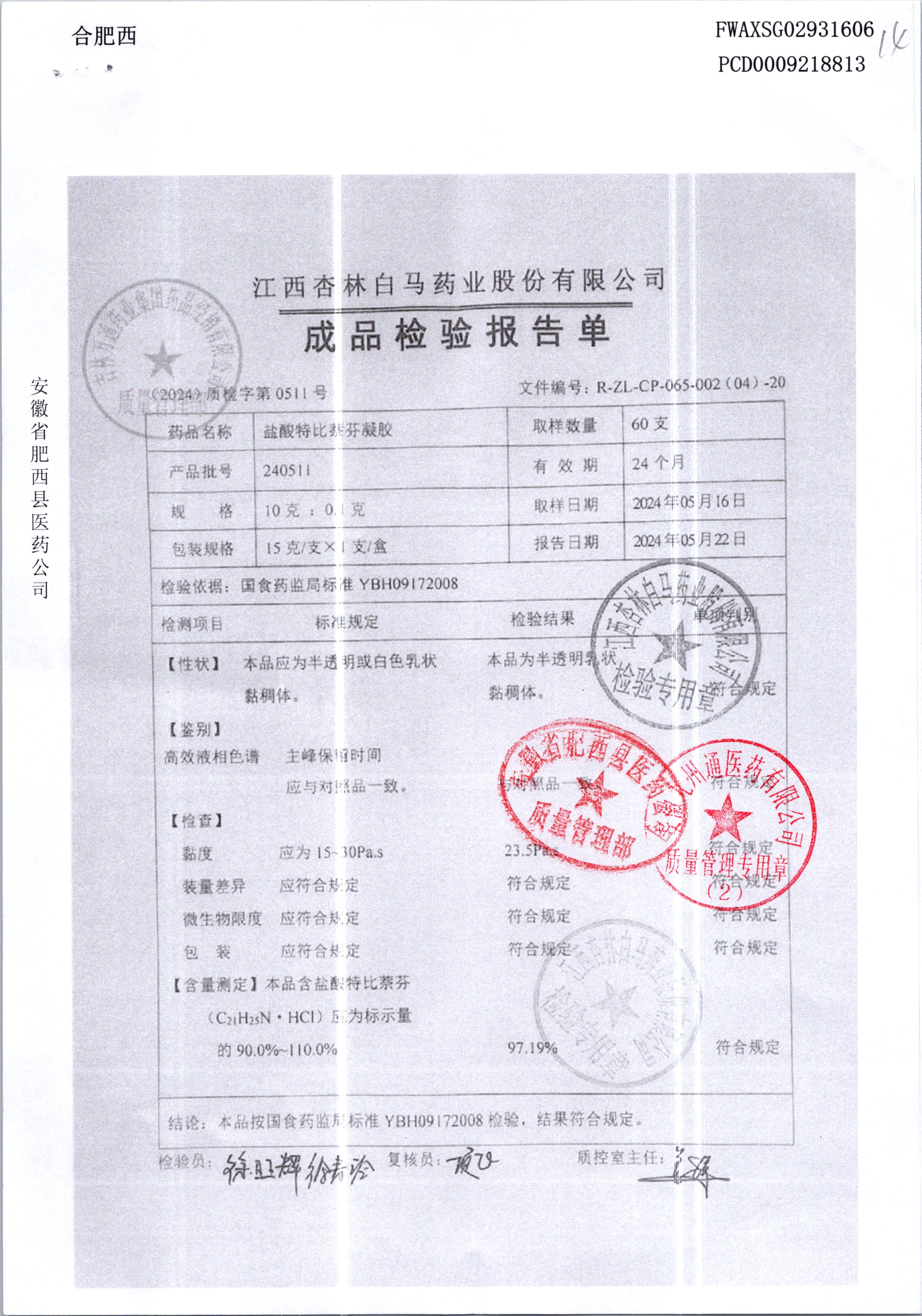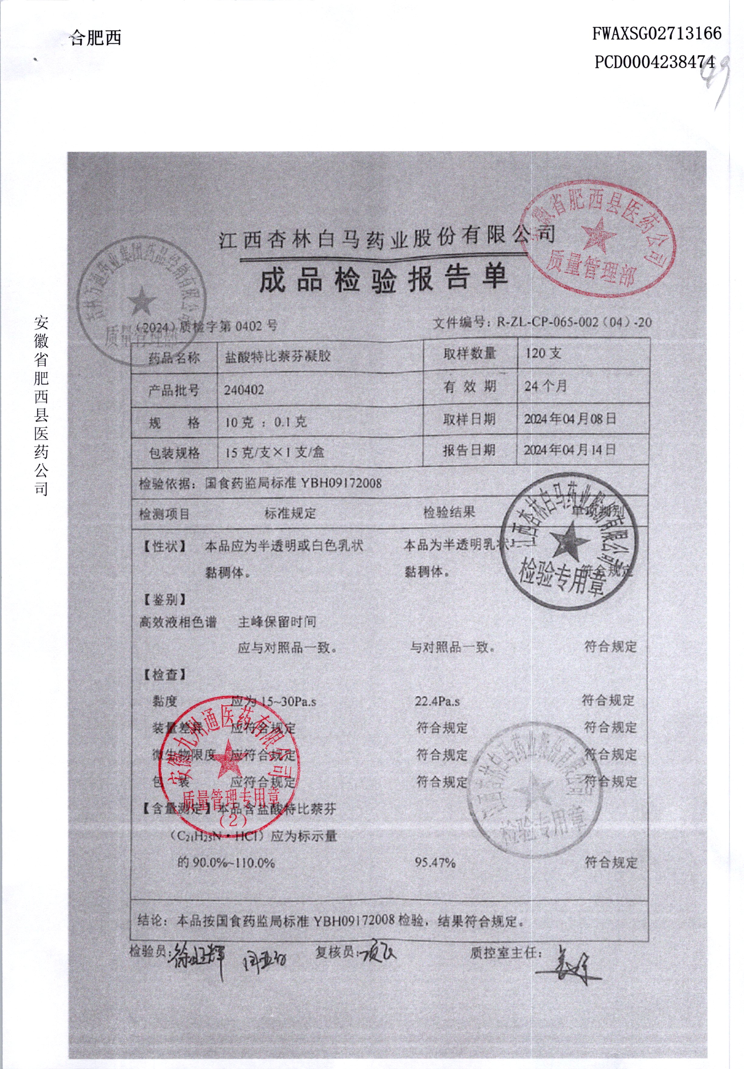 | 盐酸特比萘芬凝胶 | 15g( 10克:0.1克 ) | 240304 | 查看详情 |