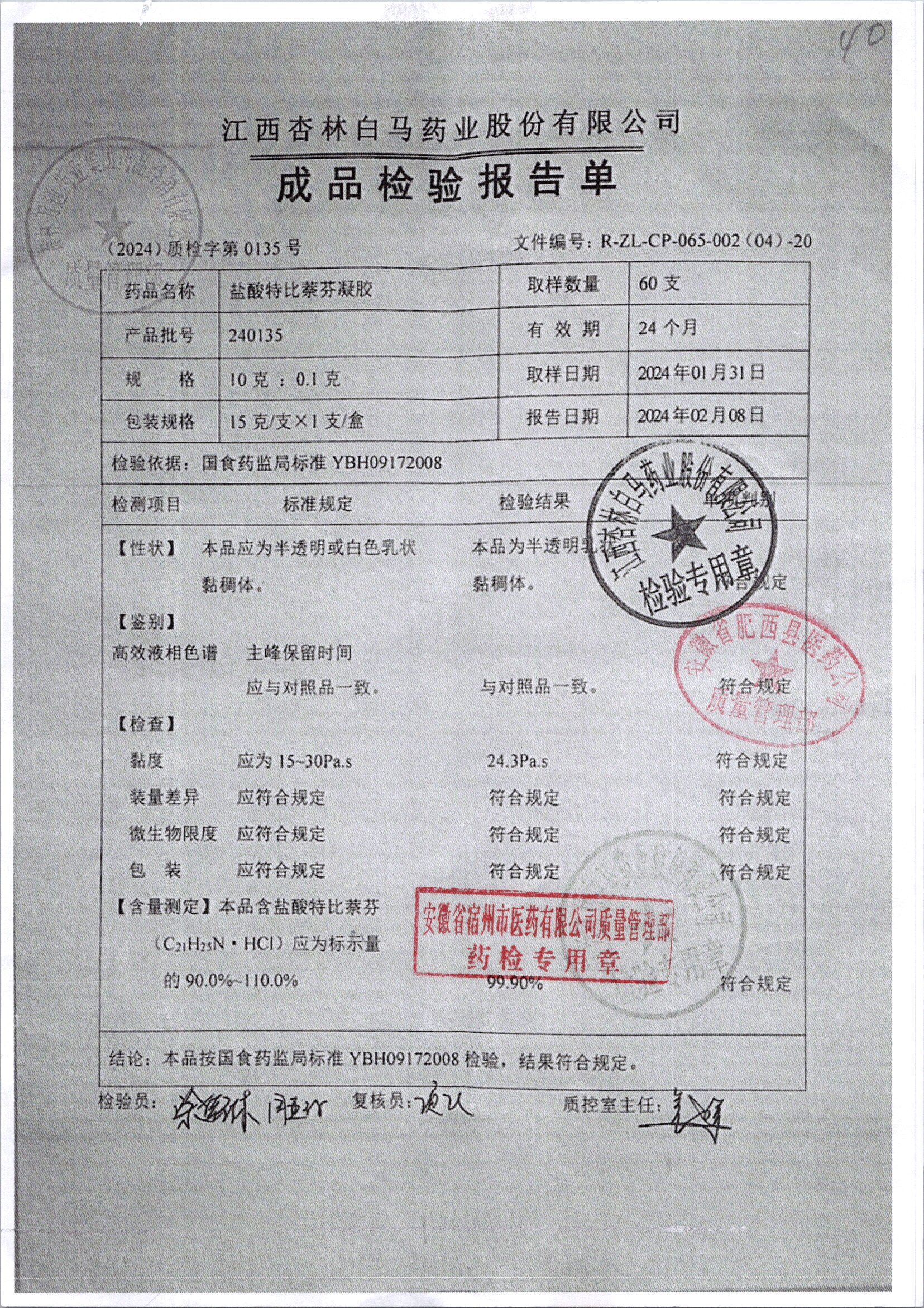 | 盐酸特比萘芬凝胶 | 15g( 10克:0.1克 ) | 240402 | 查看详情 |
