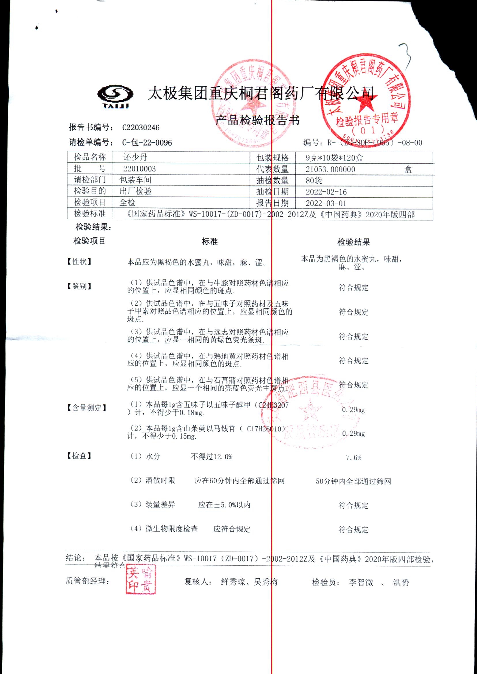 | 还少丹 | 9克/袋*10袋(每20丸重1g) | 22010003 | 查看详情 |
