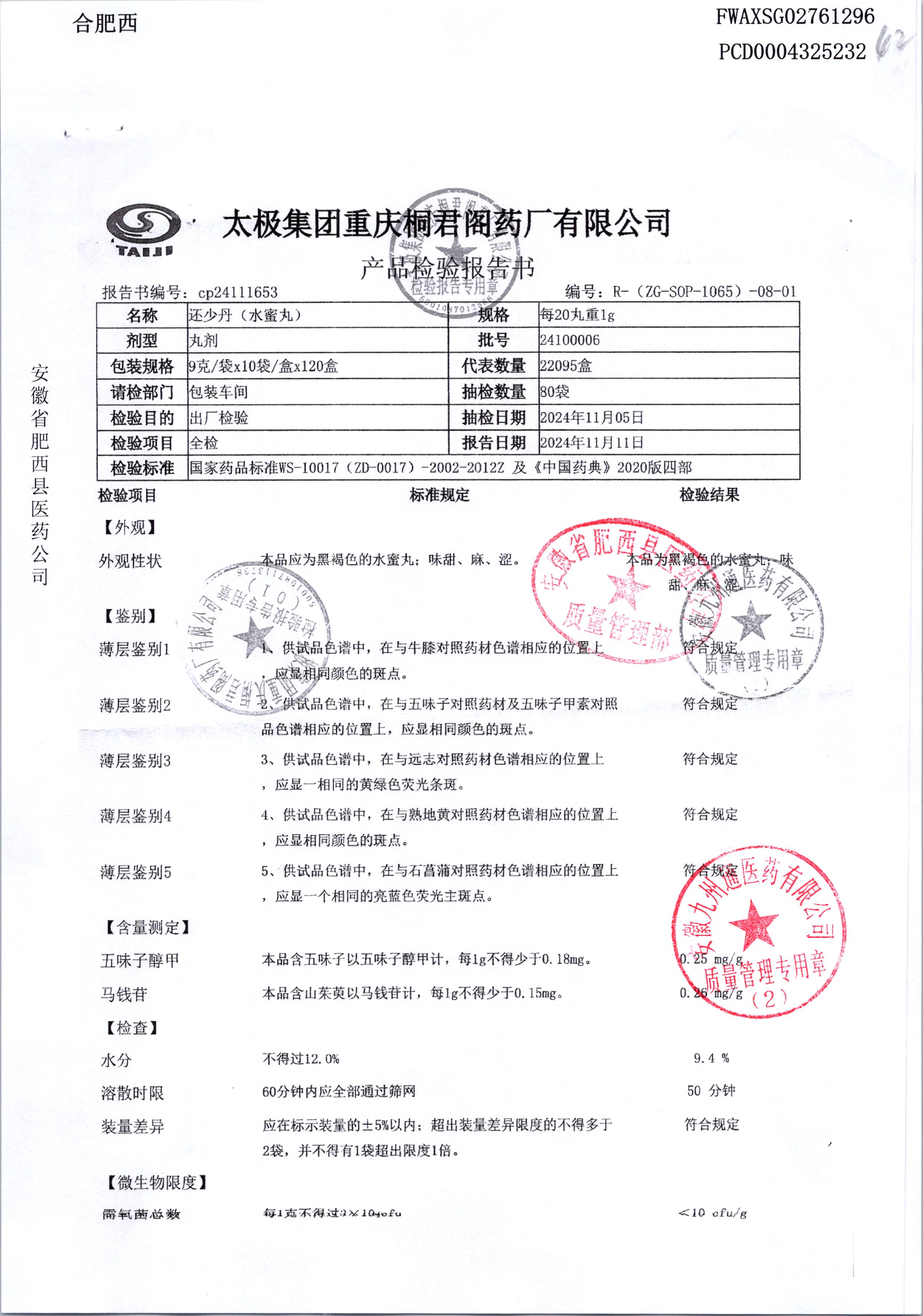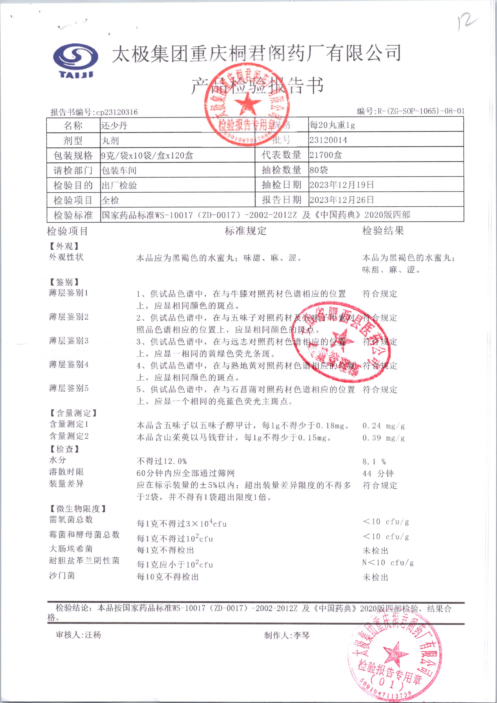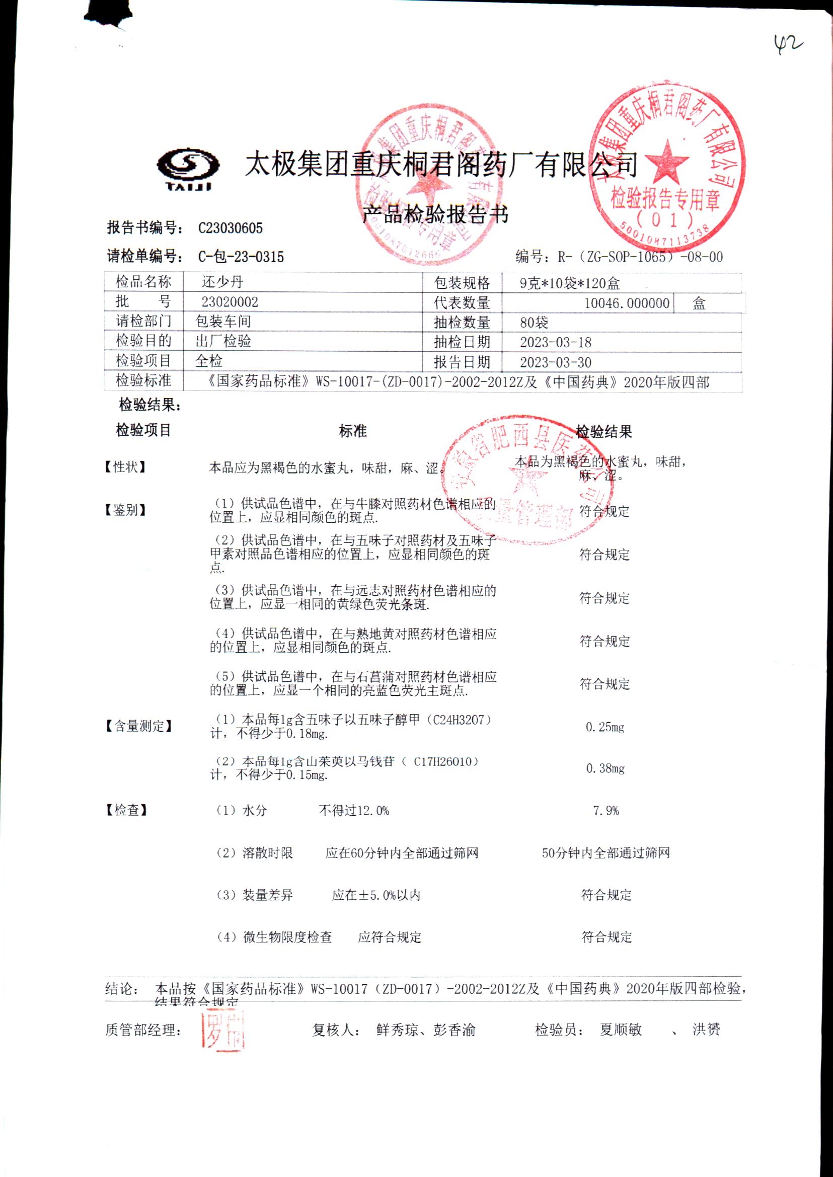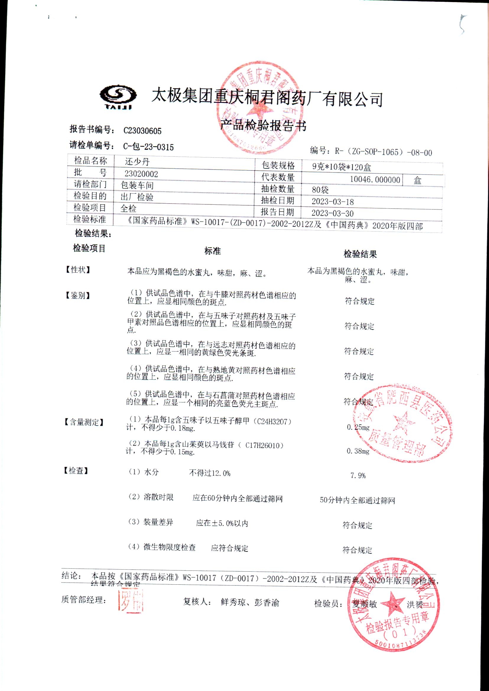 | 还少丹 | 9克/袋*10袋(每20丸重1g) | 23120008/1 | 查看详情 |