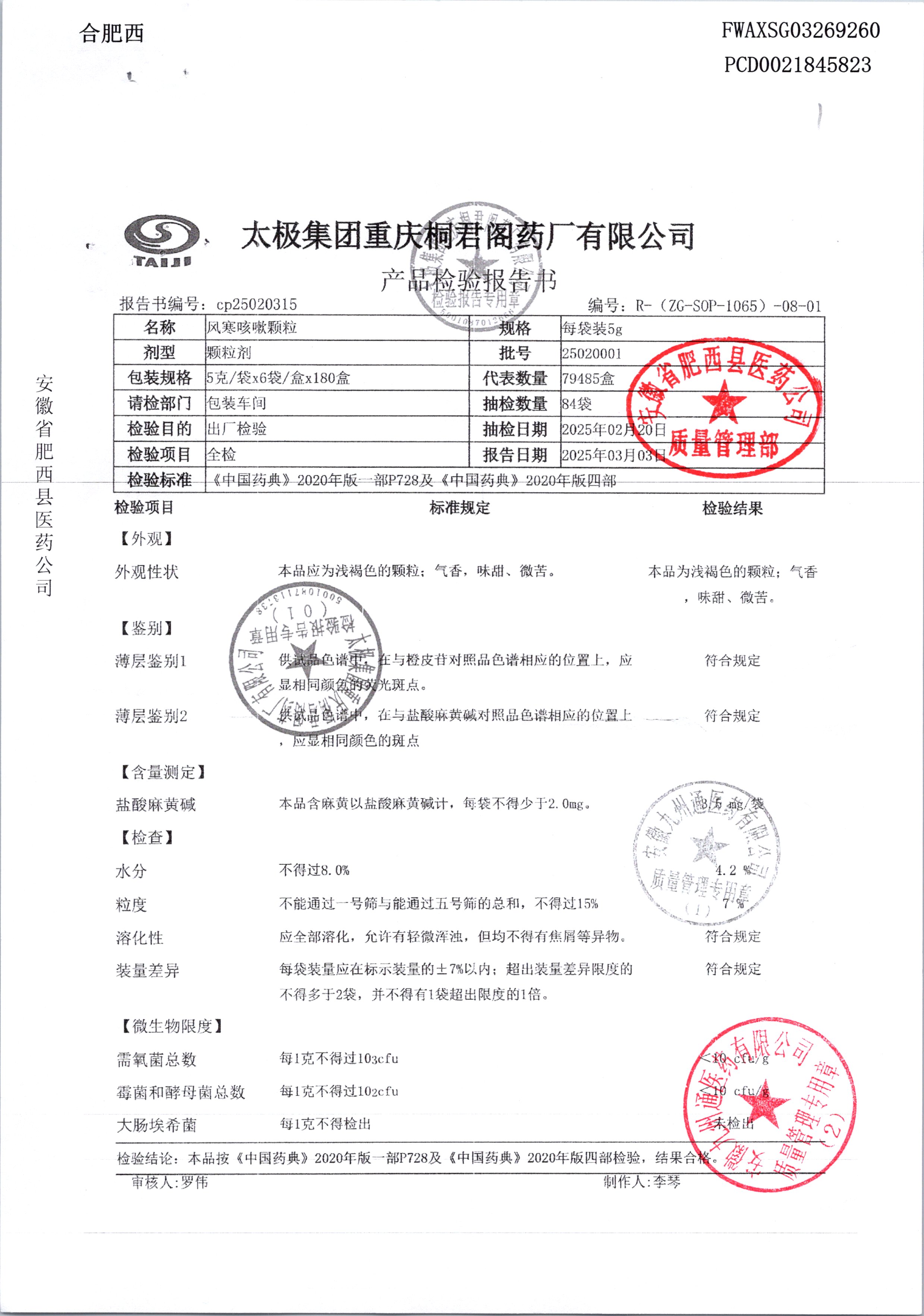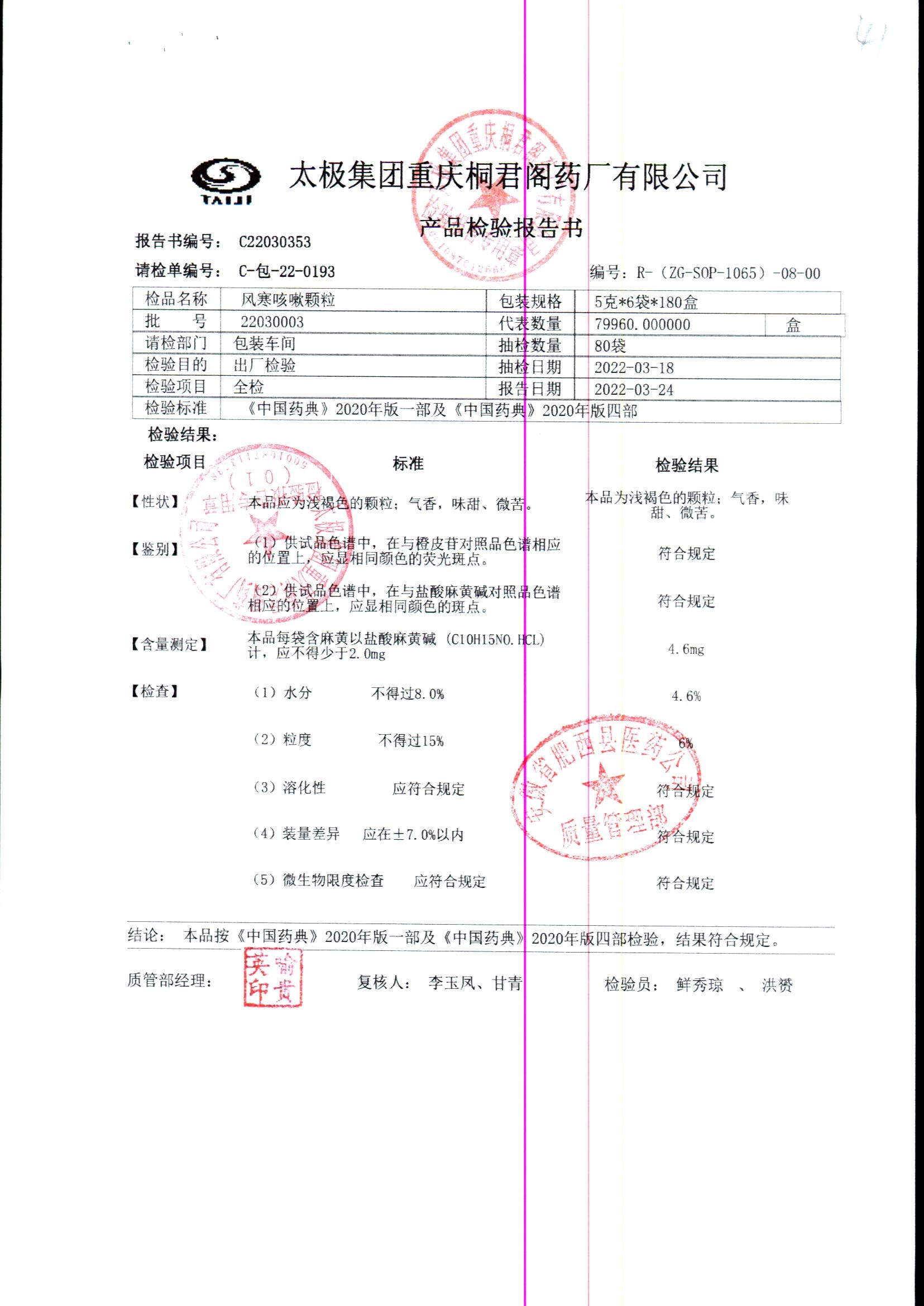 | 风寒咳嗽颗粒 | 5g/袋*6袋 | 25020001 | 查看详情 |